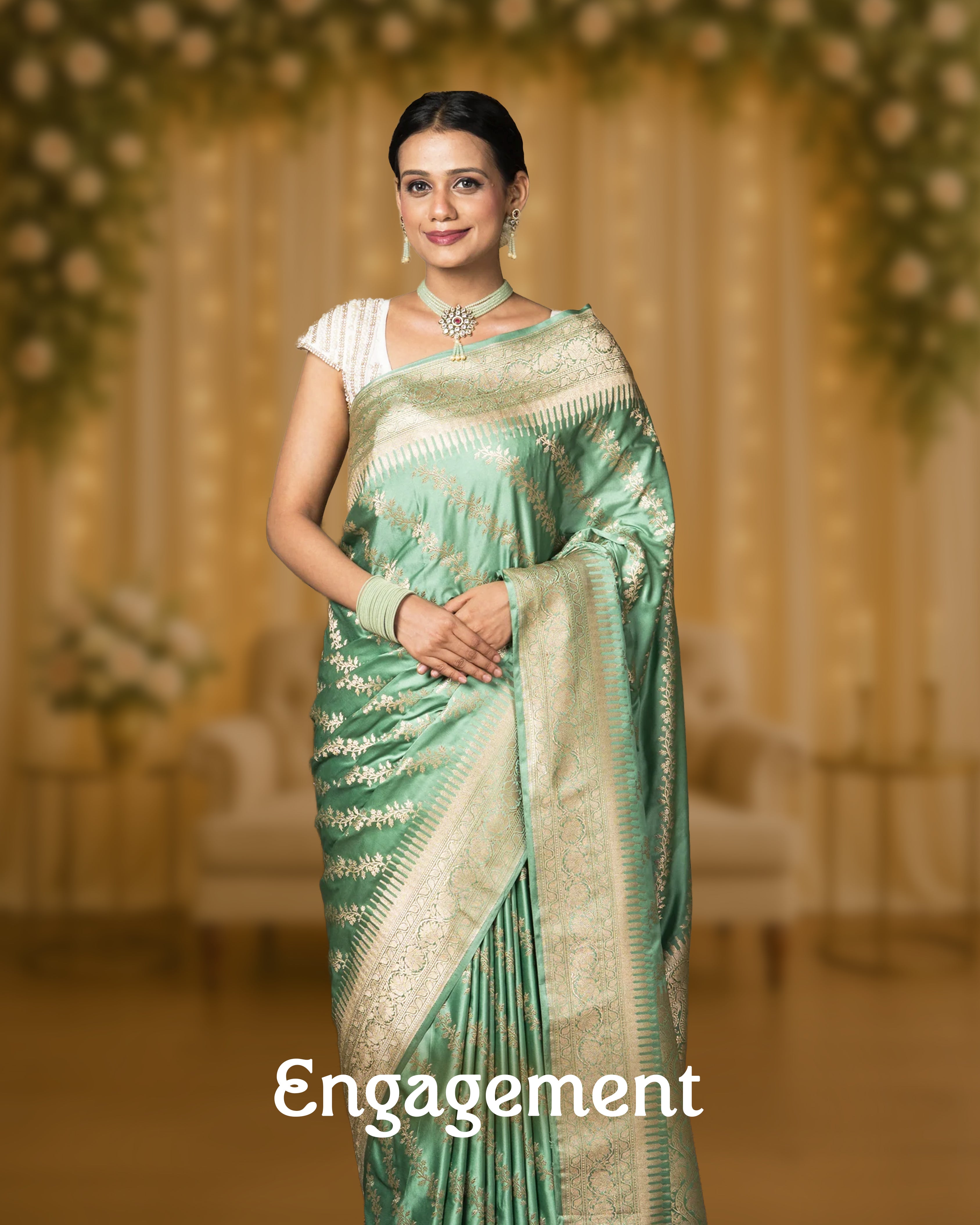 Sea Green Soft Silk Saree with Gold and Silver Zari Floral motifs