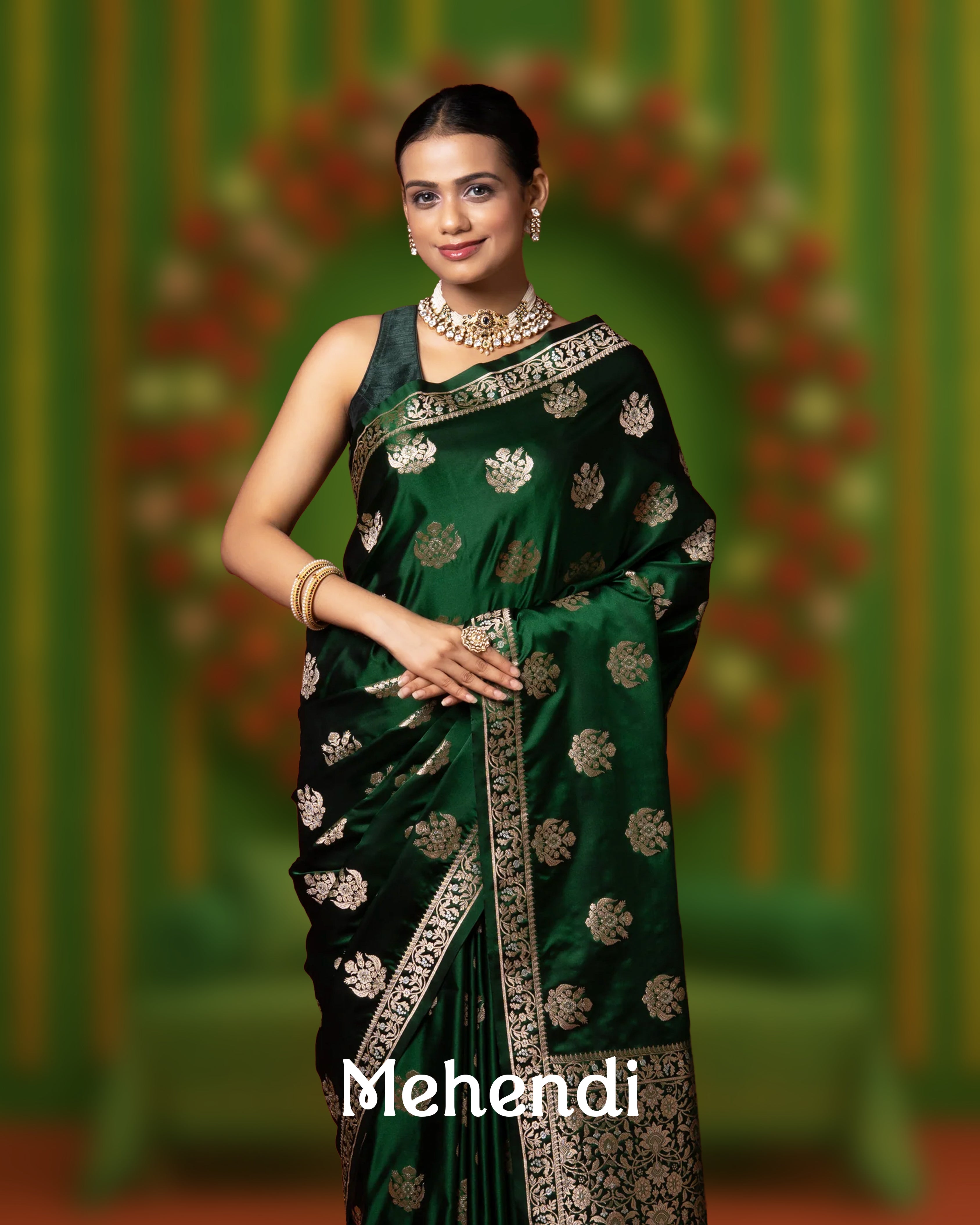 Forest Green Soft Silk Saree with Gold and Silver Zari Floral motifs
