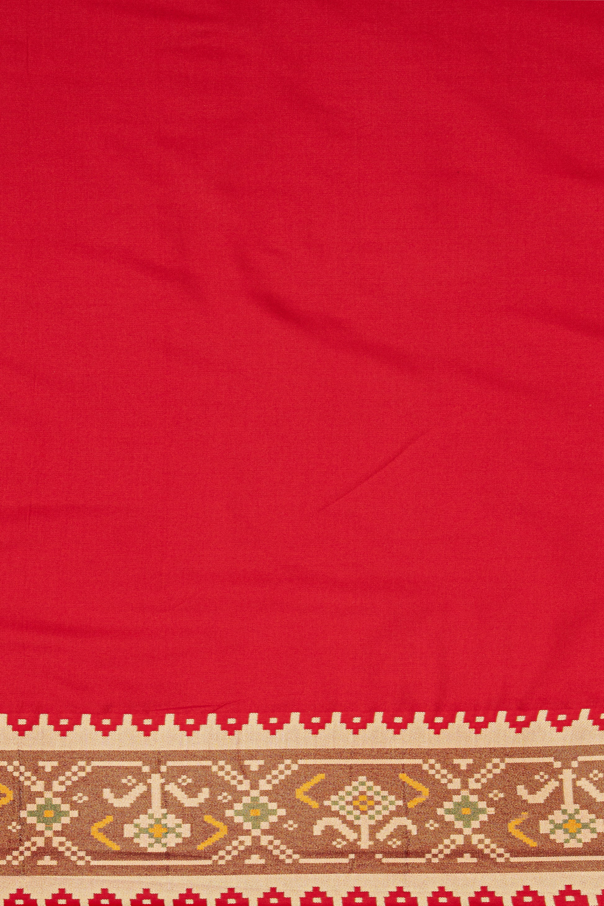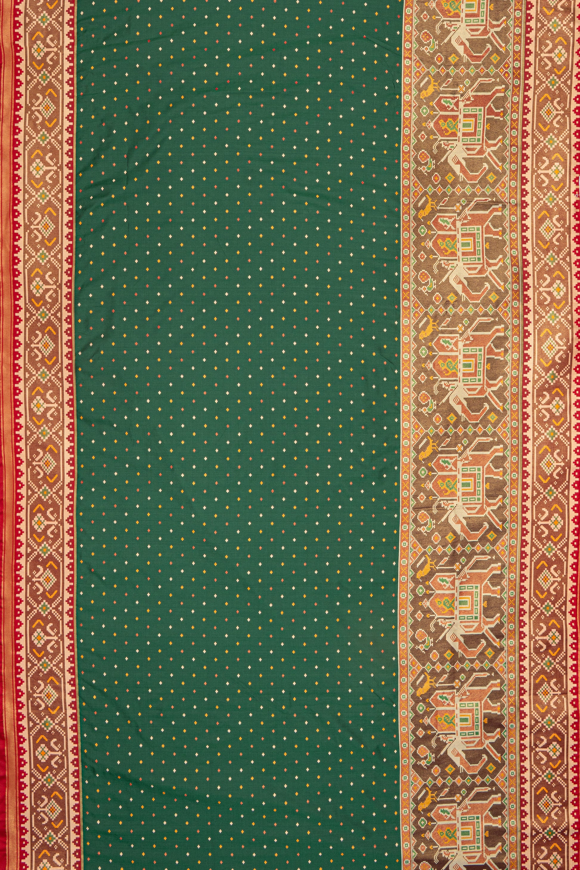 A refined Bottle Green Patola crafted from premium Art Silk - Katan Silk. the lustrous weave and balanced structure deliver modern sophistication. Thoughtfully made for festive and puja and day-to-evening dressing. A sleek bun and bold bindi bring out its heritage appeal.