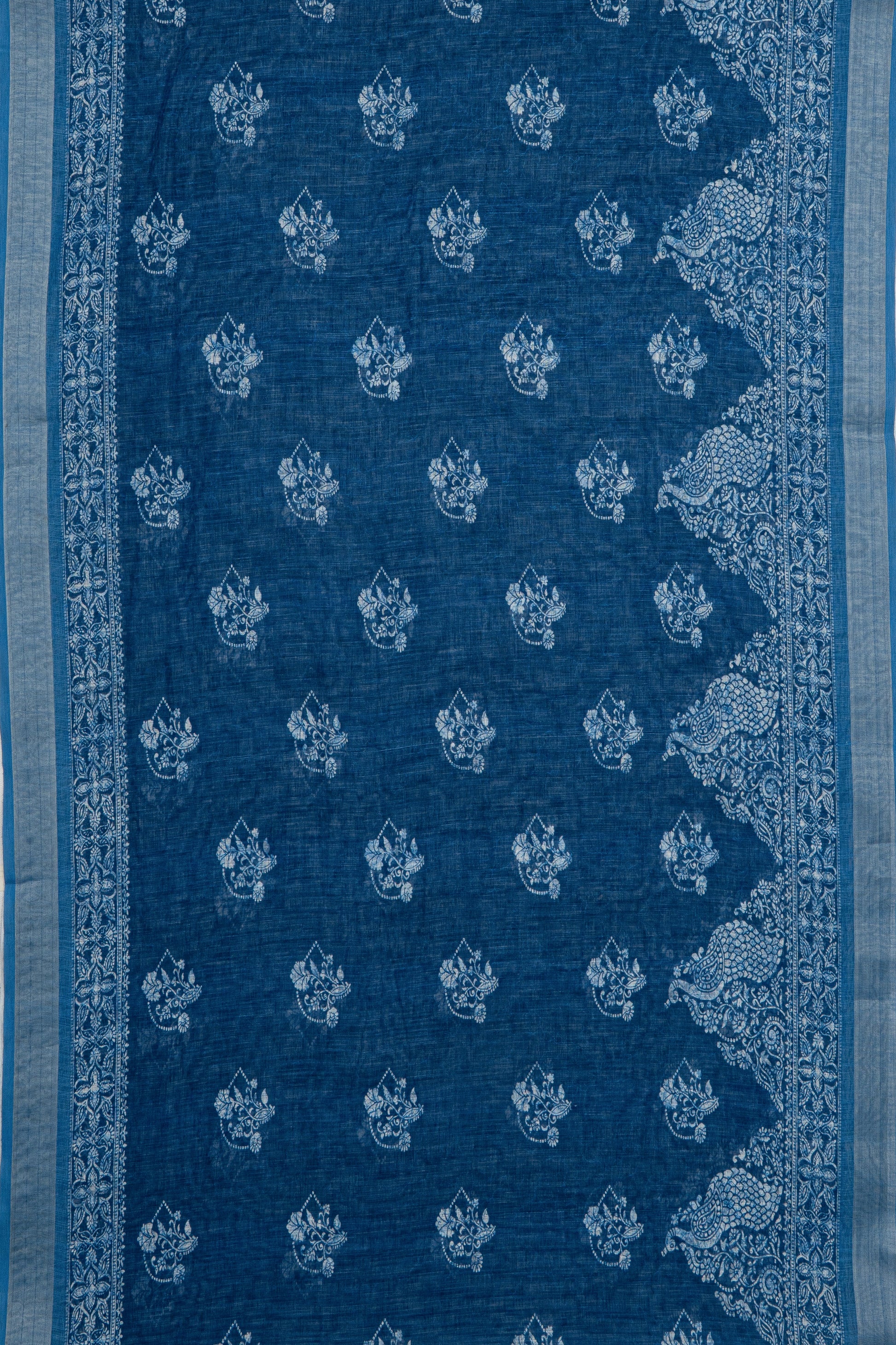 This Blue Hastakala Exclusive celebrates fine craftsmanship in Cotton. crafted to contour beautifully, it moves with ease through long celebrations. Ideal for festive occasions, receptions and festive evenings. Classic jhumkas and bangles add a timeless touch.