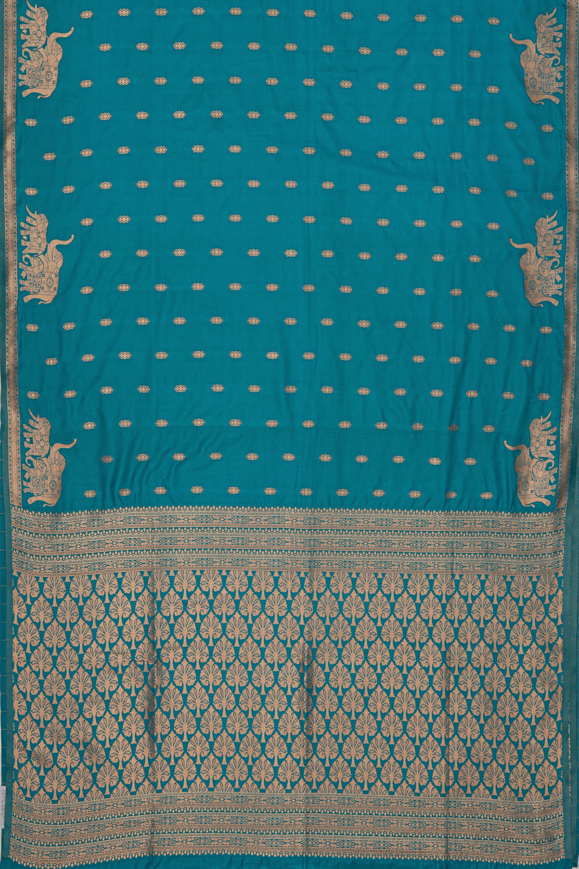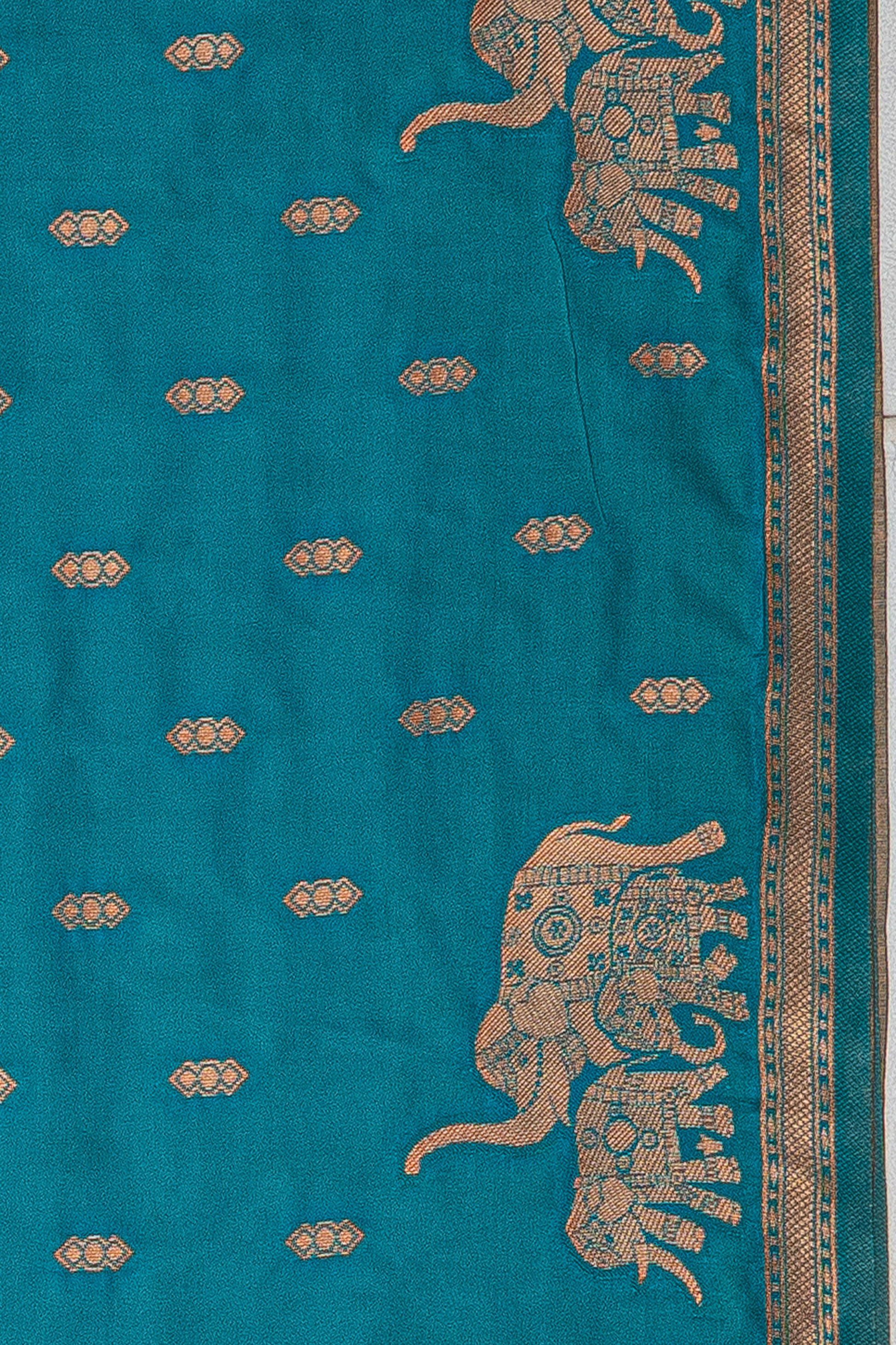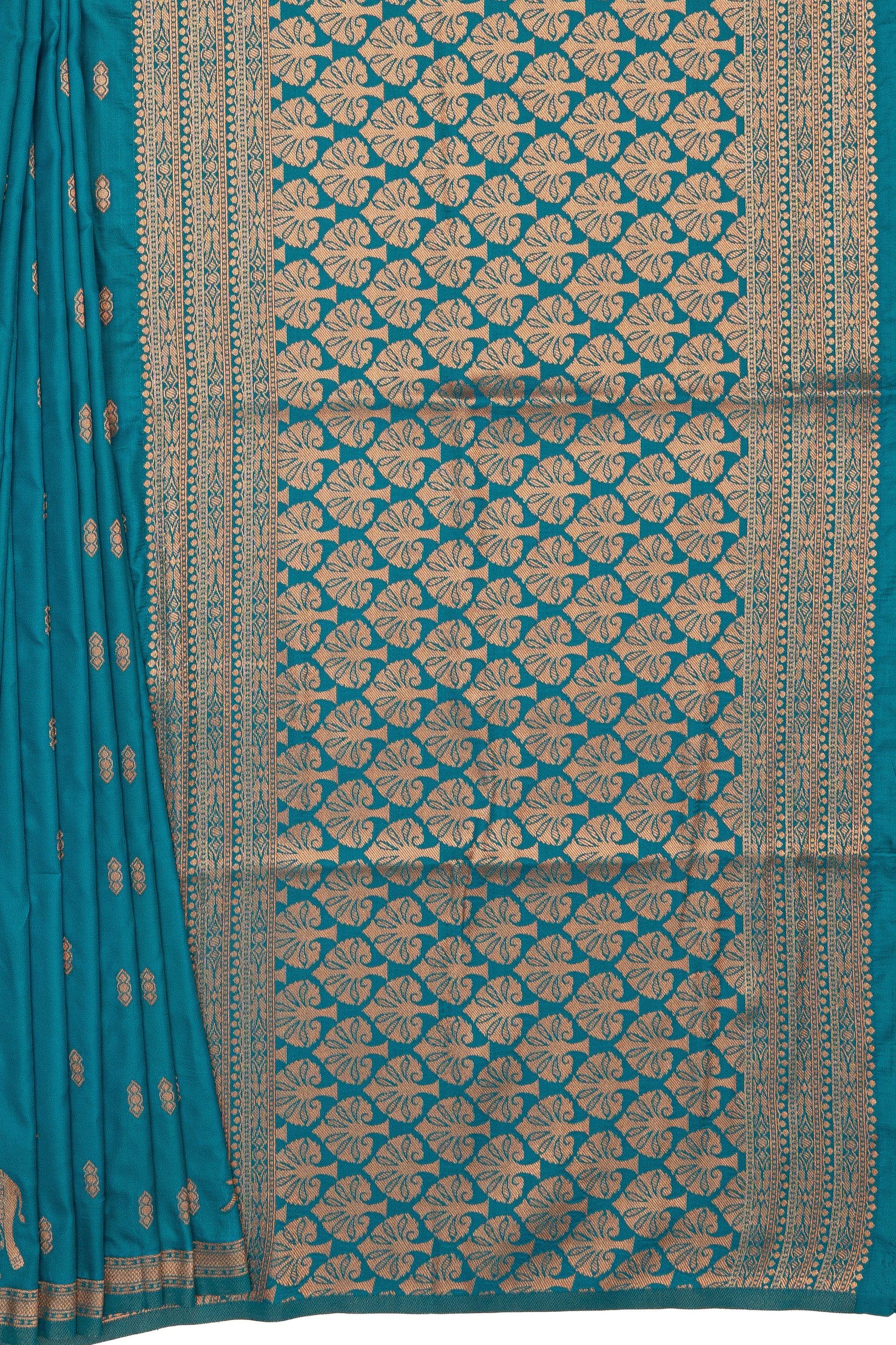 A graceful Sea Blue Banarasi showcasing the fluid fall of Semi Silk - Katan Silk. subtle motifs and a clean fall keep the look elevated and timeless. Made for party and festive, temple visits and cultural festivities. Style with antique gold accents for a regal finish.