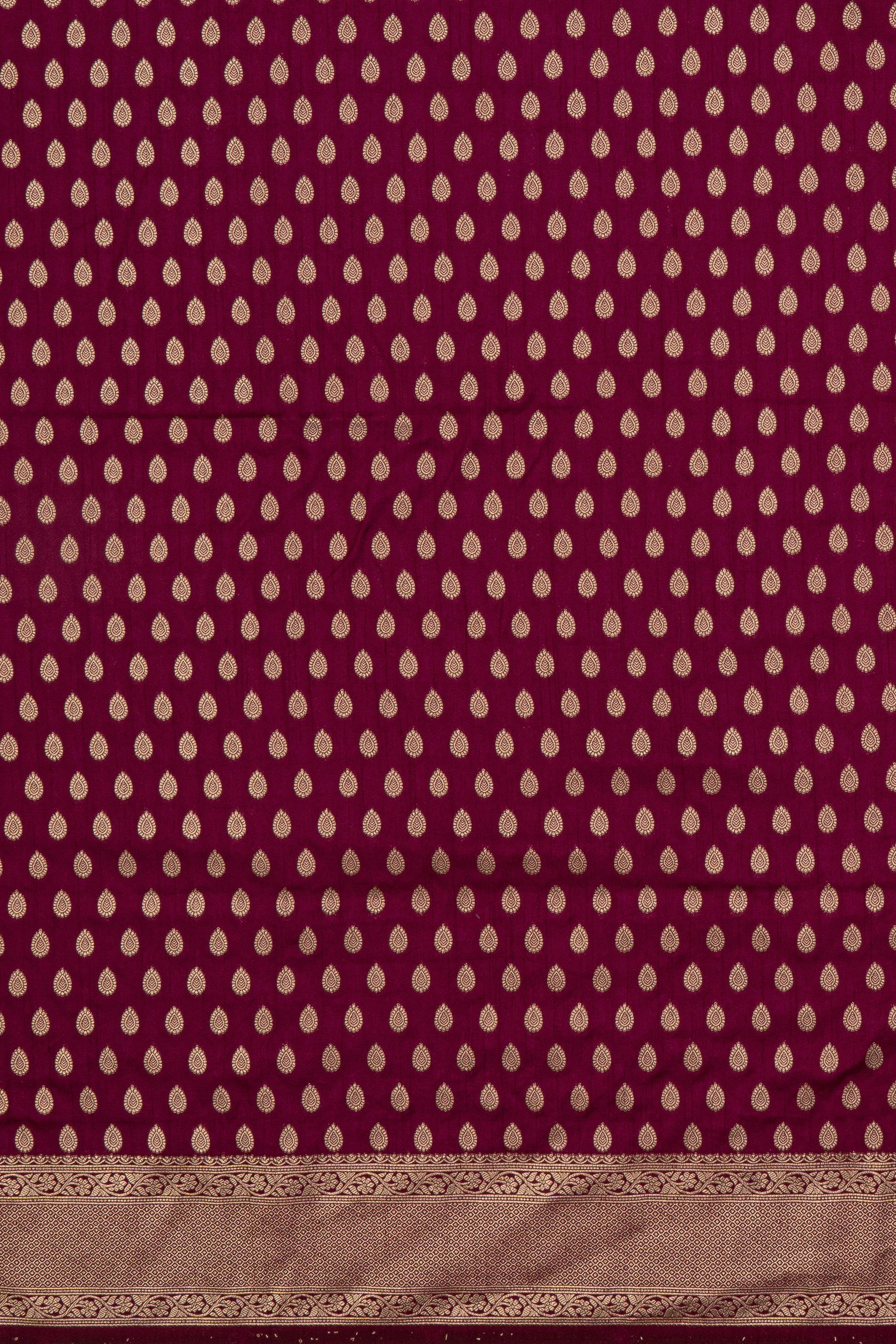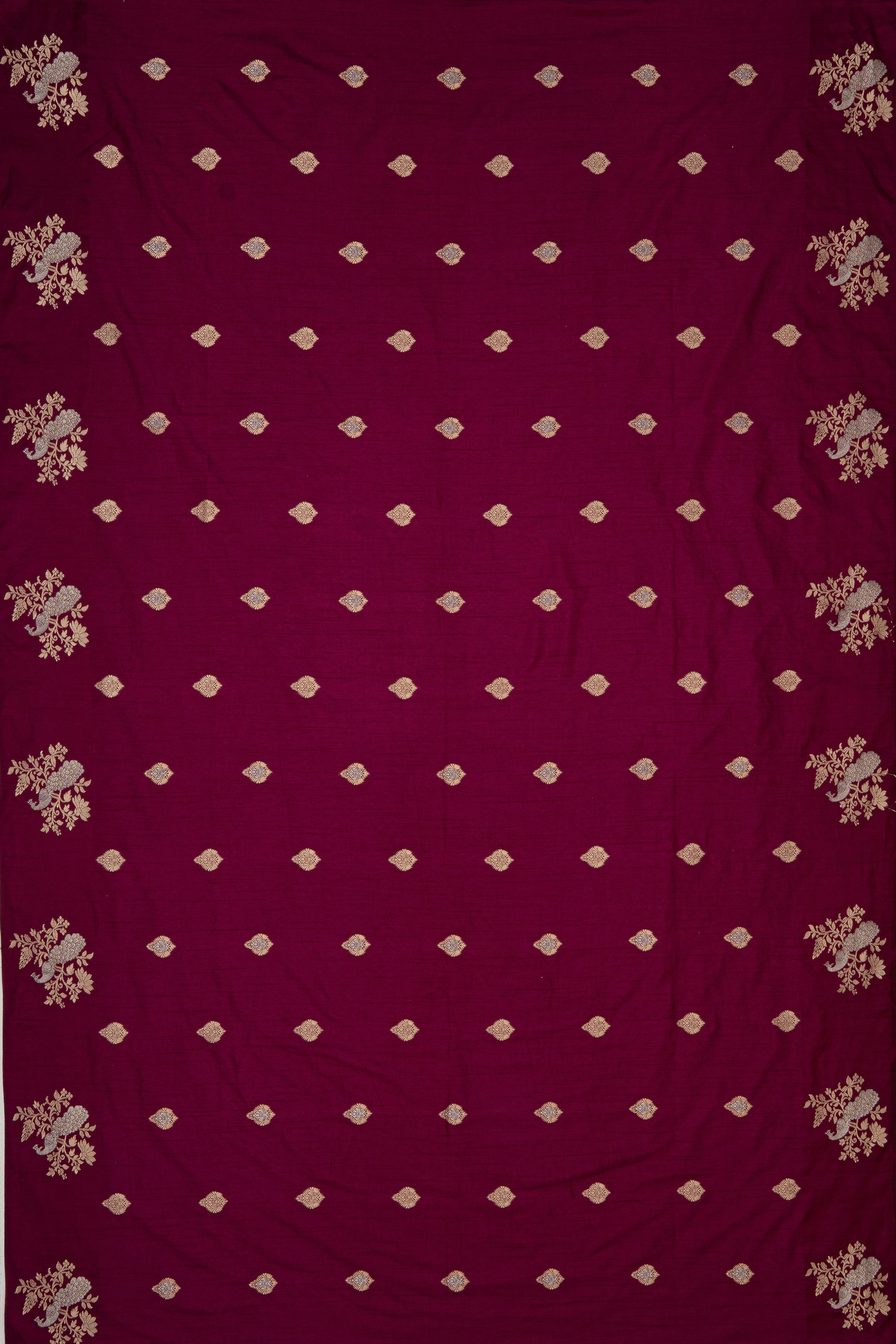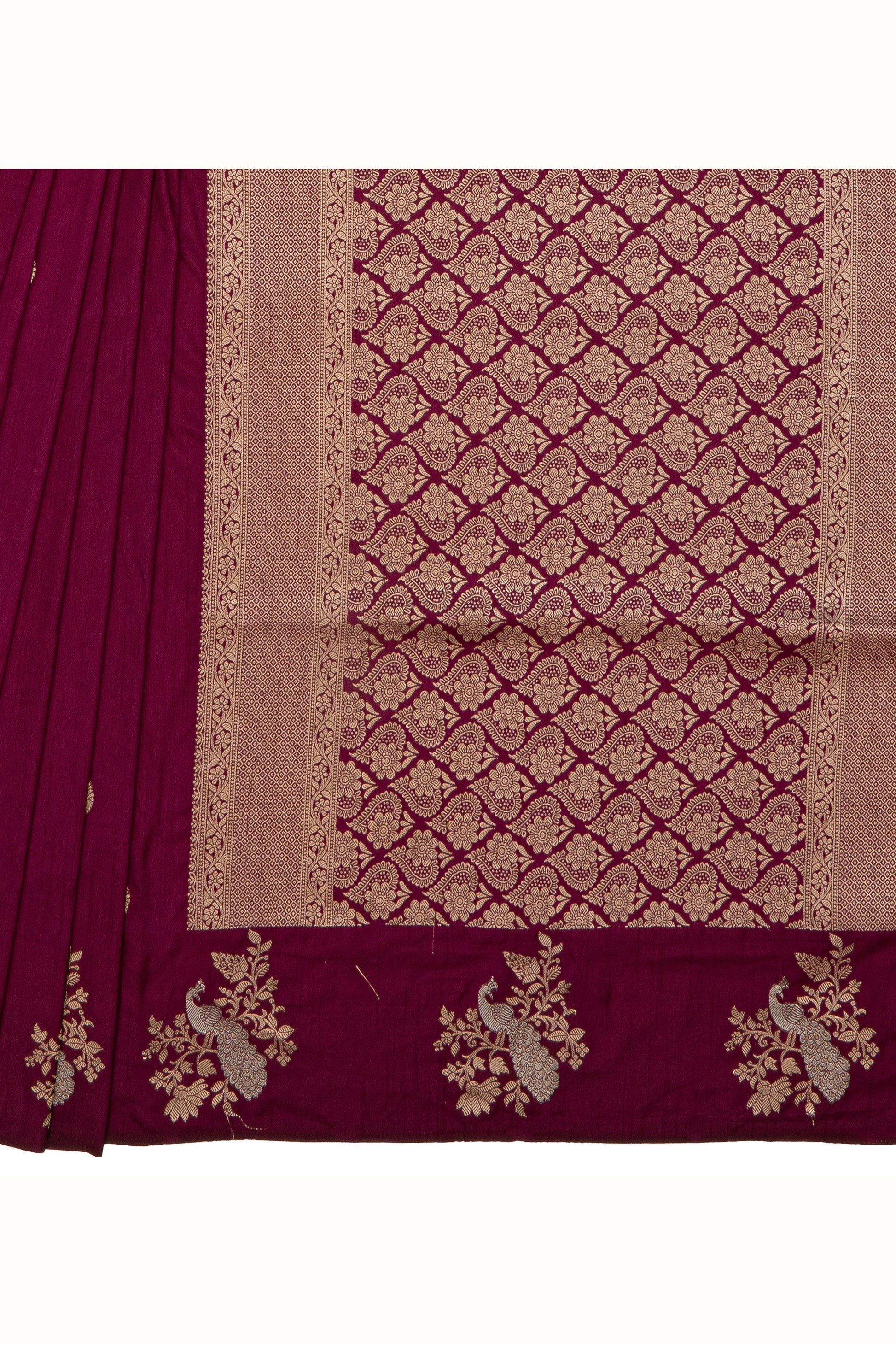 A timeless Wine Banarasi with the rich hand of Semi Silk - Raw Silk. a gentle sheen and even fall make it instantly camera-ready. A graceful pick for party, festive and puja and family celebrations. A matching blouse creates a cohesive, refined ensemble.