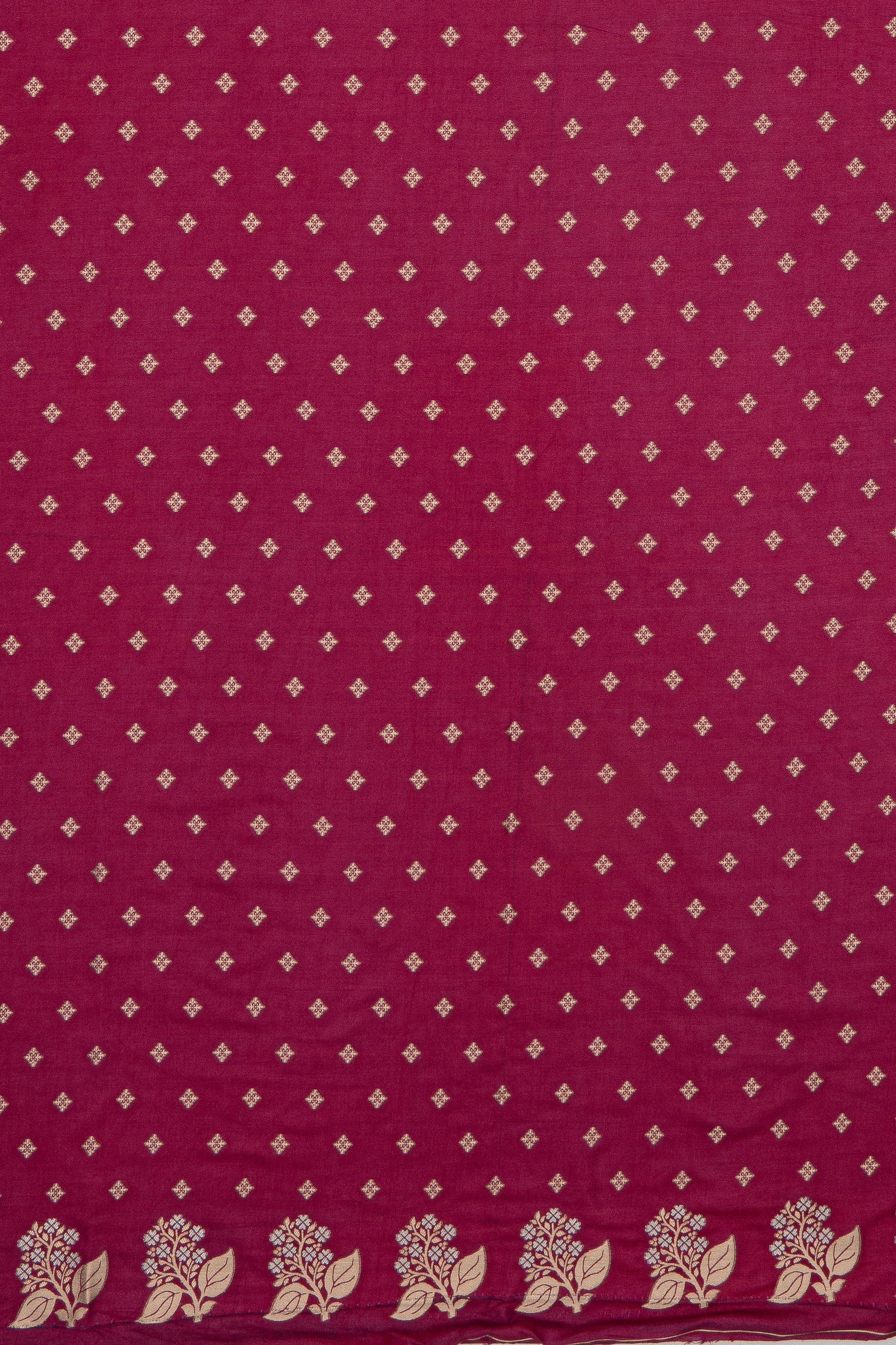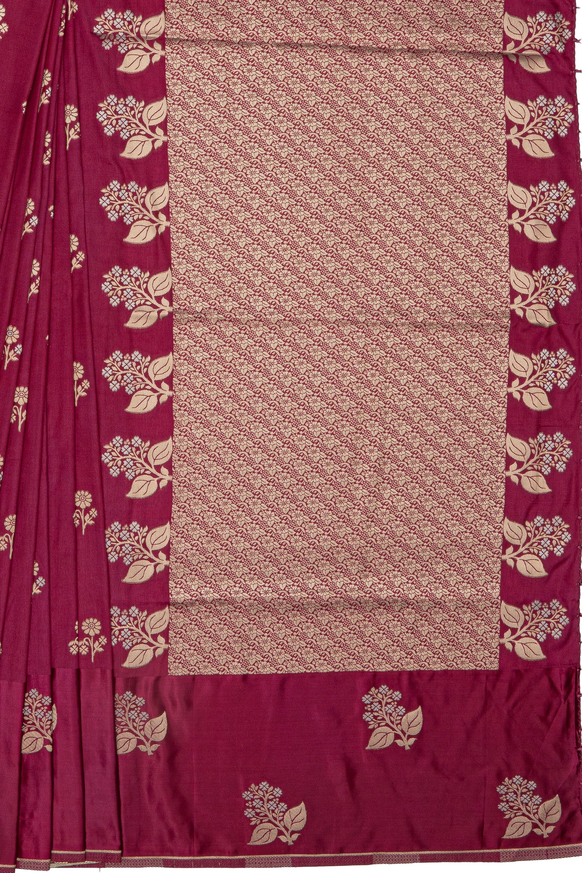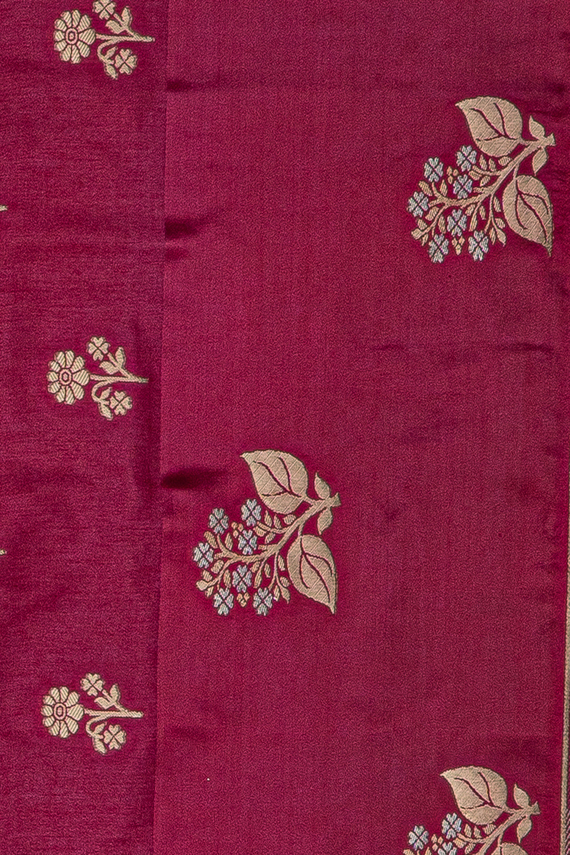A graceful Wine Banarasi showcasing the fluid fall of Semi Silk - Dola Silk. subtle motifs and a clean fall keep the look elevated and timeless. Made for party, festive and puja, temple visits and cultural festivities. Style with antique gold accents for a regal finish.