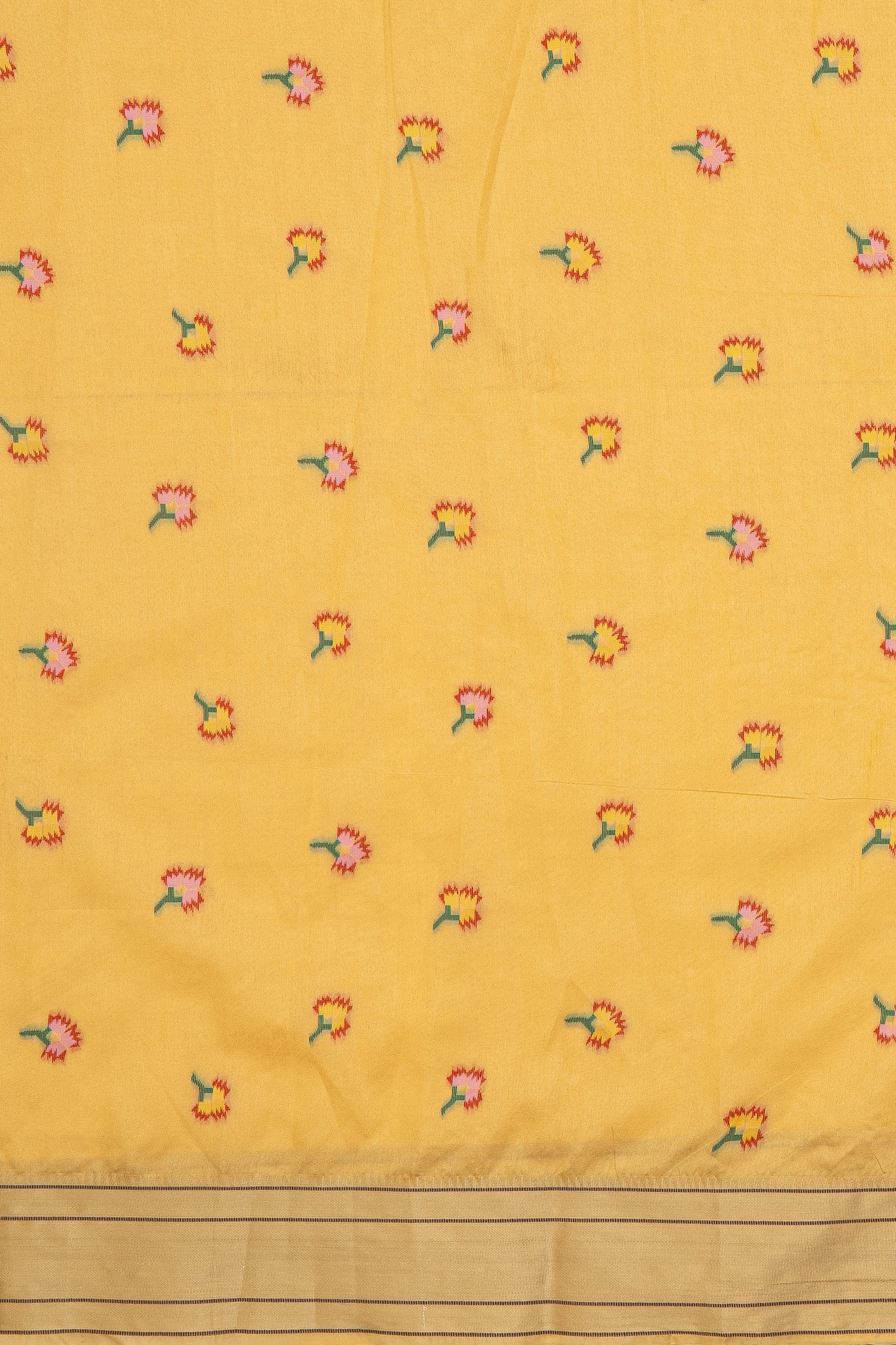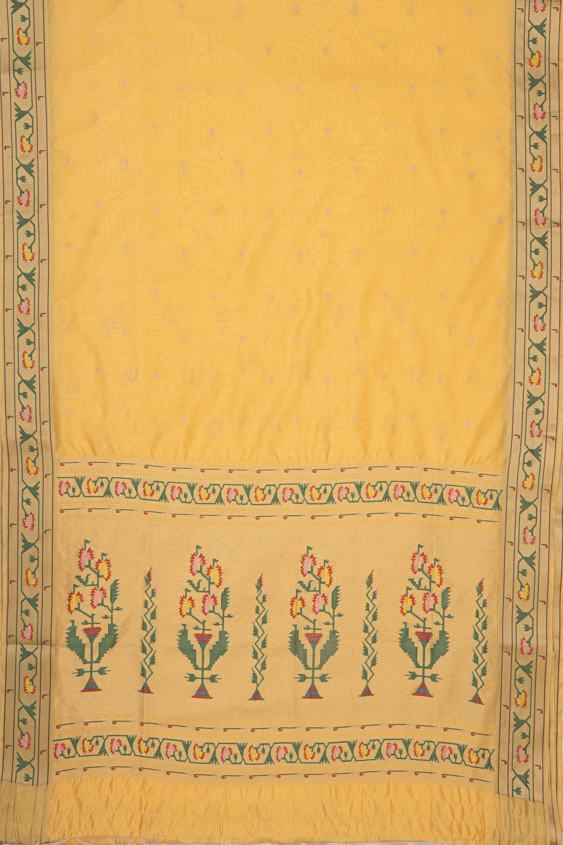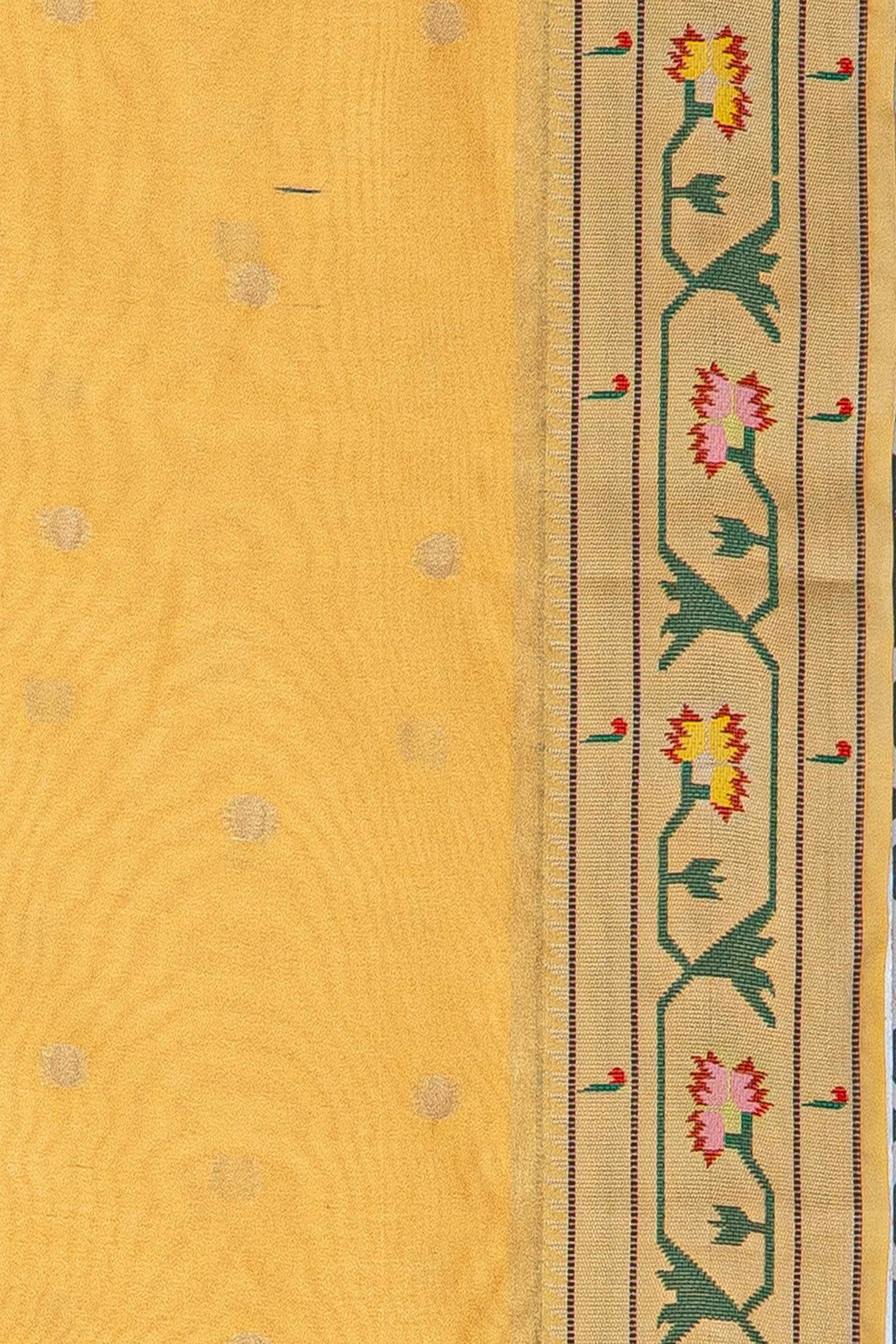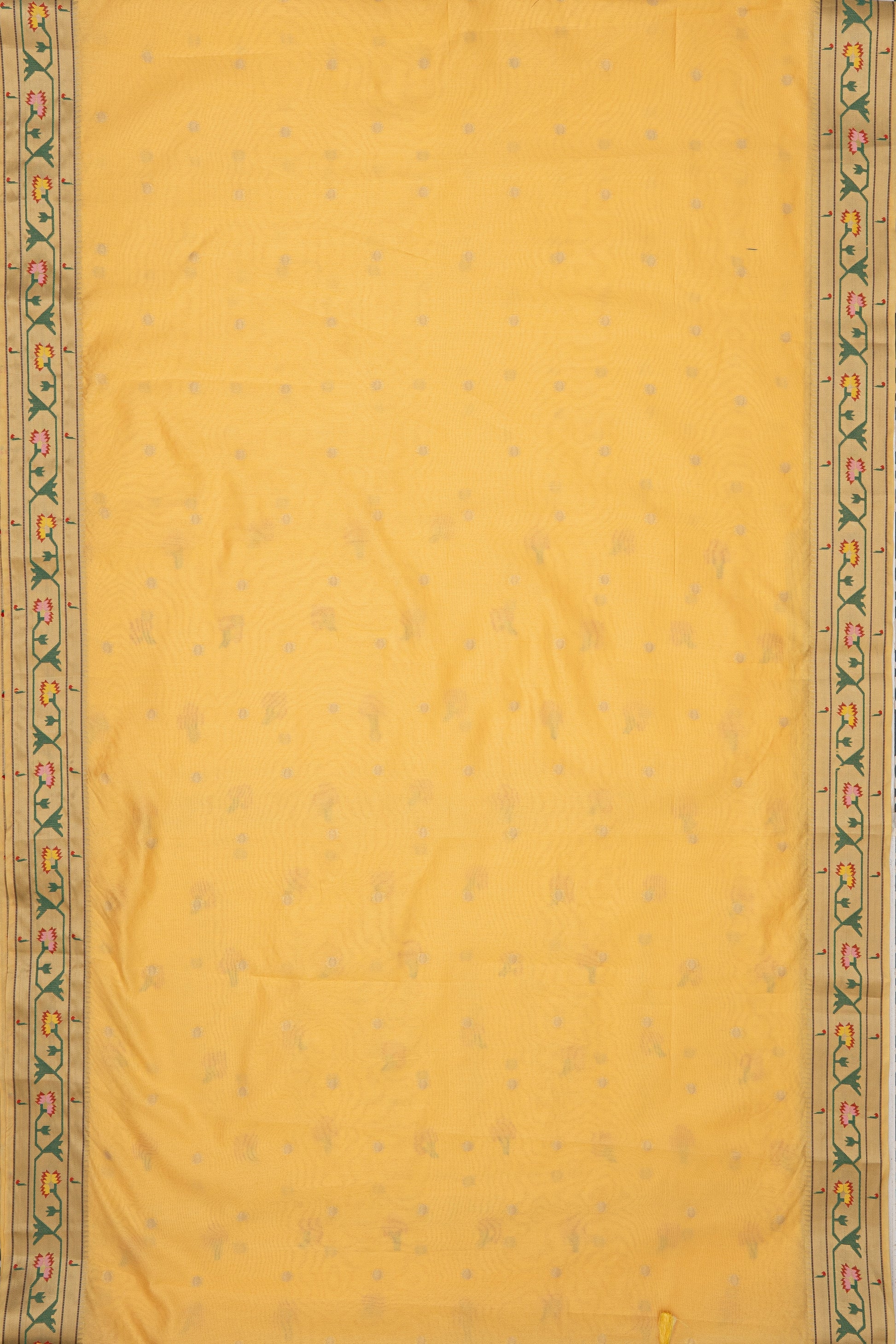 A refined Yellow Paithani crafted from premium Semi Silk - Tussar Silk. the lustrous weave and balanced structure deliver modern sophistication. Thoughtfully made for party, festive and puja and day-to-evening dressing. A sleek bun and bold bindi bring out its heritage appeal.