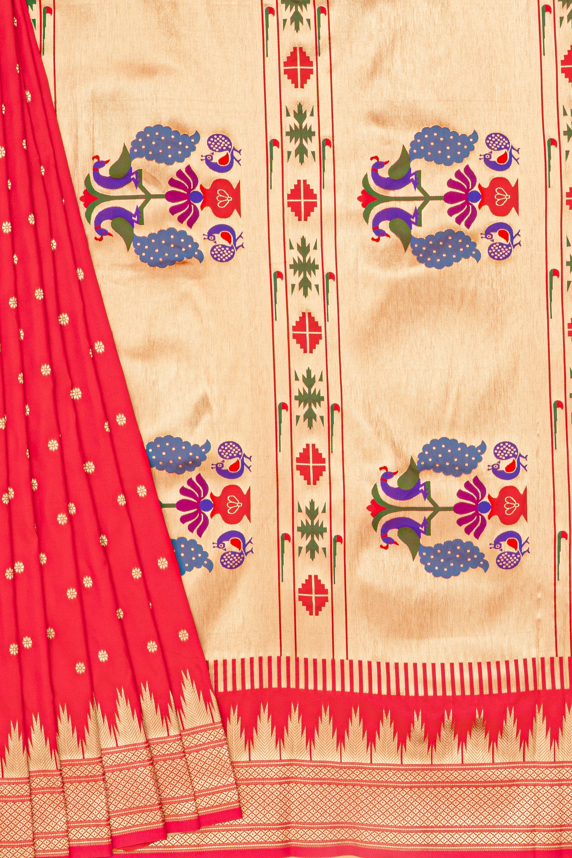 An heirloom-worthy Red Paithani woven in Semi Silk - Katan Silk. its drape feels light and composed while the finish looks impeccably polished. Perfect for party, festive and puja, weddings and special gatherings. Pair it with traditional jewellery to complete the look.