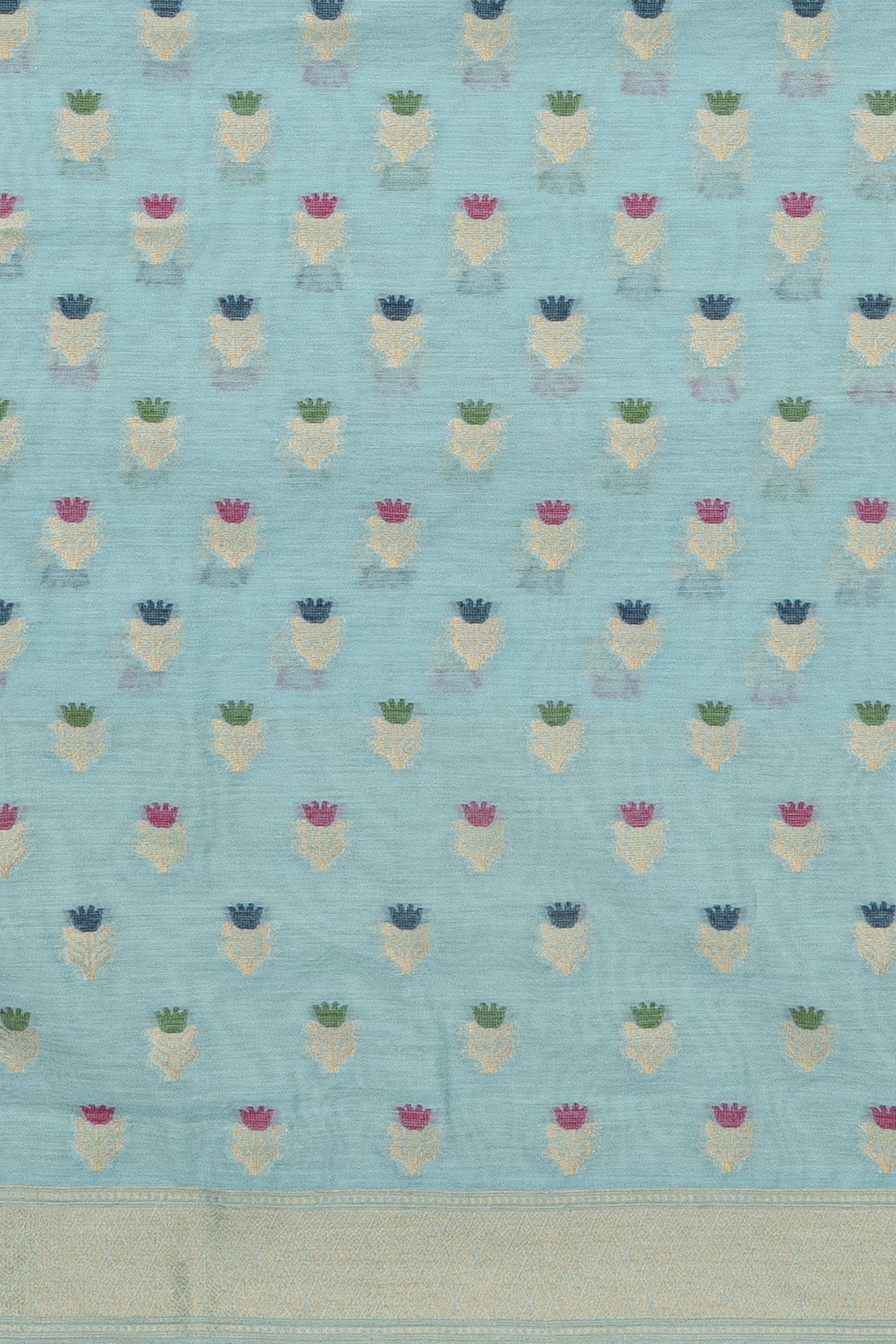 A refined Baby Blue Hastakala Exclusive crafted from premium Semi Silk - Tissue Silk. the lustrous weave and balanced structure deliver modern sophistication. Thoughtfully made for party, festive and puja and day-to-evening dressing. A sleek bun and bold bindi bring out its heritage appeal.