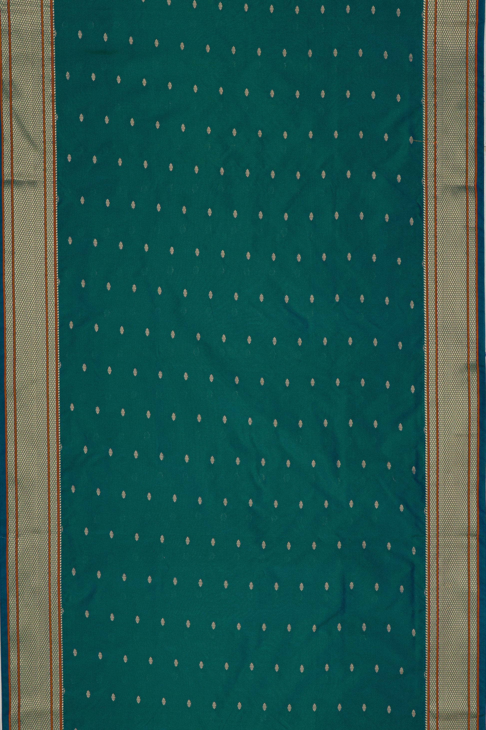 A graceful Peacock Blue Paithani showcasing the fluid fall of Semi Silk - Apurva Silk. subtle motifs and a clean fall keep the look elevated and timeless. Made for festive and puja, temple visits and cultural festivities. Style with antique gold accents for a regal finish.