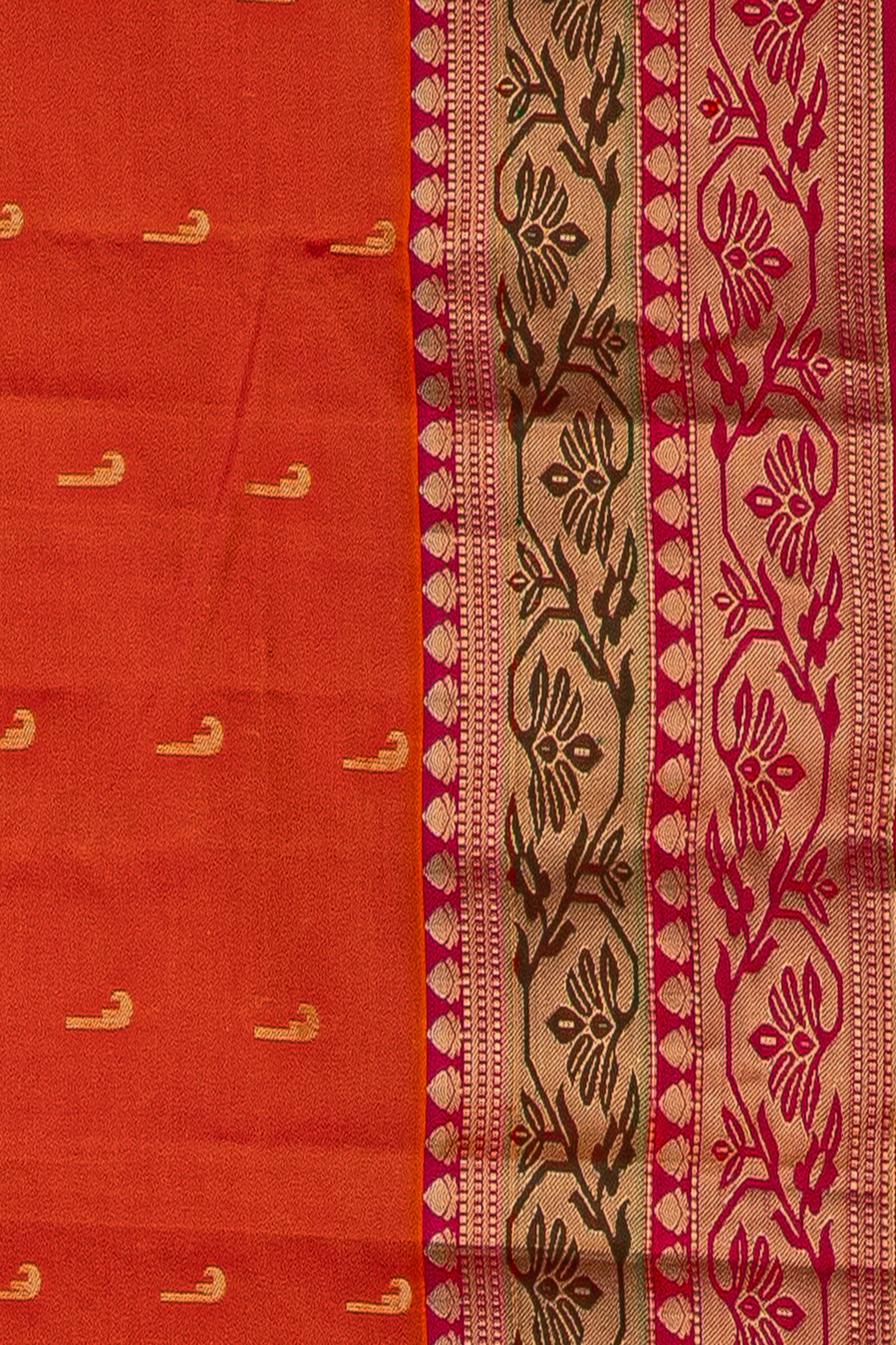 Designed for the spotlight, this Orange Traditional is fashioned in Pure Silk. delicate detailing lends quiet luxury and a poised presence. A versatile choice for festive and puja and joyous occasions. Understated diamond pieces amplify its modern elegance.