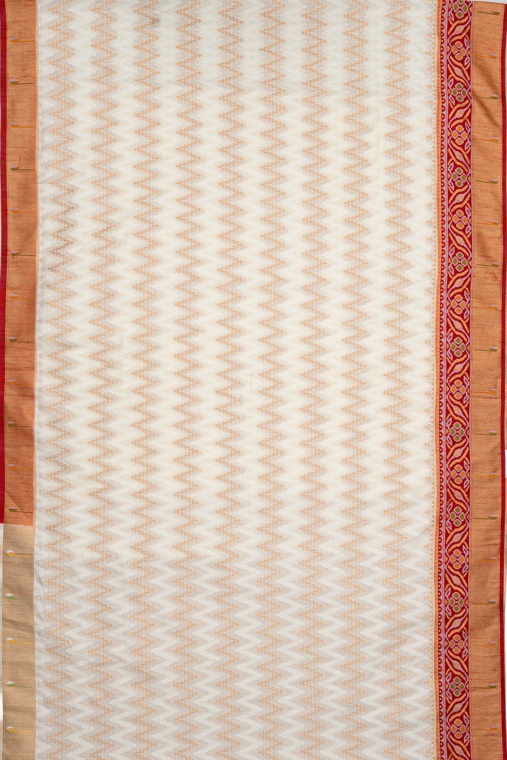 Experience timeless elegance with the White Tussar Silk Patola Saree with contrast Red border from Hastakala. Designed for semi silk - tussar silk, puja, festive, patola, this saree showcases the fine artistry and heritage of Indian weaving. Bring home this work of art from Hastakala and let your elegance shine.