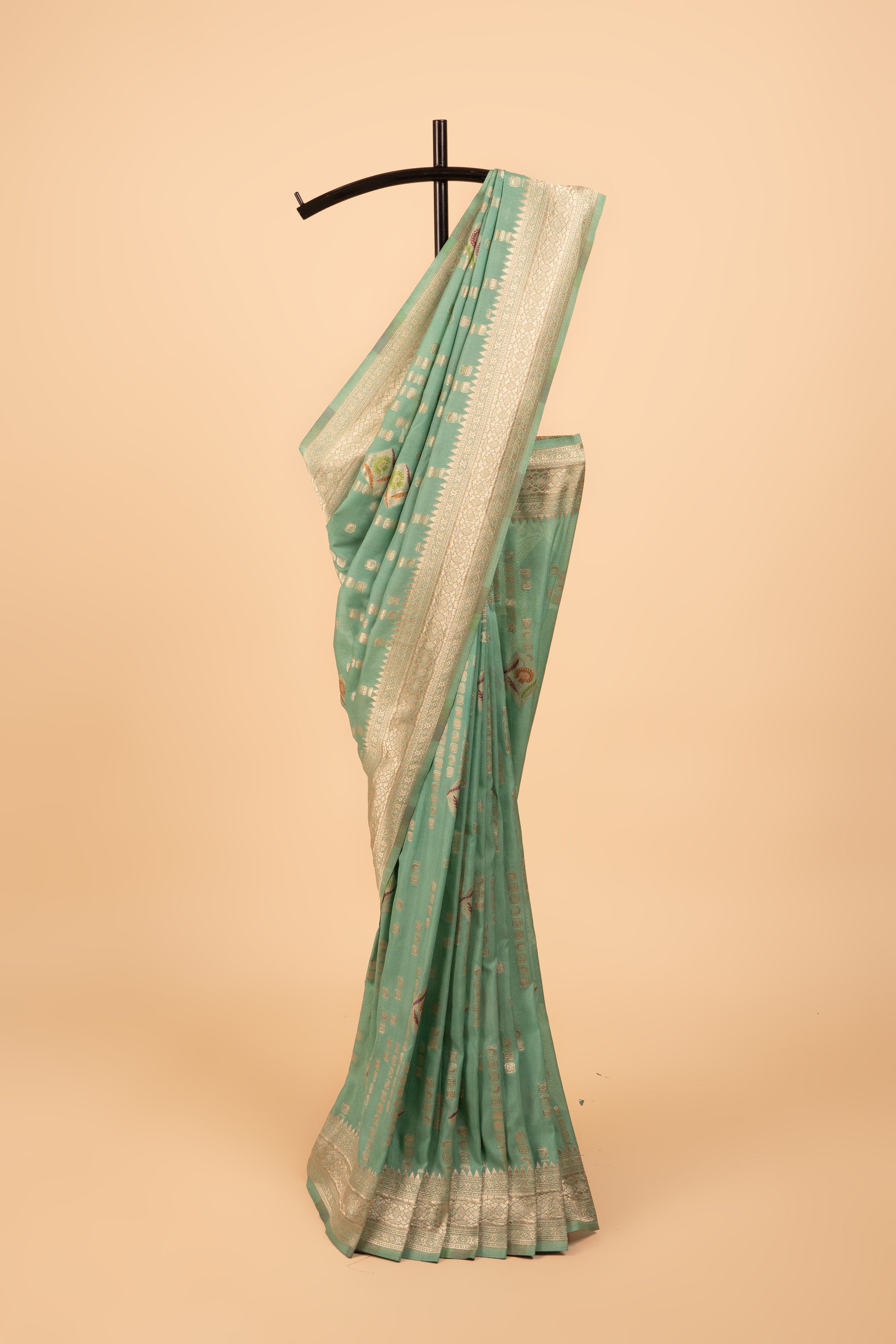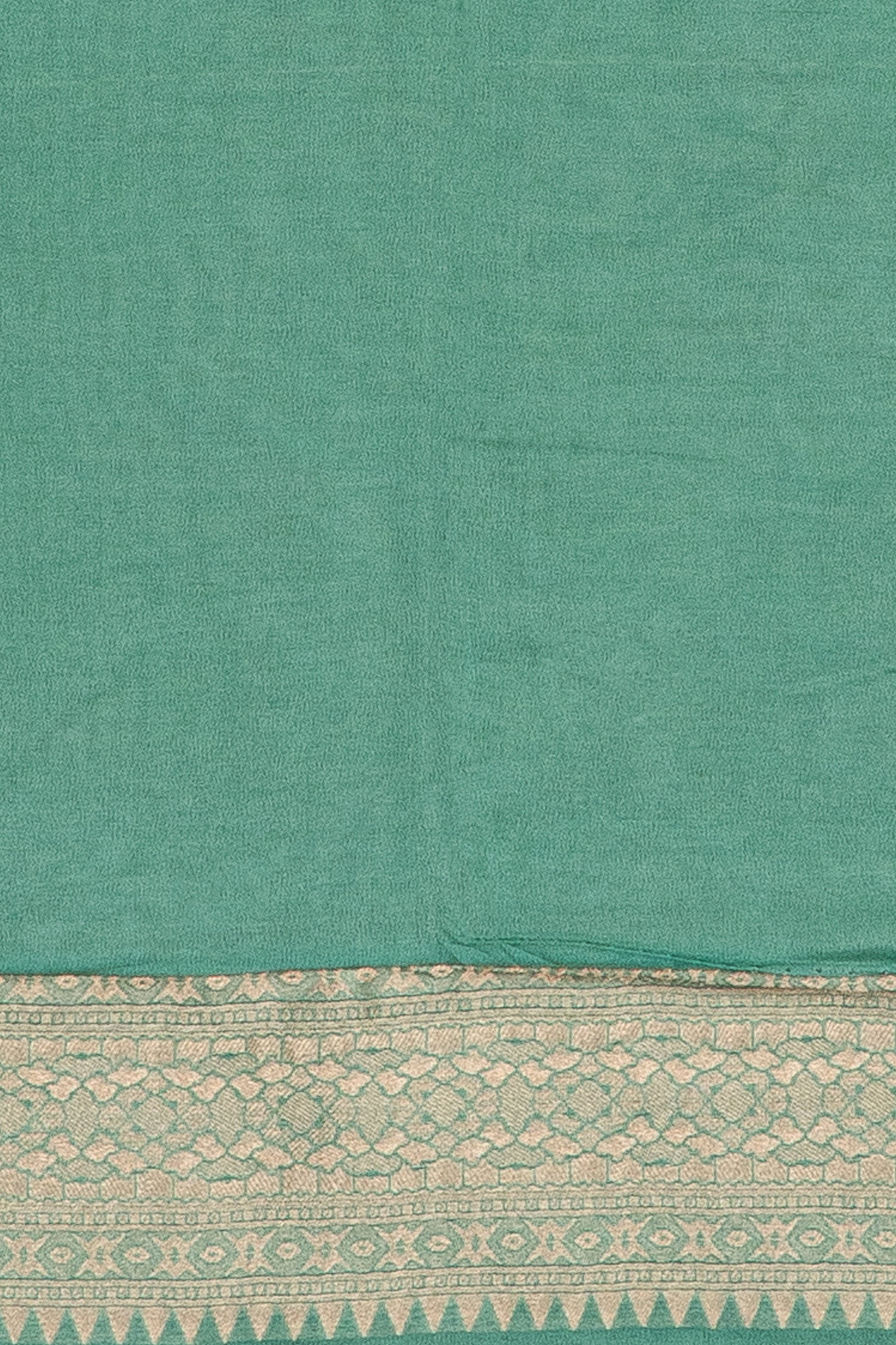 Radiate subtle charm with Hastakala’s Pastel Green Georgette Saree, delicately woven with elegant gold zariwork. Its soft, fluid drape and serene hue make it a graceful choice for festive gatherings or special occasions. A timeless blend of sophistication and tradition, this saree reflects effortless beauty in every fold.