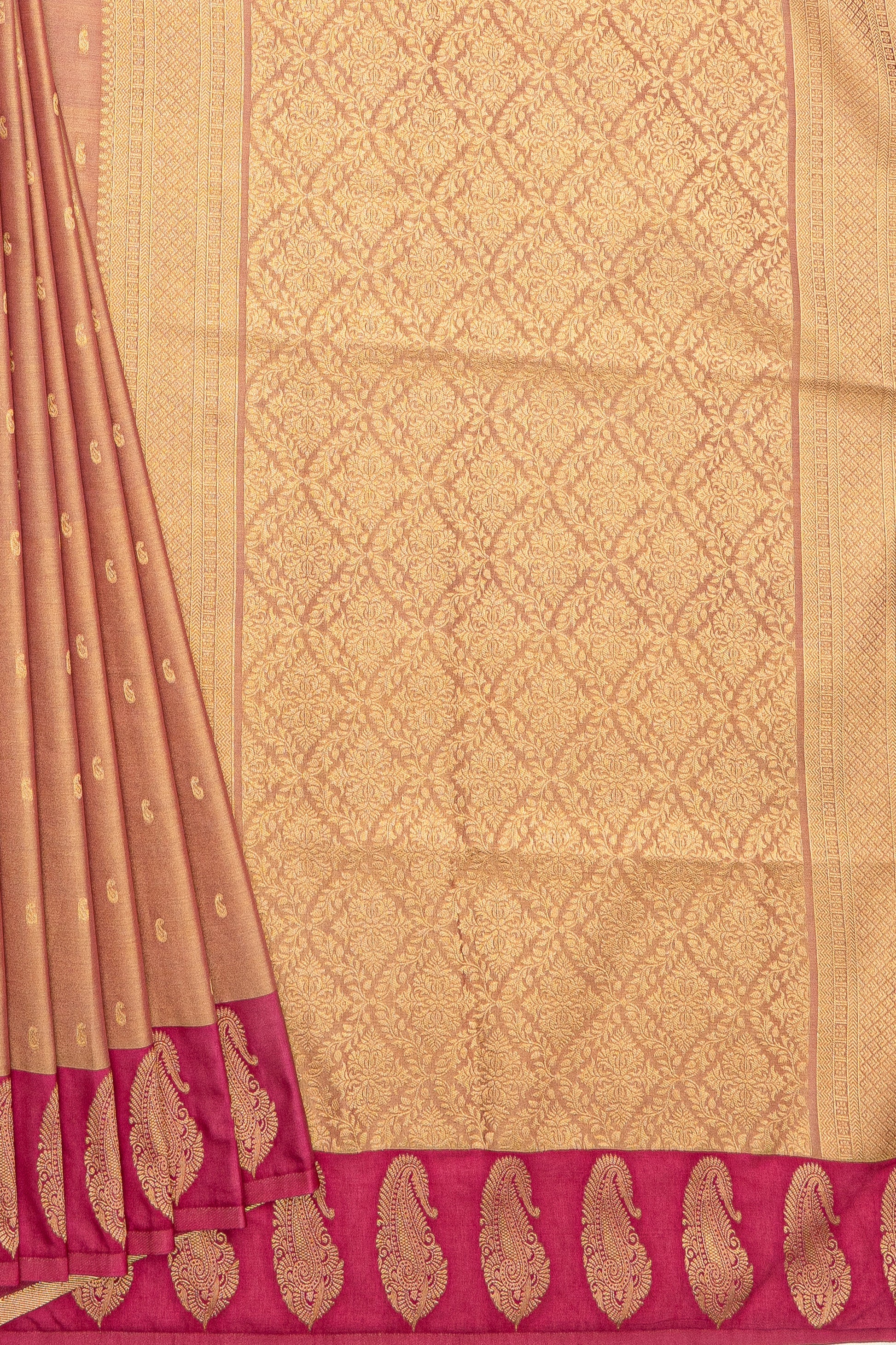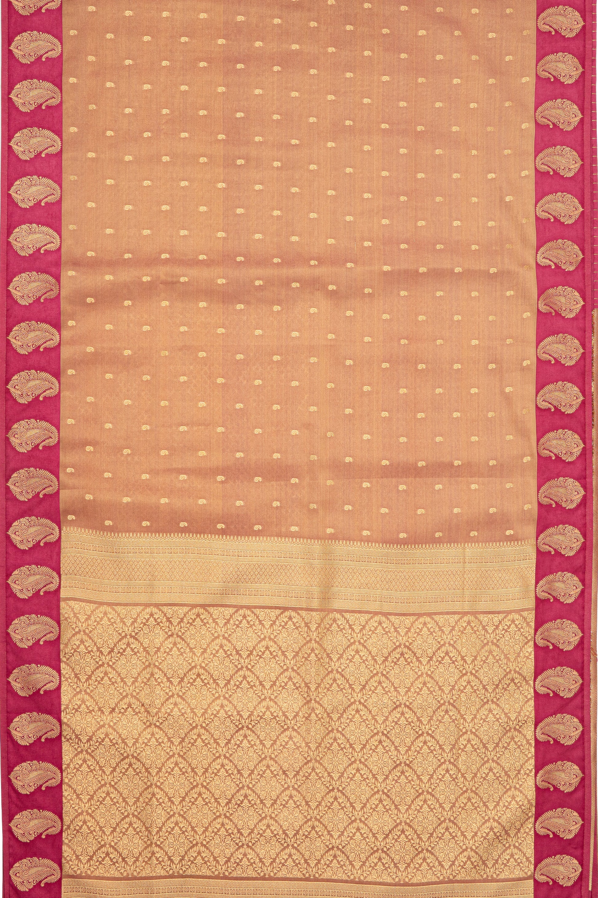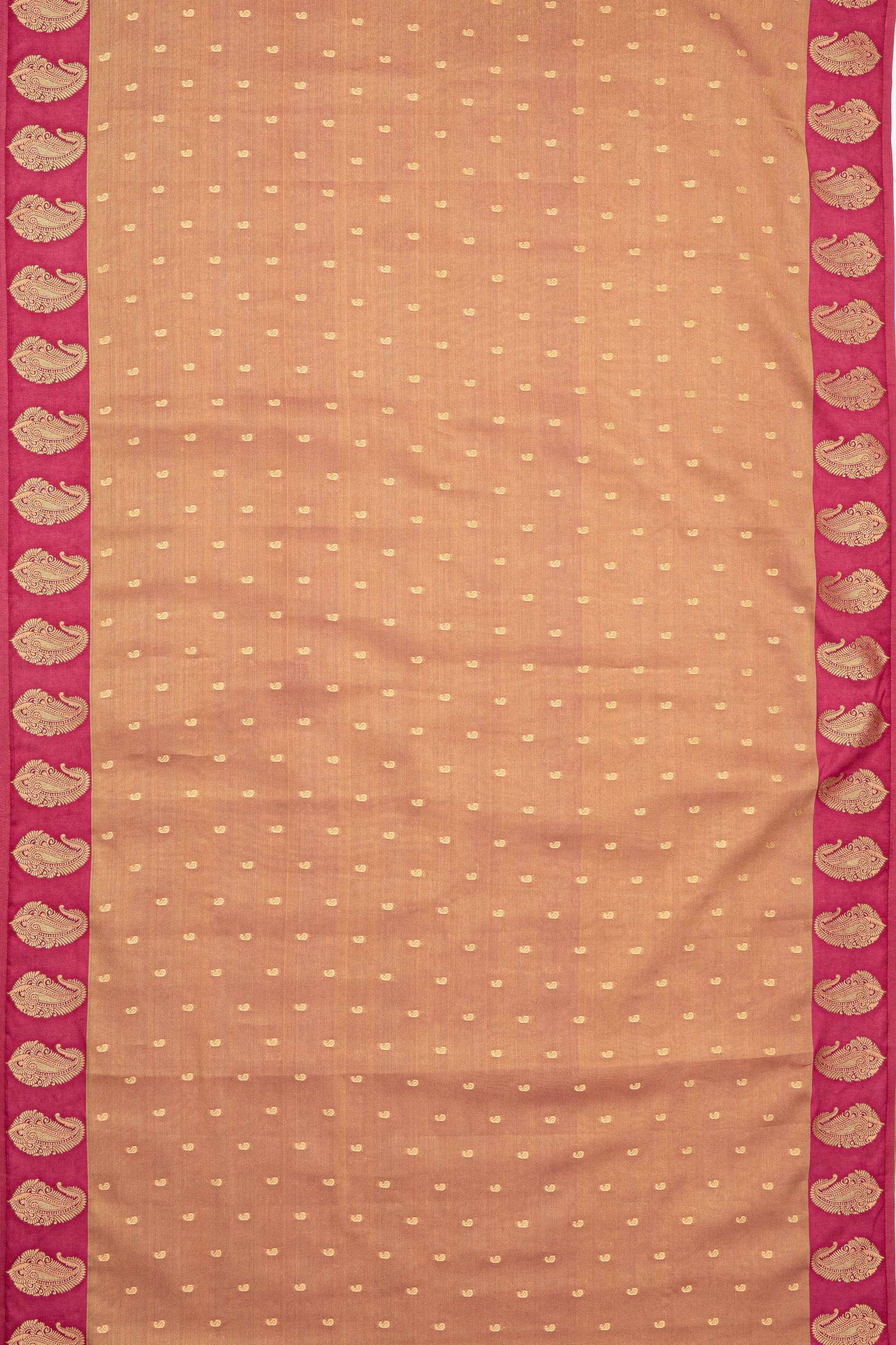 Peach Tissue Silk Saree with contrast Pink border — Celebrate every moment with this semi silk - tissue silk traditional, designed for festive, puja. Its delicate craftsmanship and soft finish make it a statement of effortless grace.