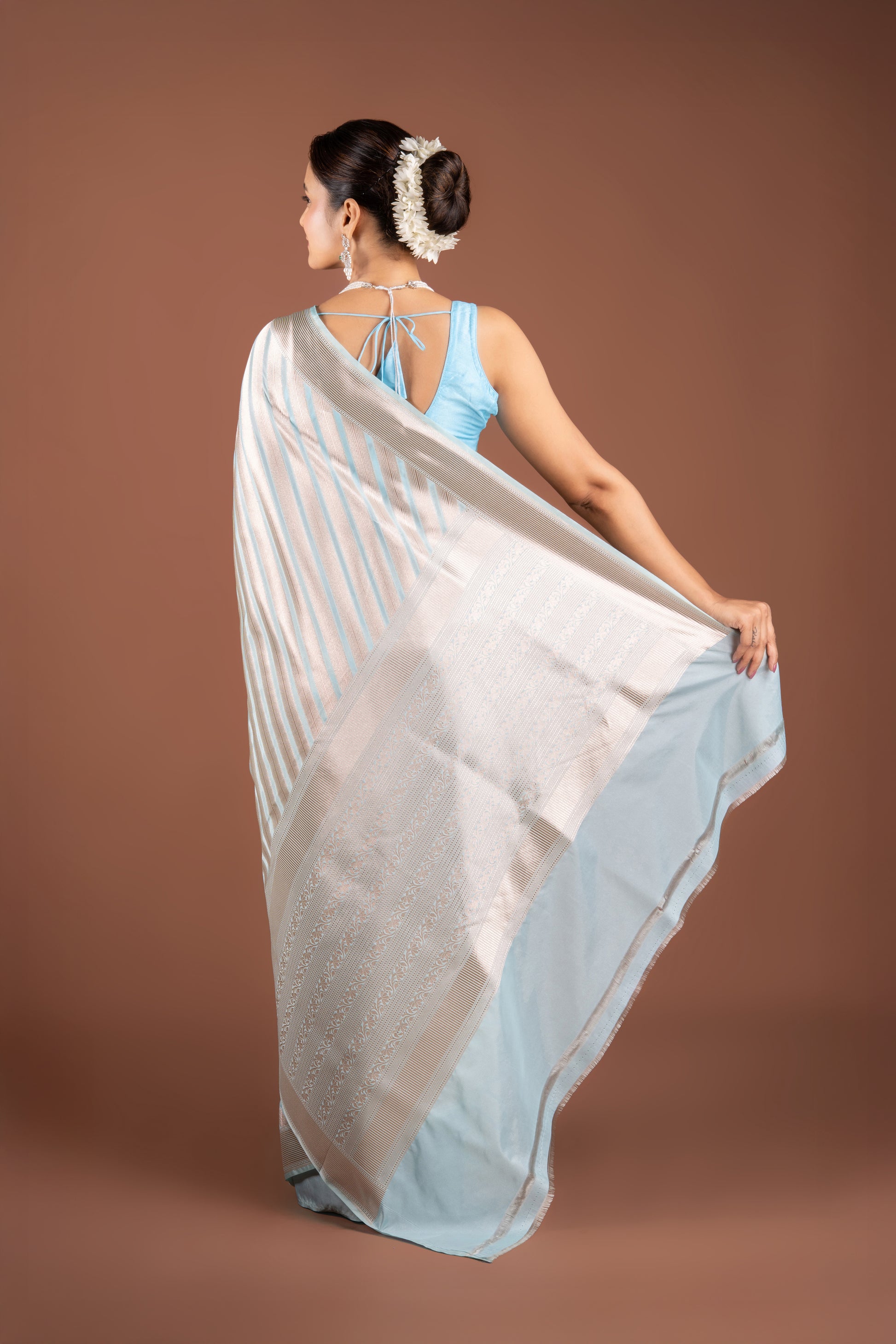 Celebrate culture and grace in this unique Baby Blue Katan Silk Saree. Designed in fine fabric, it captures the essence of festive dressing. The perfect attire for ceremonies, pujas, or elegant nights out. Wear it with minimalist jewellery to let the saree shine.