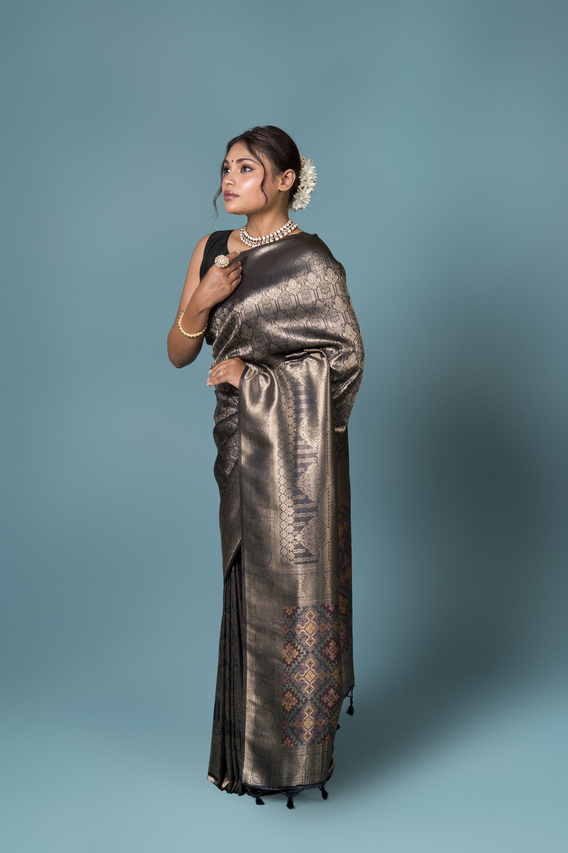The rich black base paired with a matching blouse piece creates a seamless and sophisticated look, perfect for puja ceremonies, family functions, or traditional gatherings. Its simplicity allows for versatile styling — pair it with antique gold jewelry for a regal touch or keep it minimal for understated charm.