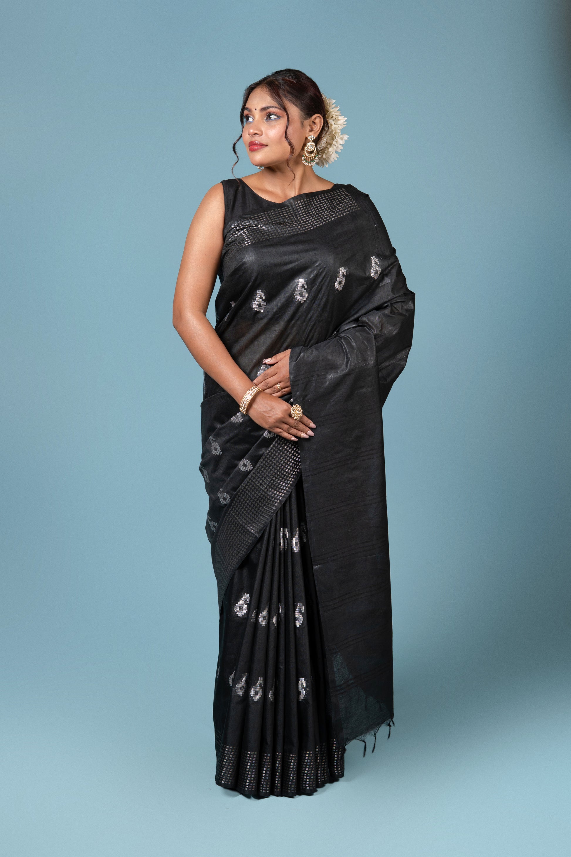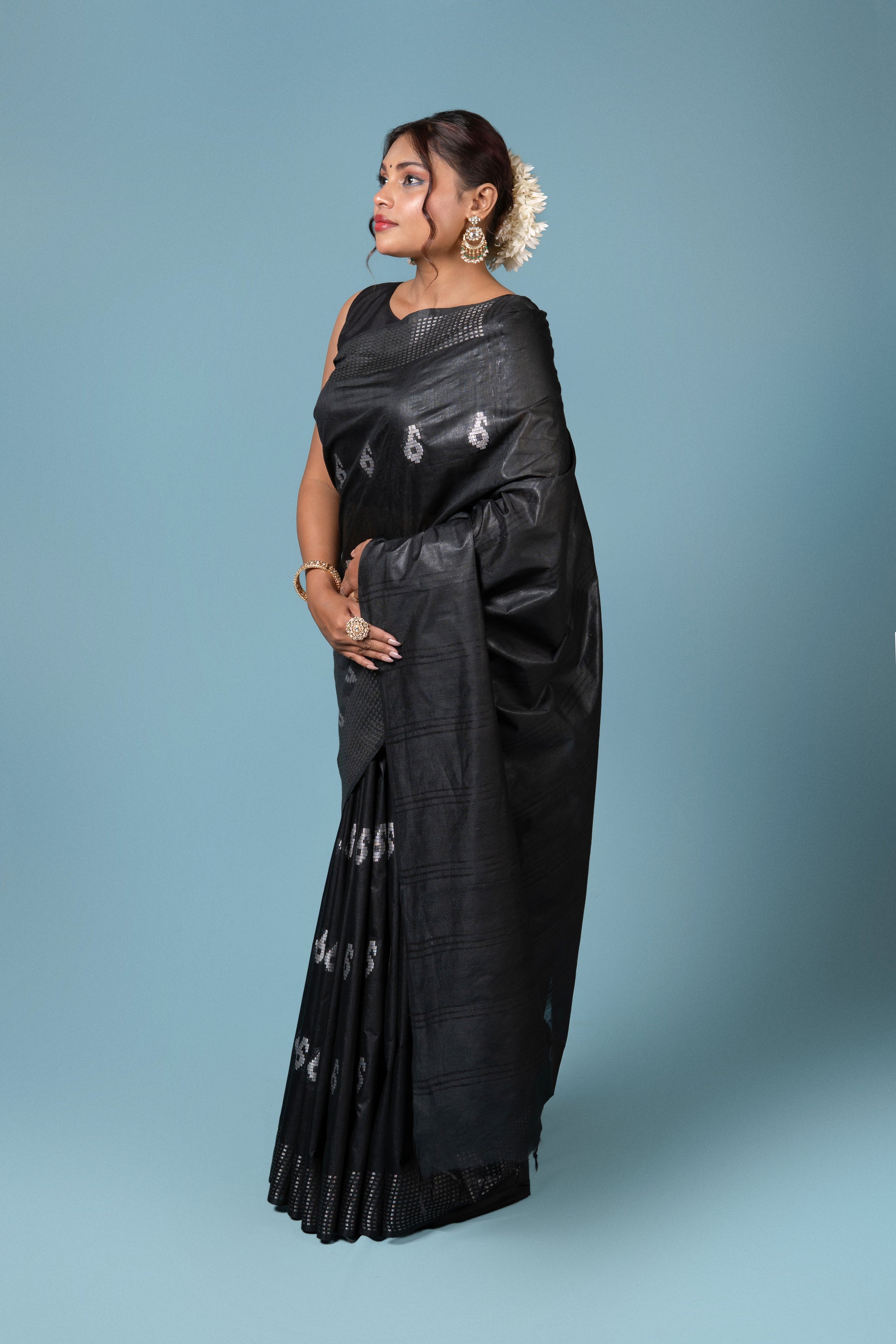 Bold and elegant, this Black Tussar Silk Saree from Hastakala Exclusive is the perfect blend of sophistication and tradition. Crafted from Art Silk – Tussar Silk, the saree features a smooth drape with a subtle sheen, making it ideal for evening occasions. The deep black base is beautifully highlighted with delicate silver zari weaving, adding a refined festive charm.