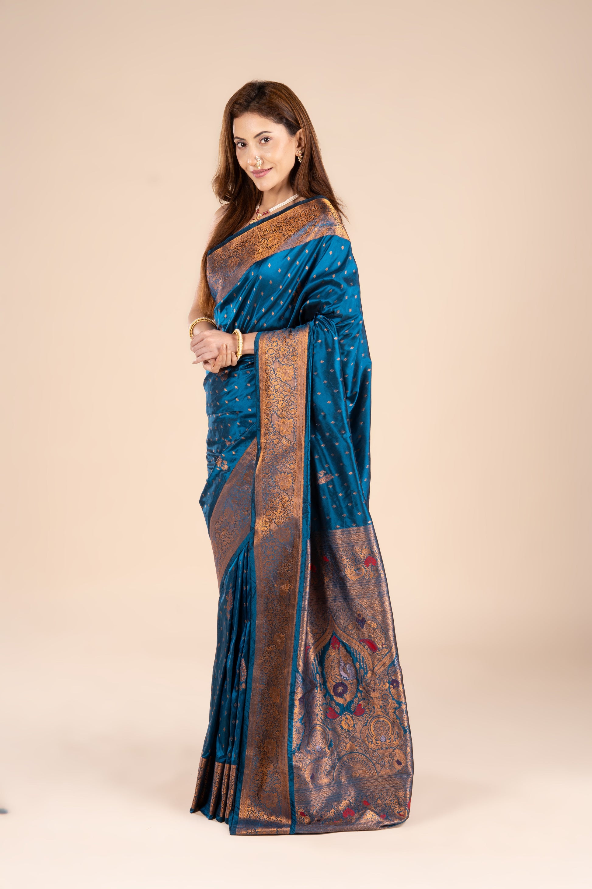 Discover elegance redefined with this Blue Apurva Silk Paithani Saree. Skillfully designed, its texture brings out richness in every fold. An outfit that transitions beautifully from daytime rituals to evening galas. Elevate the look with temple jewellery for traditional grace.