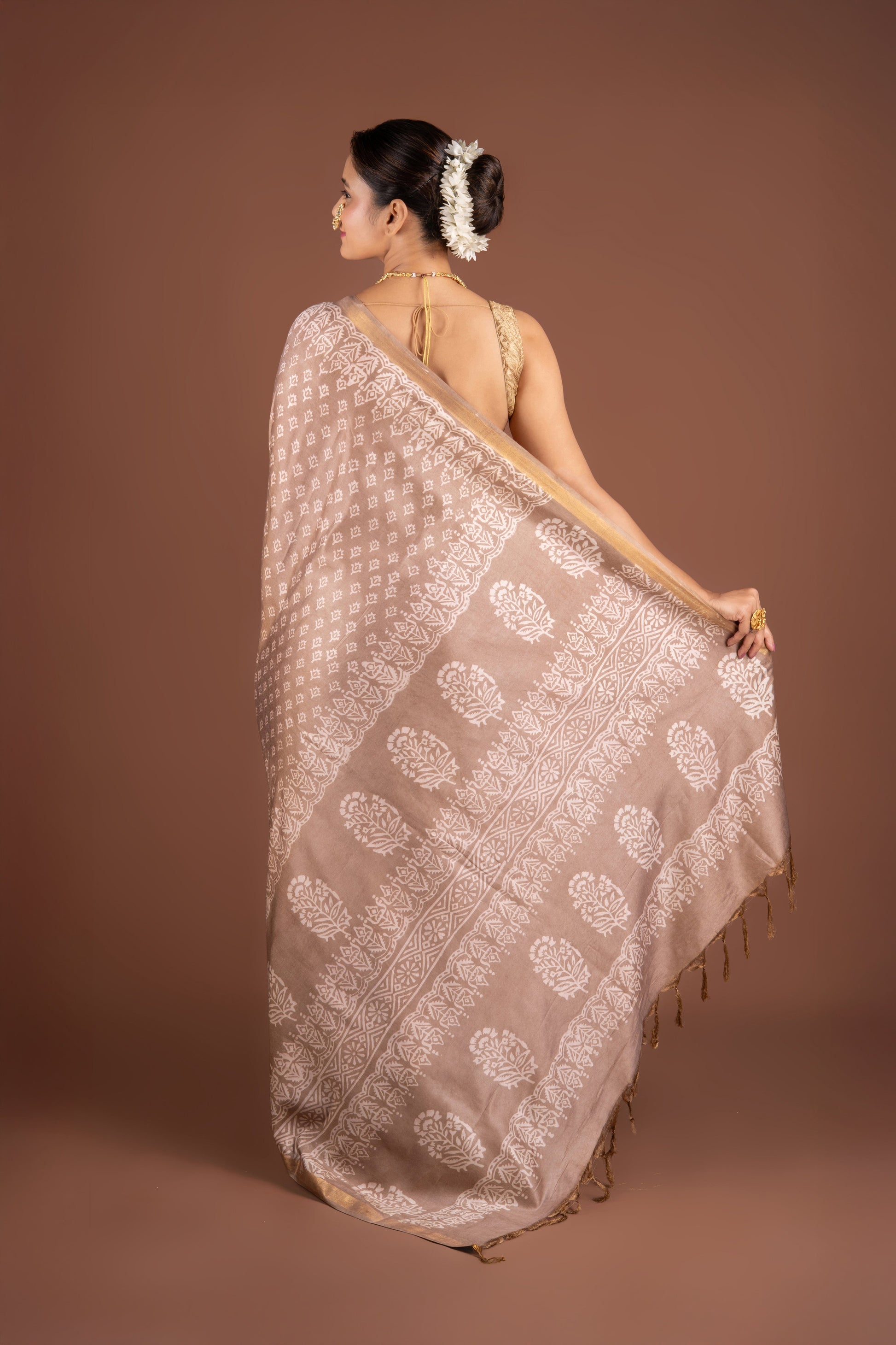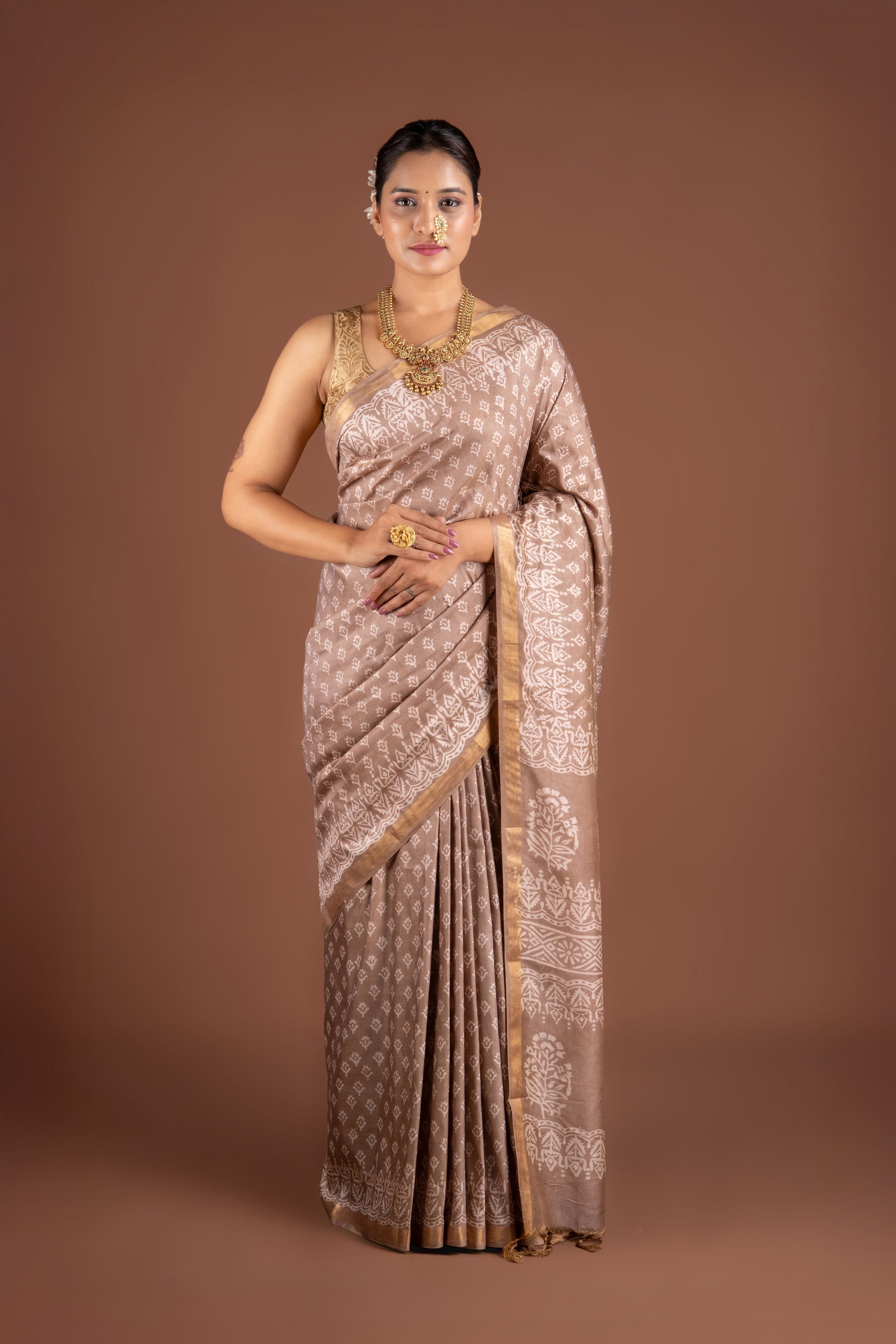 Discover elegance redefined with this Brown Dupion Silk Saree. Skillfully designed, its texture brings out richness in every fold. An outfit that transitions beautifully from daytime rituals to evening galas. Elevate the look with temple jewellery for traditional grace.