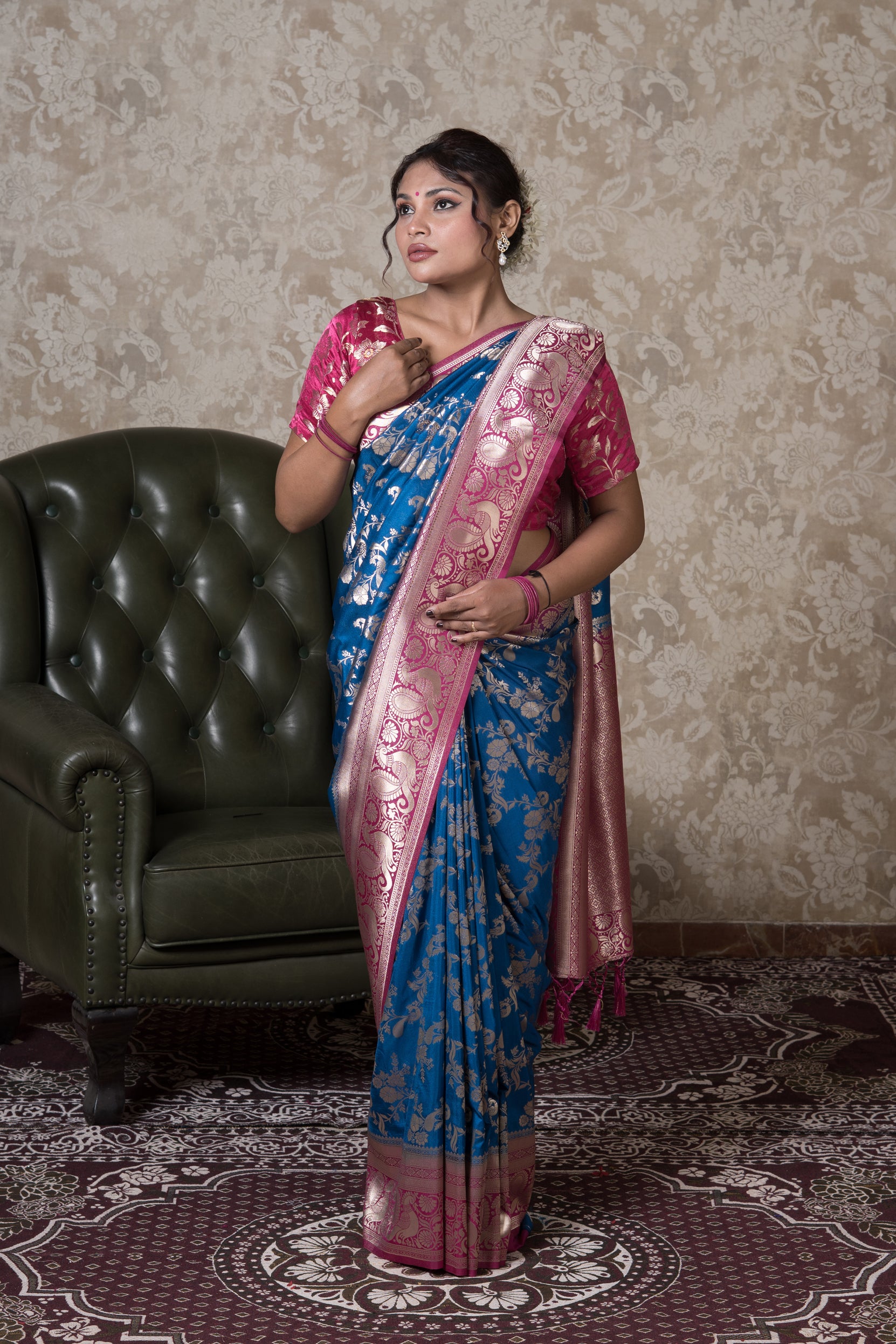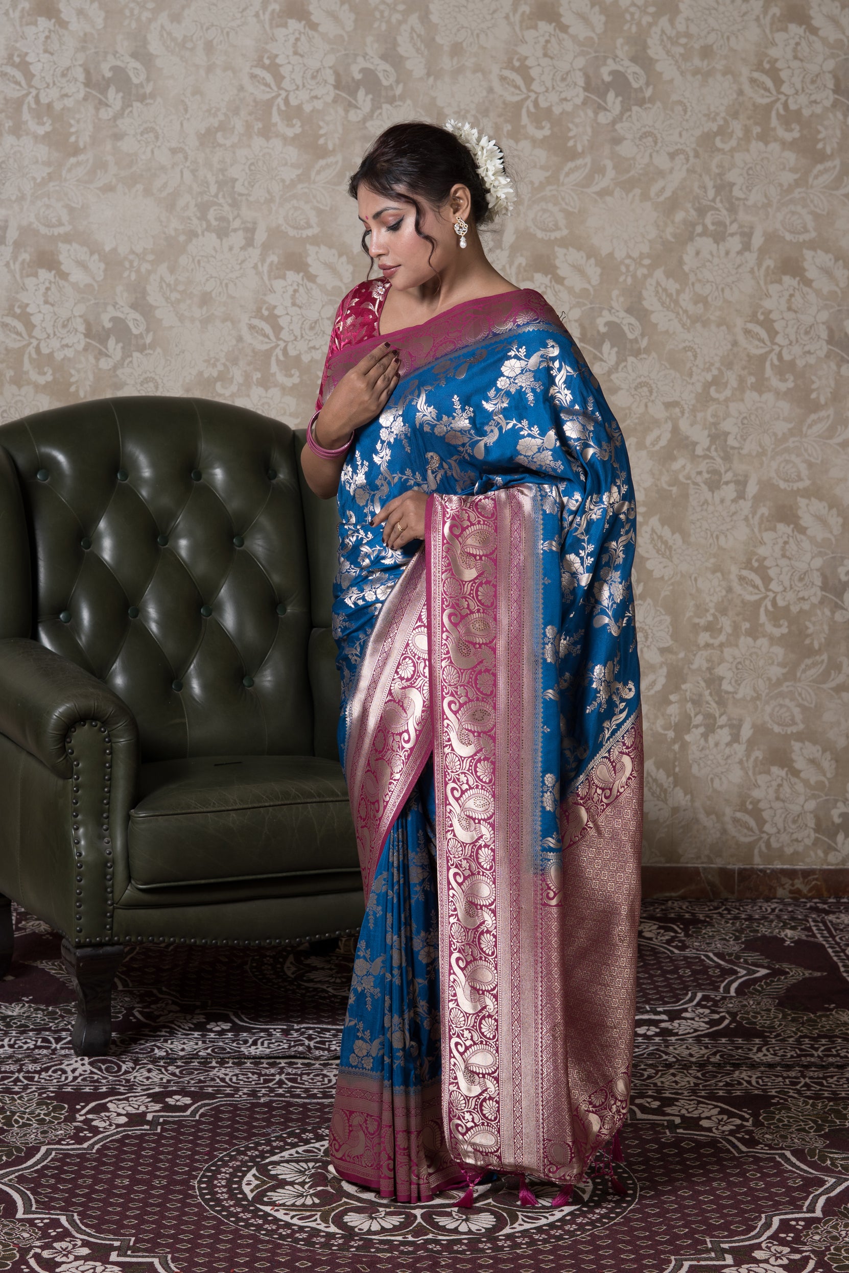 Elevate your wardrobe with our exclusive Chintamani Blue Georgette Banarasi Saree with Swarovski work. Featuring a beautiful Chintamani Blue hue, this piece effortlessly blends timeless tradition with modern elegance. Ideal for festive occasions or everyday sophistication. Shop now and make it yours.