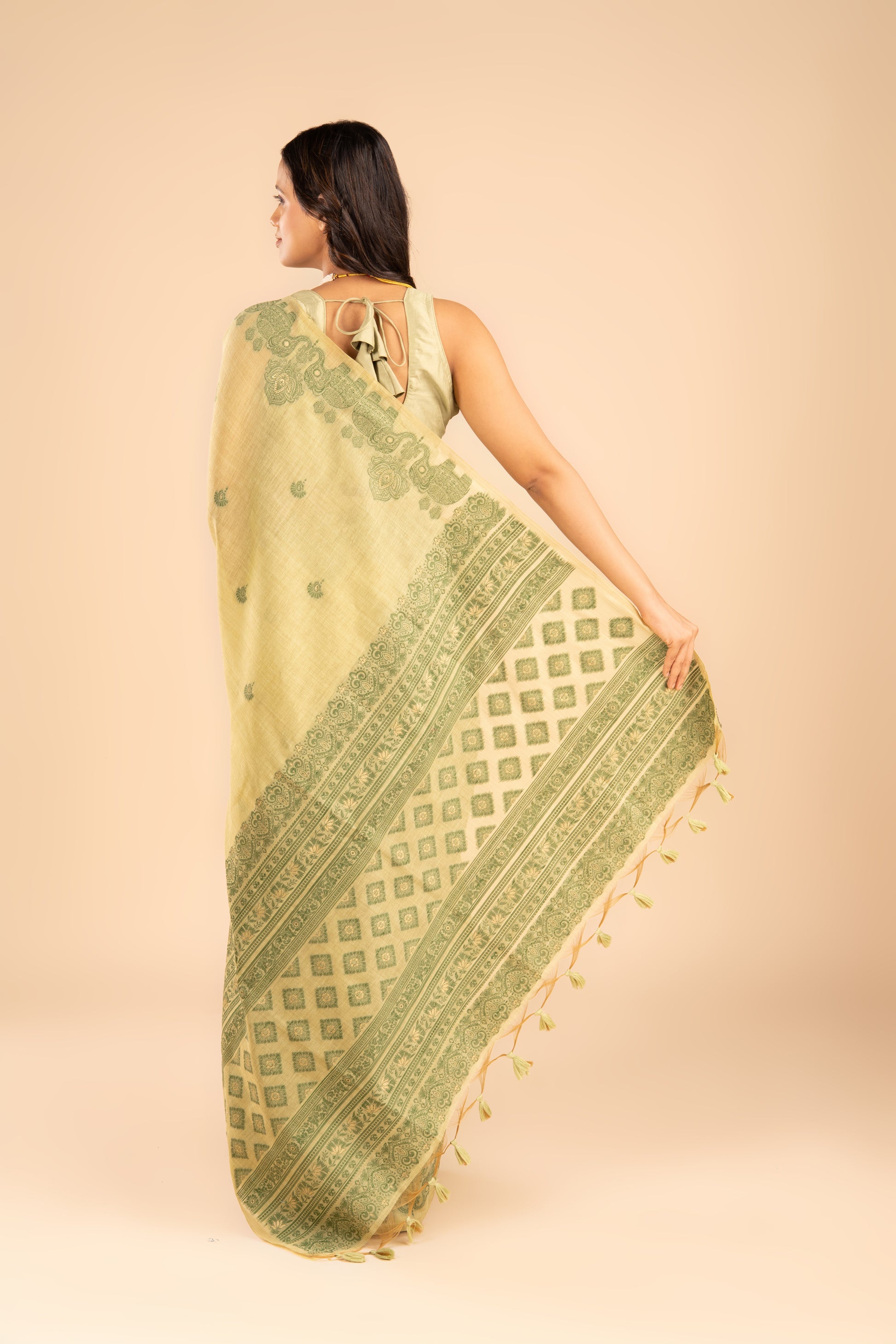 Step into grandeur with the finely detailed Green Cotton Saree with Threadwork. The fabric is lightweight yet regal, making it versatile for all-day wear. Designed for occasions where elegance and grace matter most. Team it with pearls for a refined and classic appeal.