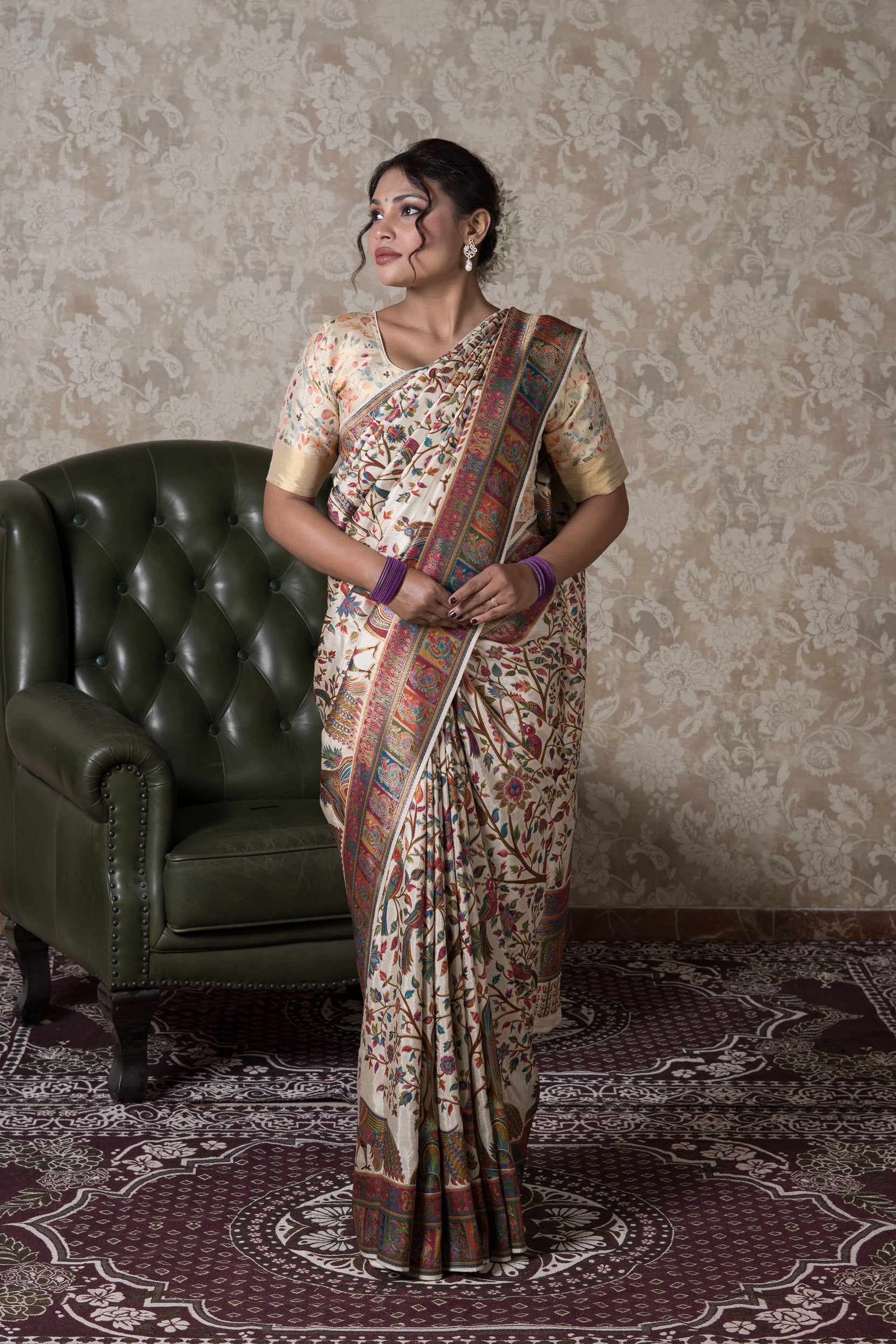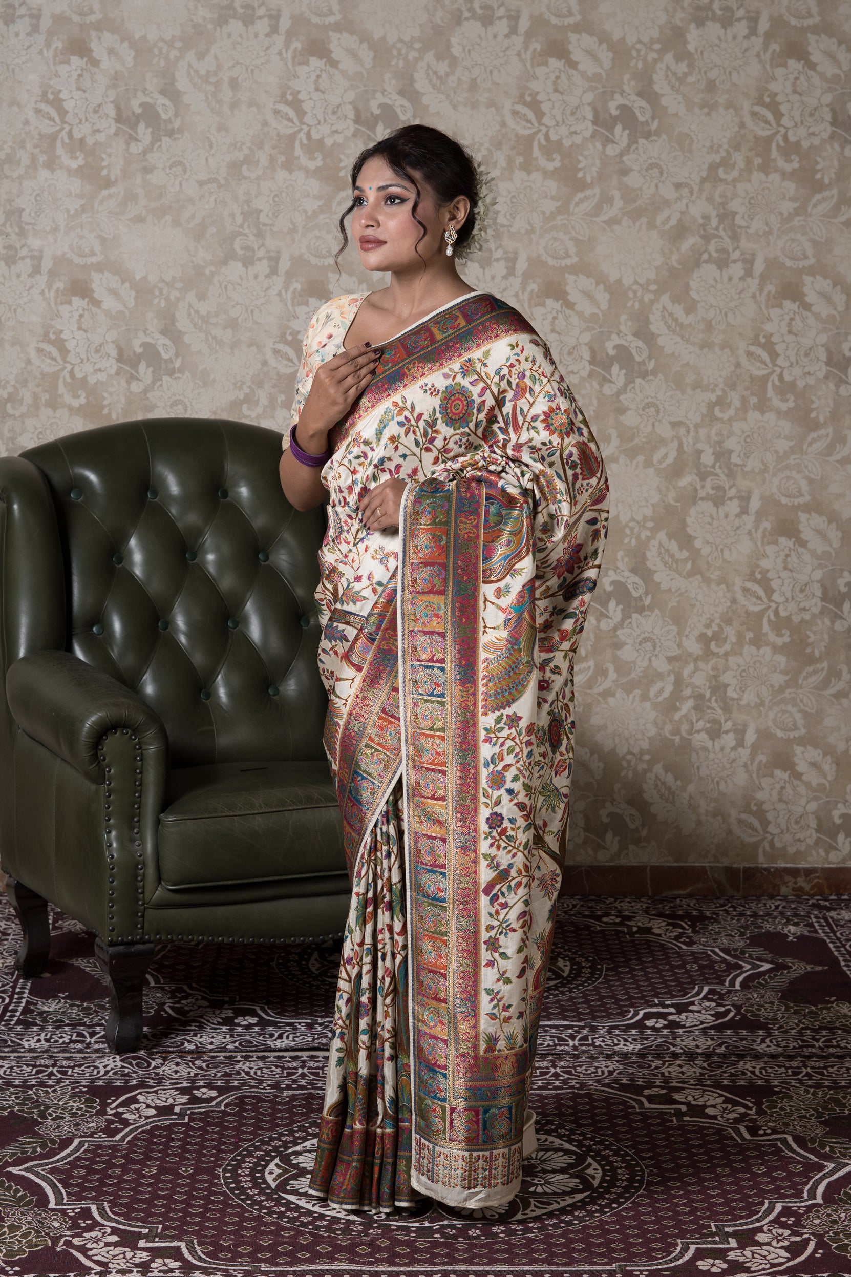 Luxurious and elegant, this Cream Dola Silk Pashmina Saree is a masterpiece that blends Kashmiri artistry with the richness of fine silk. Crafted from Art Silk – Dola Silk, the saree drapes beautifully with a subtle sheen, while the classic cream base with intricate gold zari work adds a regal charm.