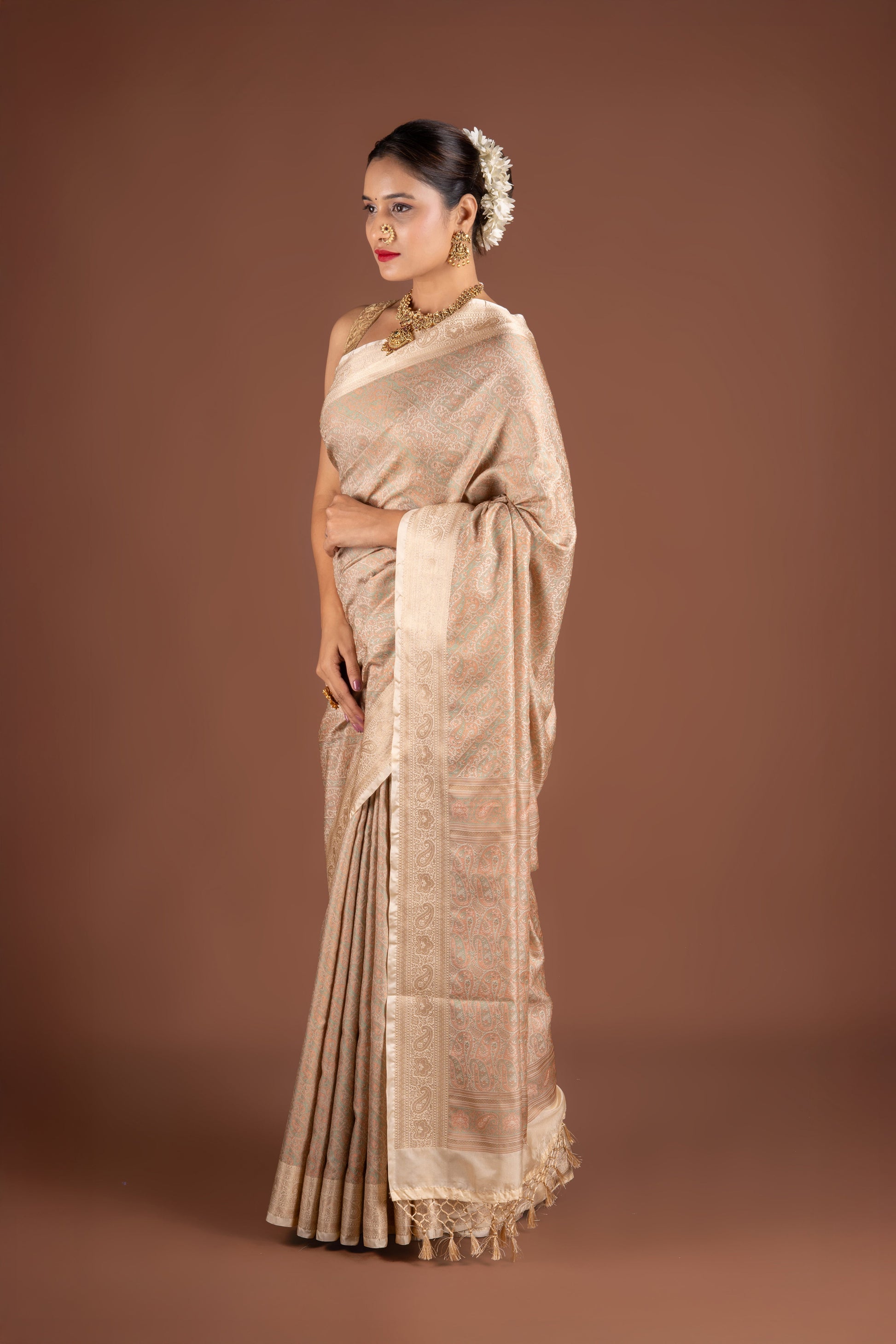 Add sophistication to your festive collection with this Cream Dola Silk Pashmina Saree. Its premium material ensures both durability and unmatched elegance. Great for festive wear, adding charm to your special moments. Accentuate with bold accessories for a contemporary twist.