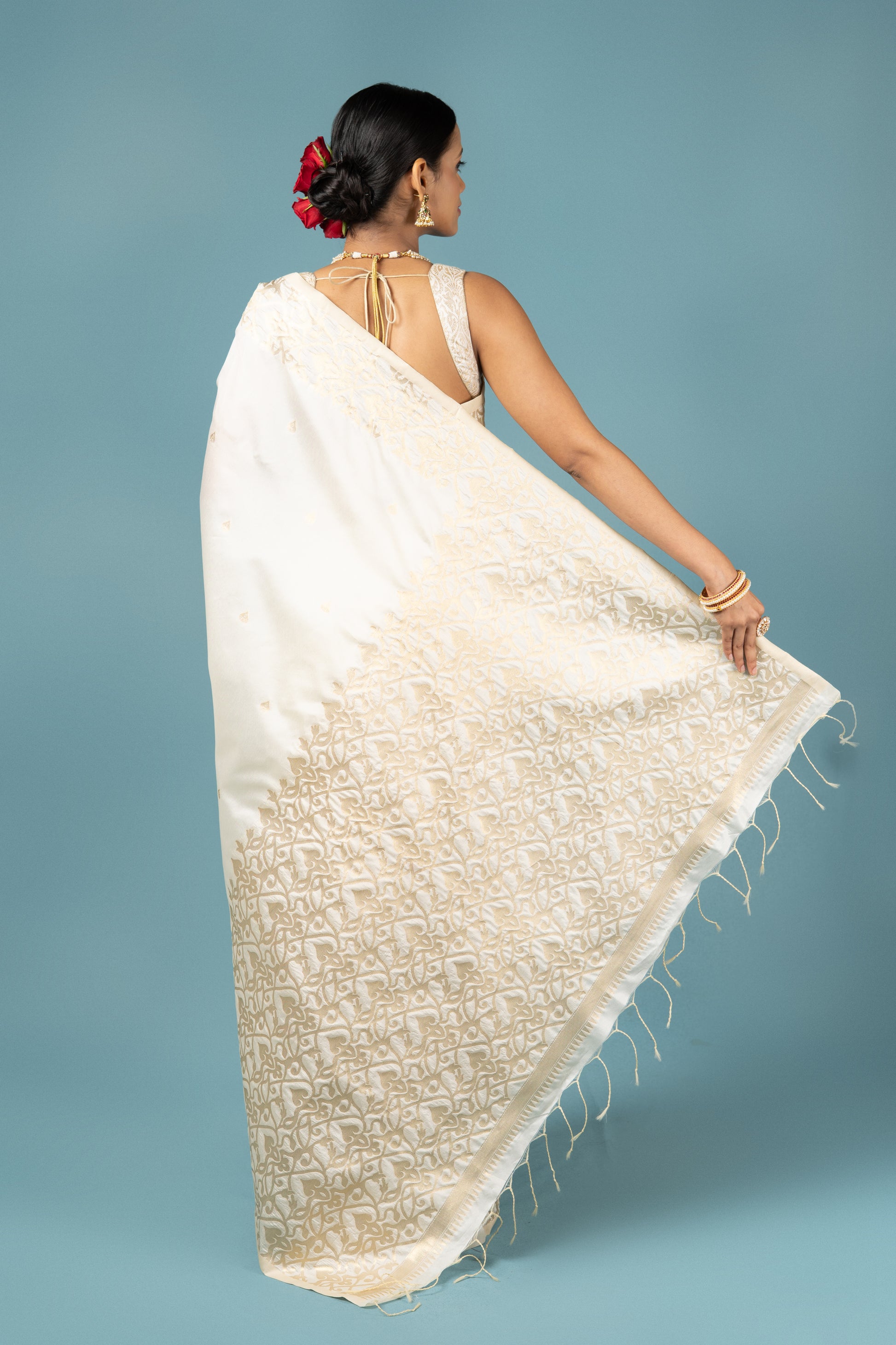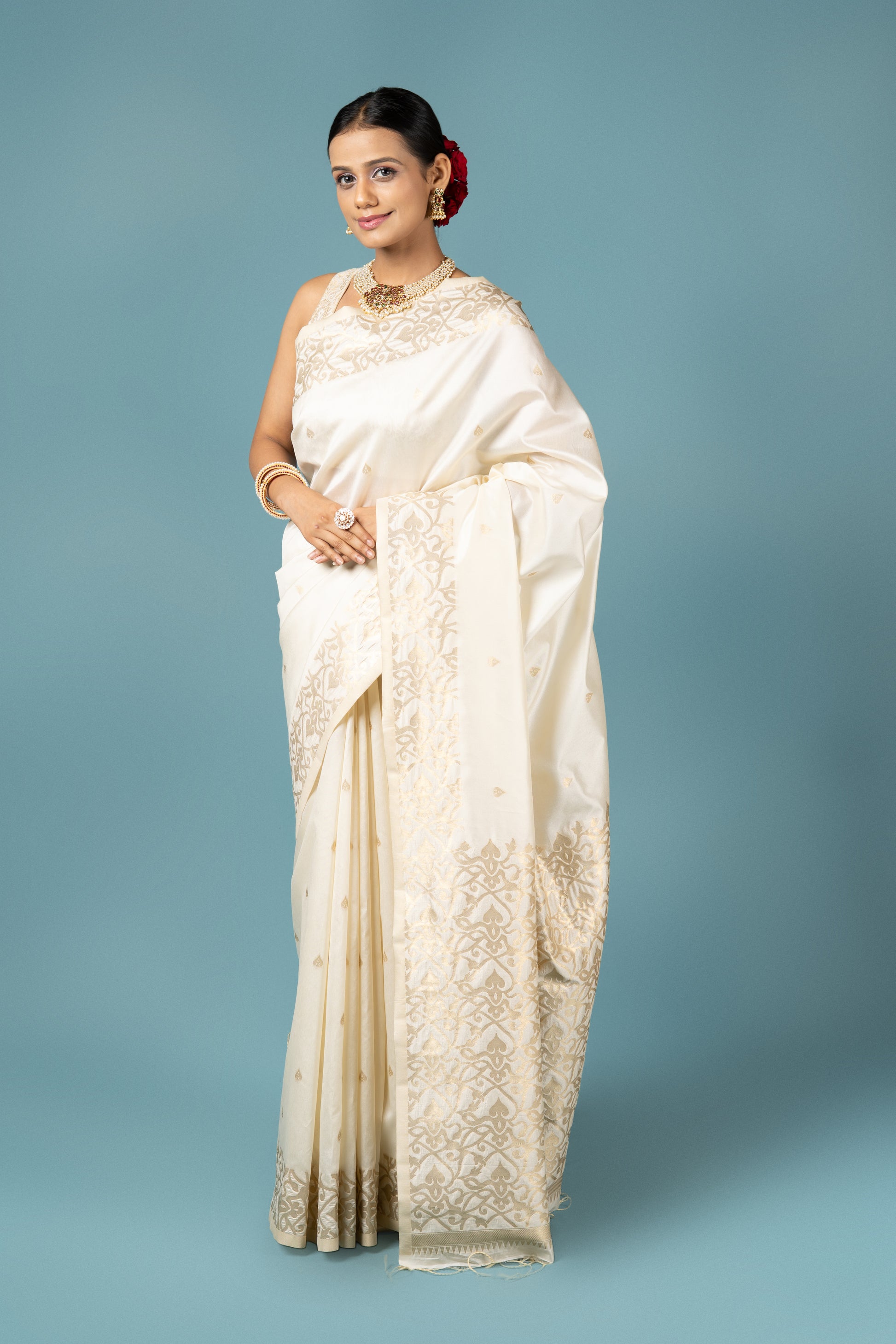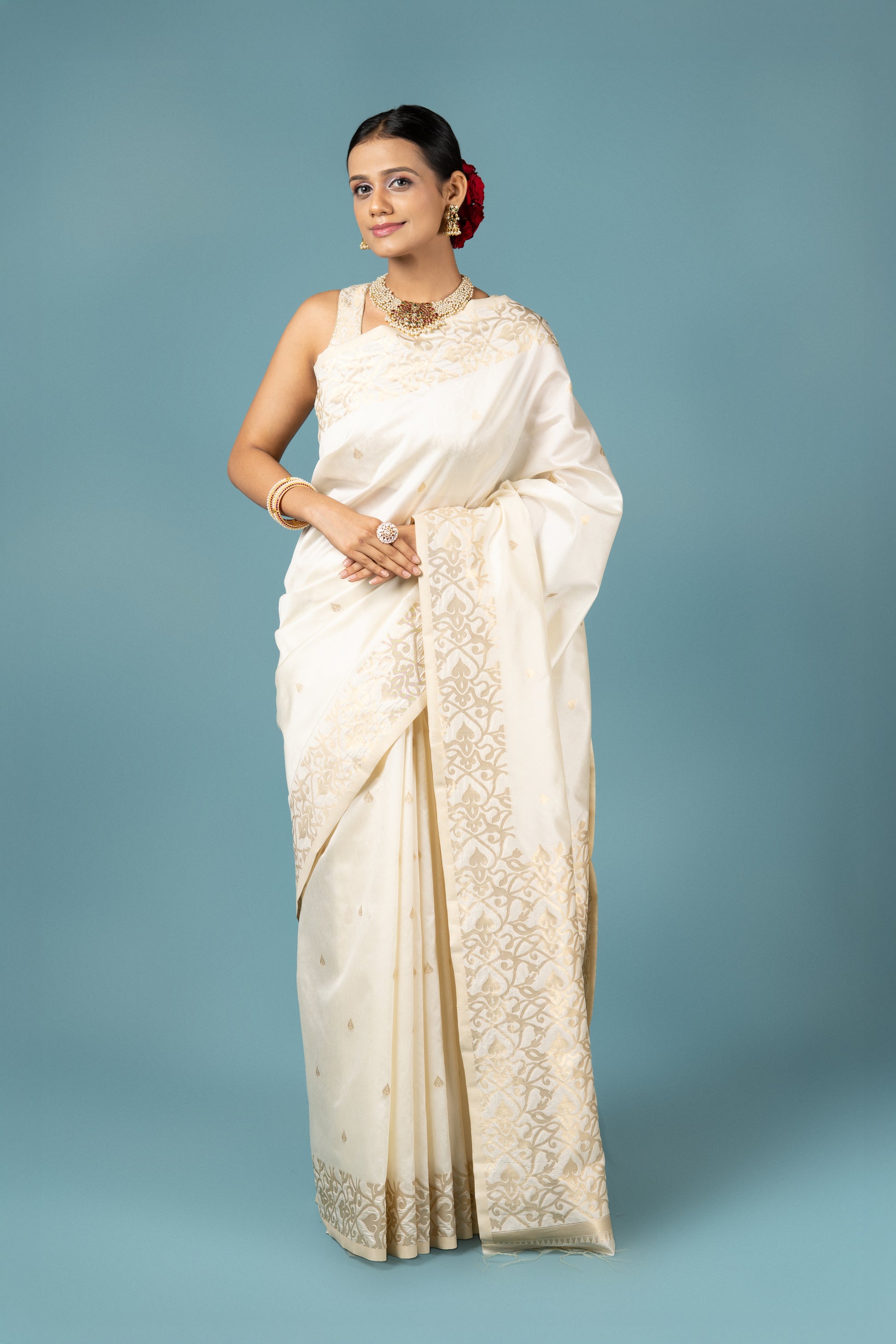 Graceful and versatile, this Cream Katan Silk Saree from Hastakala Exclusive is a perfect blend of elegance and tradition. Crafted in premium Art Silk - Katan Silk, the saree exudes a soft sheen with a refined cream base, beautifully highlighted by gold zari weaving that adds a festive touch.