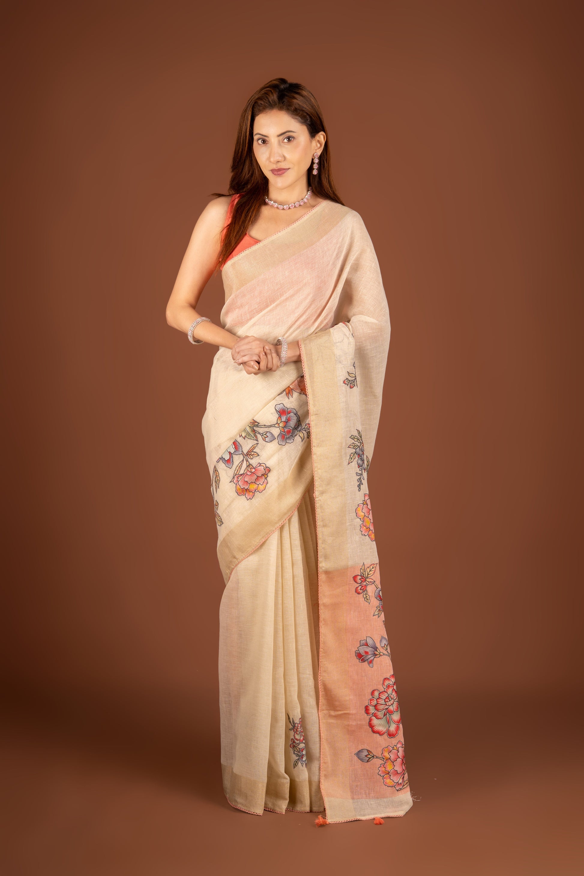 Celebrate culture and grace in this unique Cream Silk Jute Saree. Designed in fine fabric, it captures the essence of festive dressing. The perfect attire for ceremonies, pujas, or elegant nights out. Wear it with minimalist jewellery to let the saree shine.