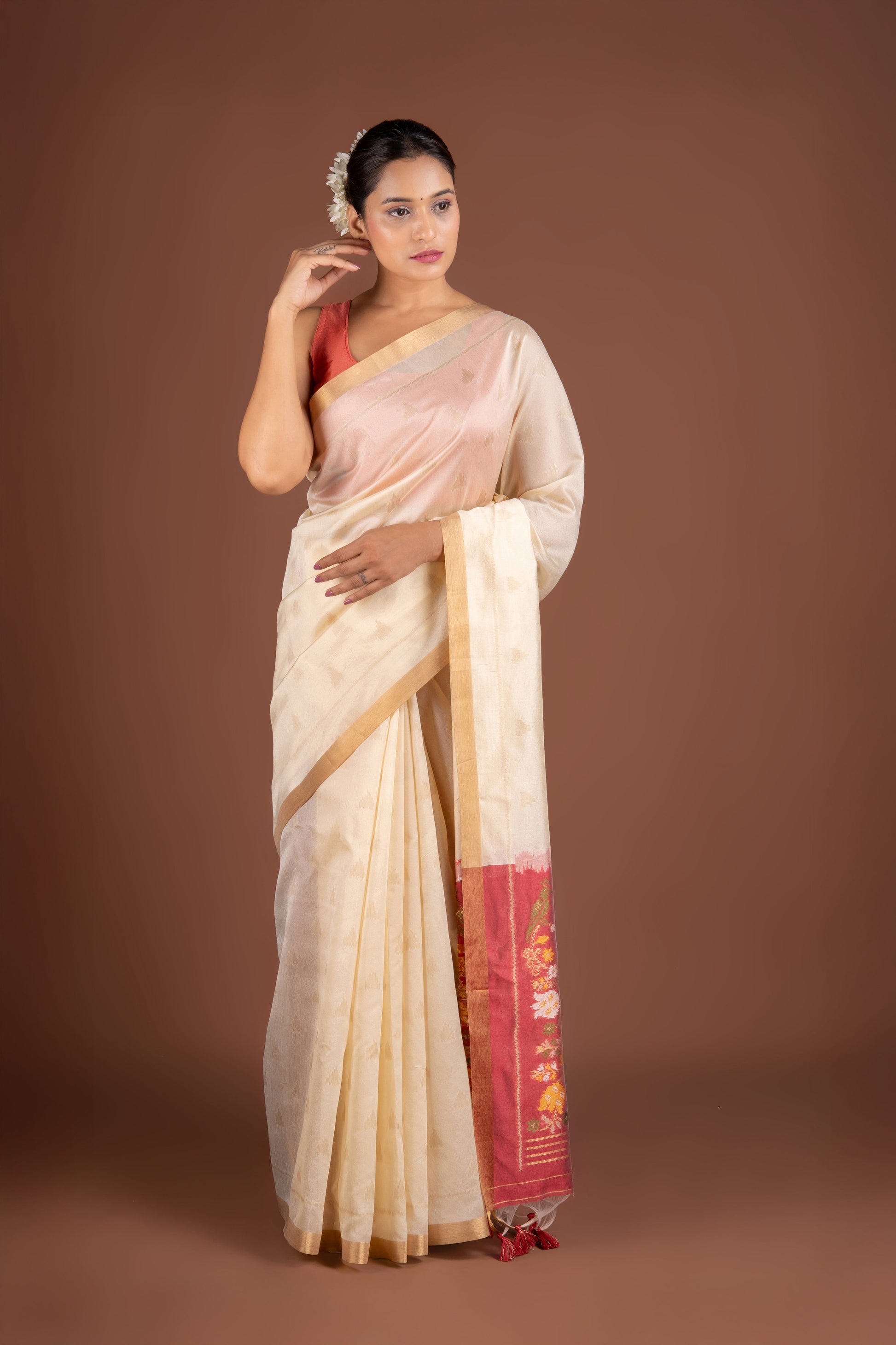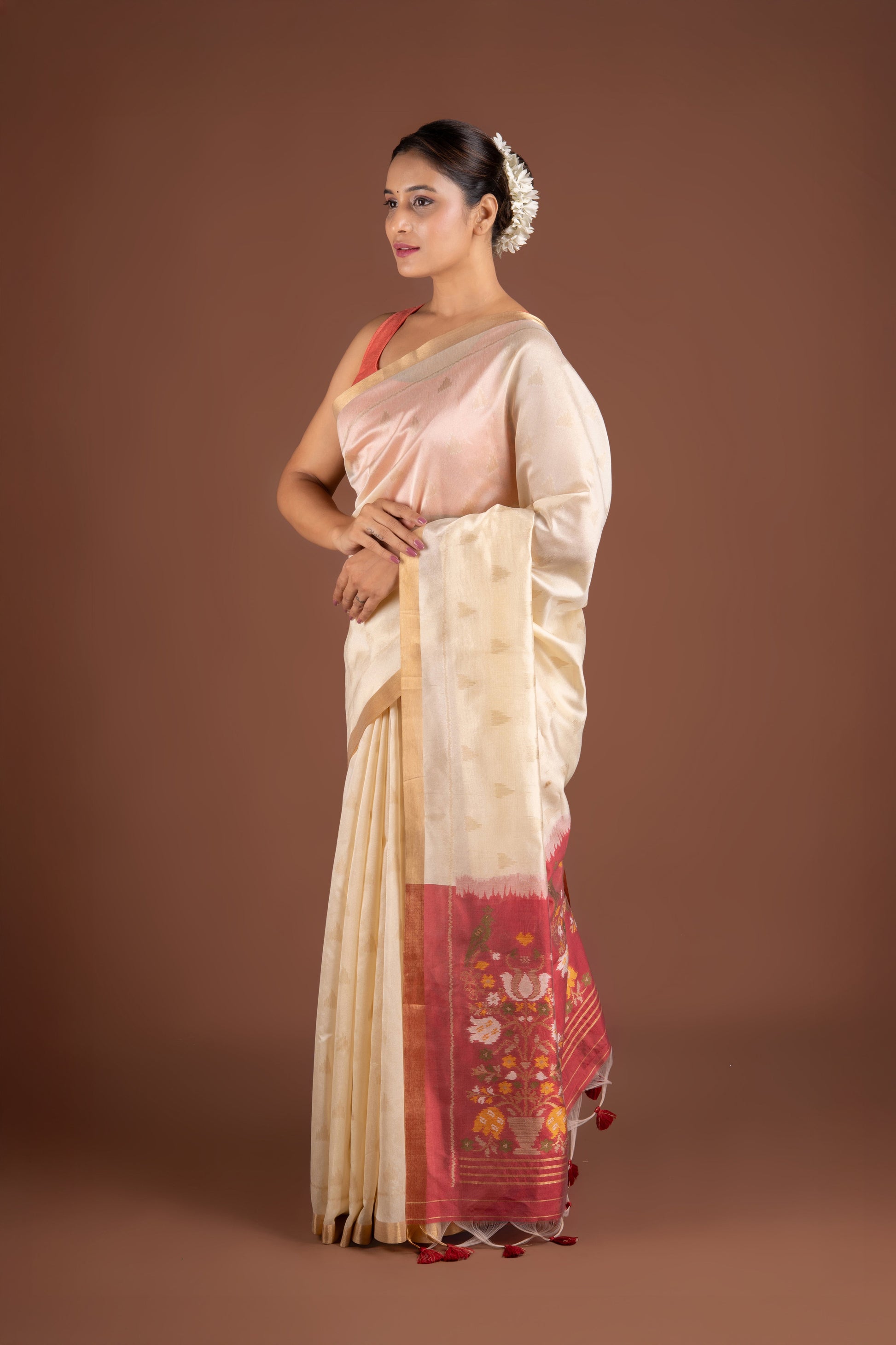 Wrap yourself in elegance with the beautifully crafted Cream Tussar Silk Saree]. Crafted with precision, its fabric ensures comfort without compromising on style. Perfect for temple visits, family functions, and seasonal festivities. Style it with gold ornaments to highlight its festive charm.