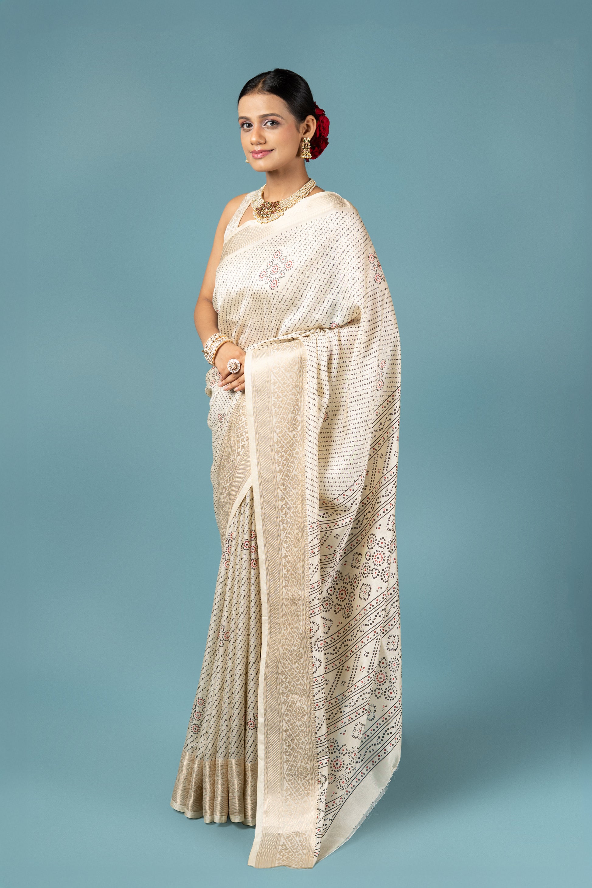 Simple and graceful, this Cream Tussar Silk Saree from Hastakala Exclusive is designed for everyday elegance. Made from Art Silk – Tussar Silk, the saree has a natural sheen and refined texture that enhances its minimal charm. The soothing cream base is highlighted with subtle gold and silver zari accents, adding just the right touch of sophistication.