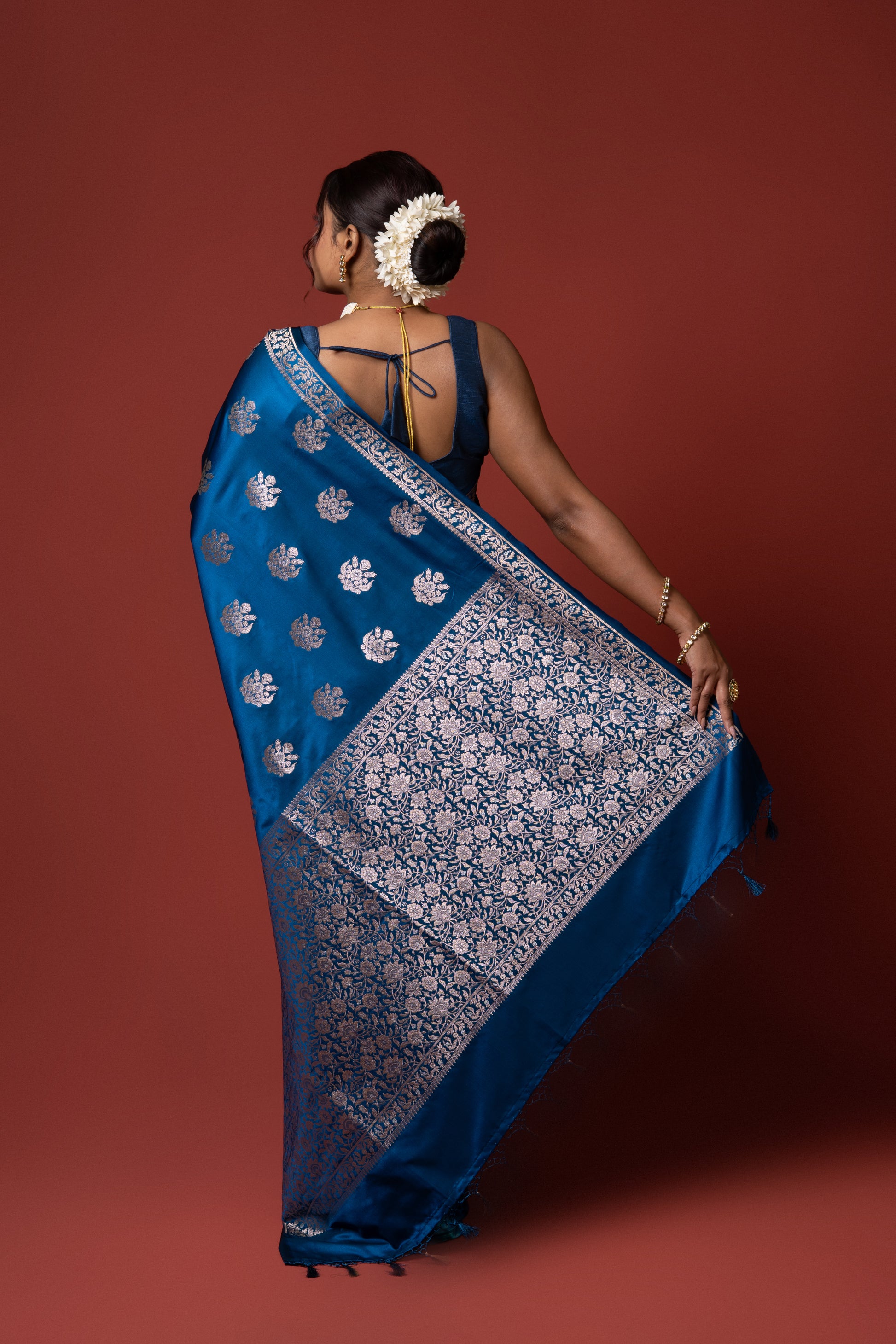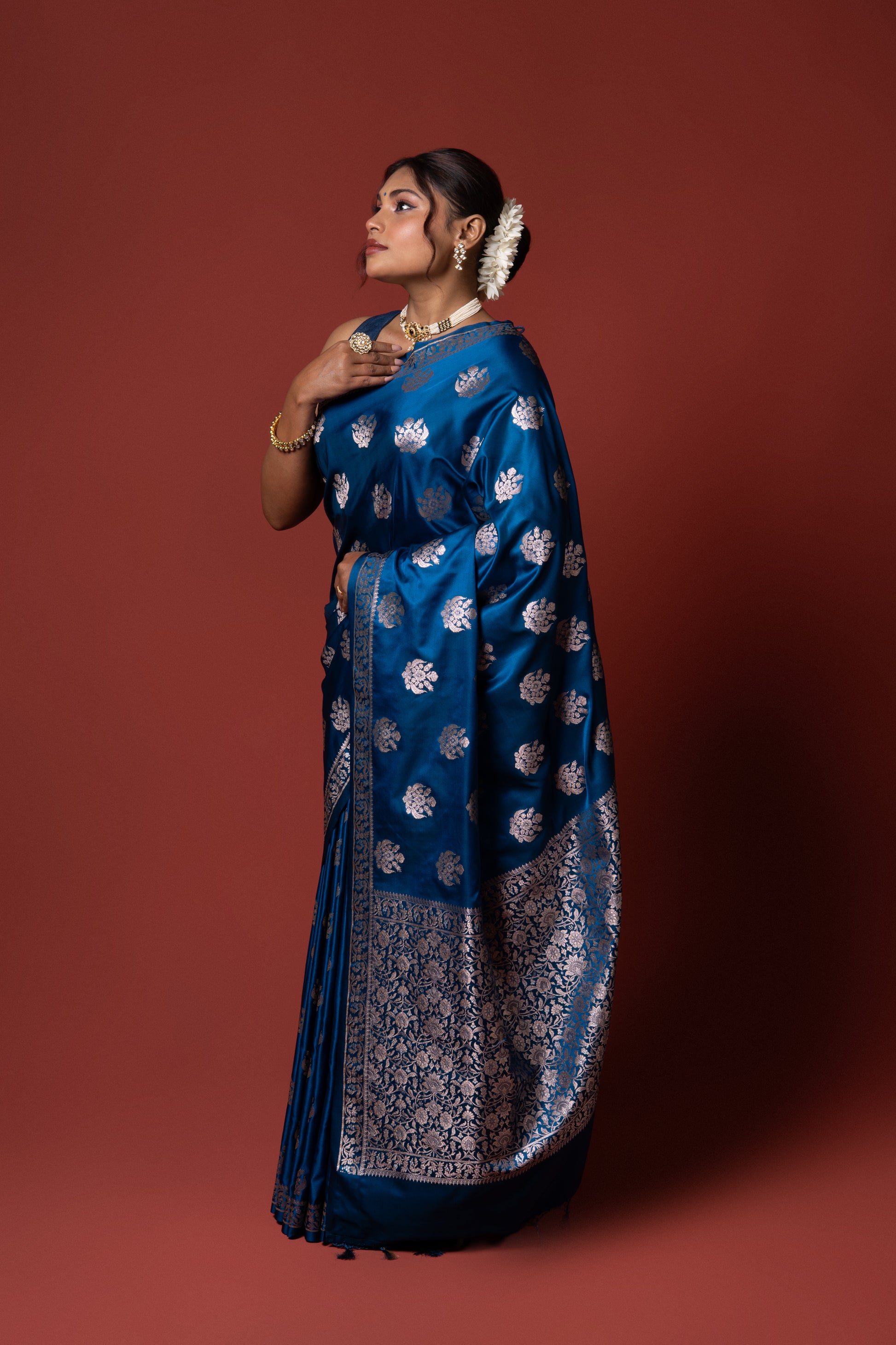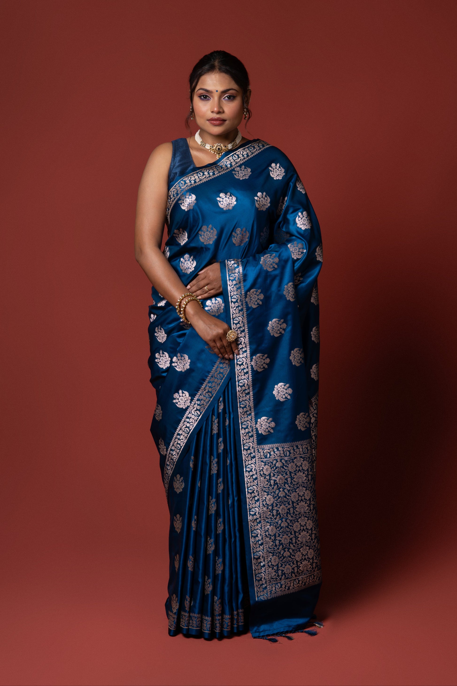 Elevate your wardrobe with our exclusive Dark Blue Katan Silk Banarasi Saree. Featuring a beautiful Dark Blue hue, this piece effortlessly blends timeless tradition with modern elegance. Ideal for festive occasions or everyday sophistication. Shop now and make it yours.