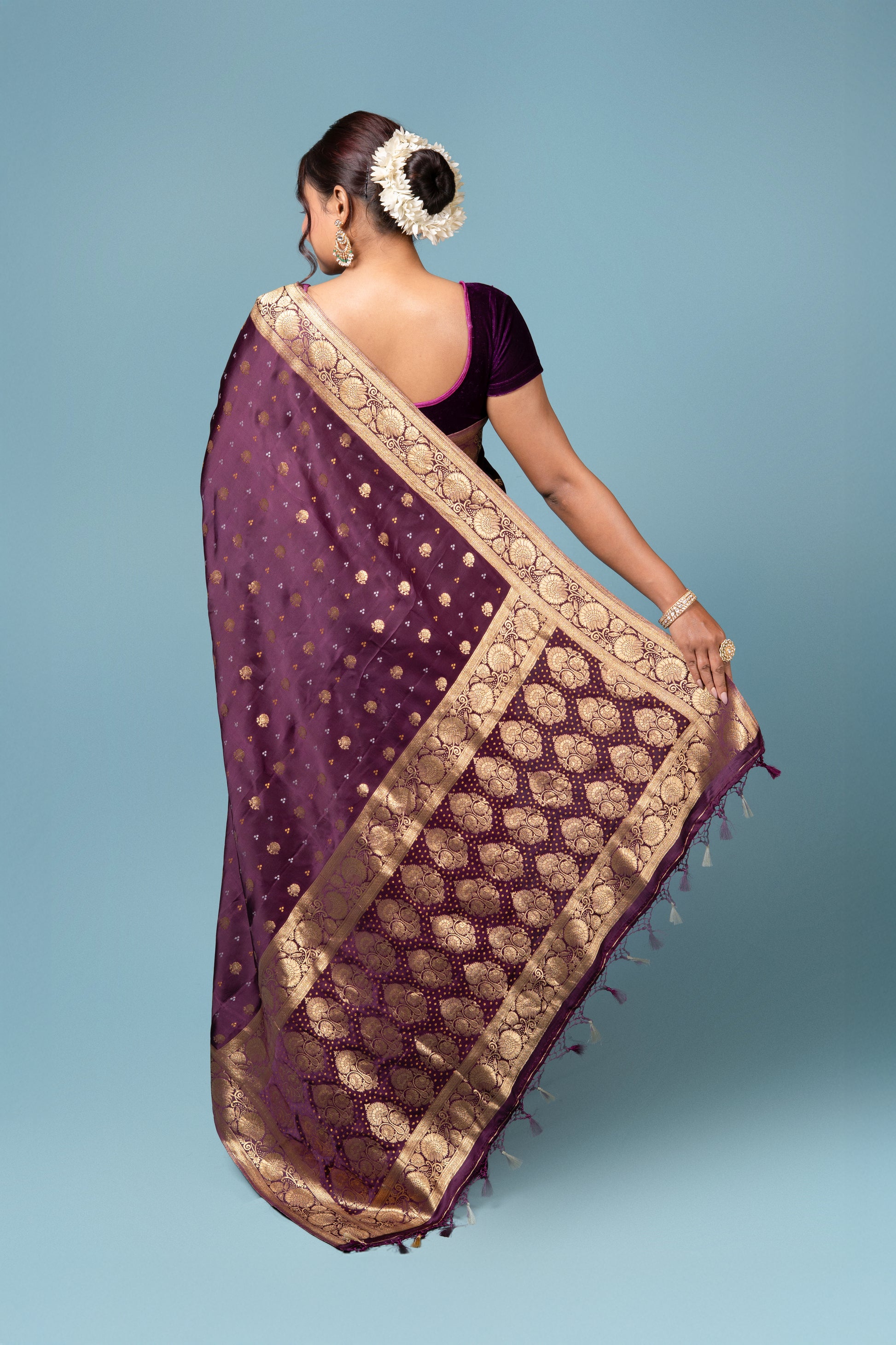 Regal and enchanting, this Dark Purple Katan Silk Saree from Hastakala Exclusive is a timeless piece designed to add grandeur to your wardrobe. Crafted from Art Silk – Satin Silk, it carries a smooth, lustrous drape that enhances its luxurious appeal. The deep dark purple base is intricately adorned with gold zari weaving, creating a rich, festive charm.