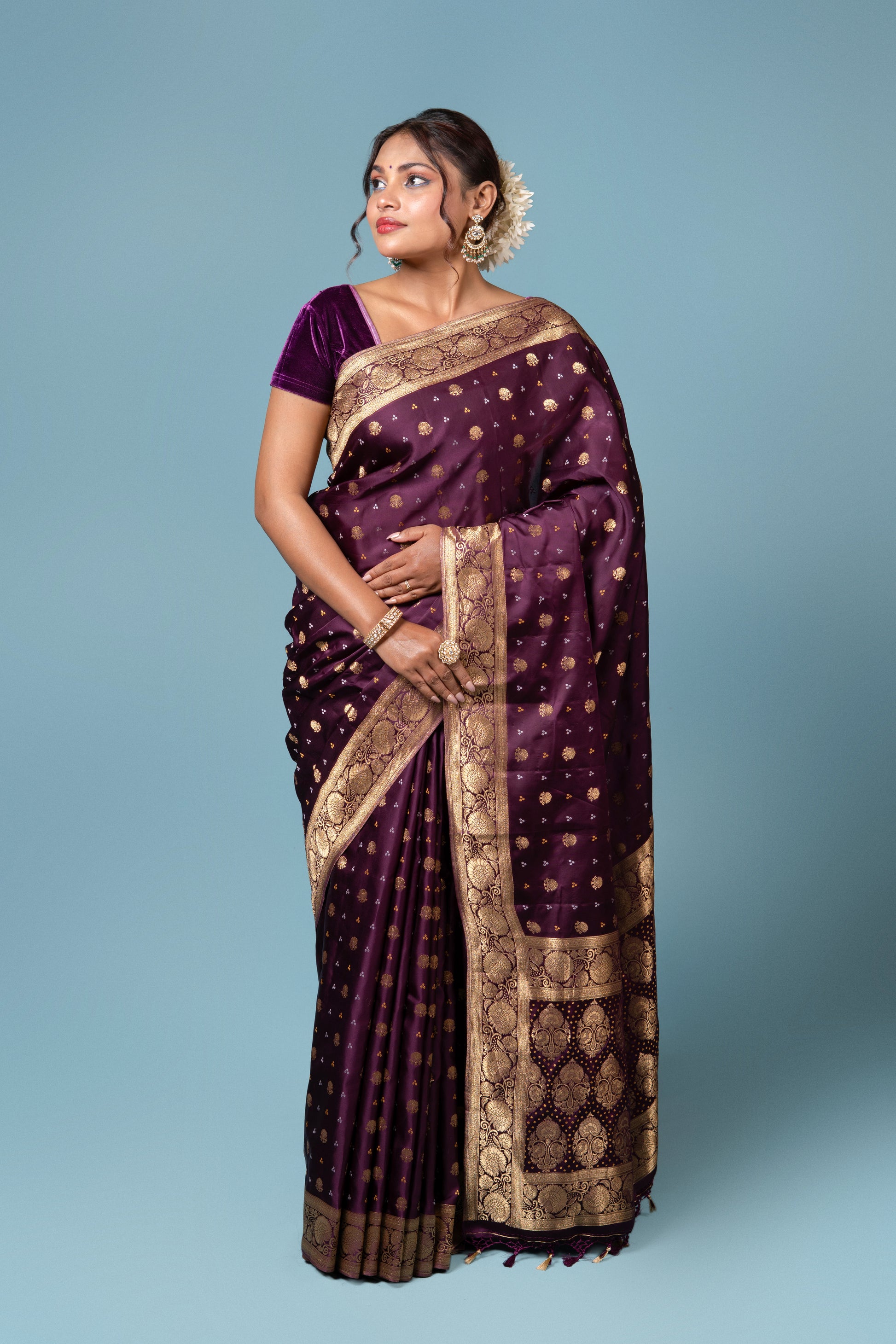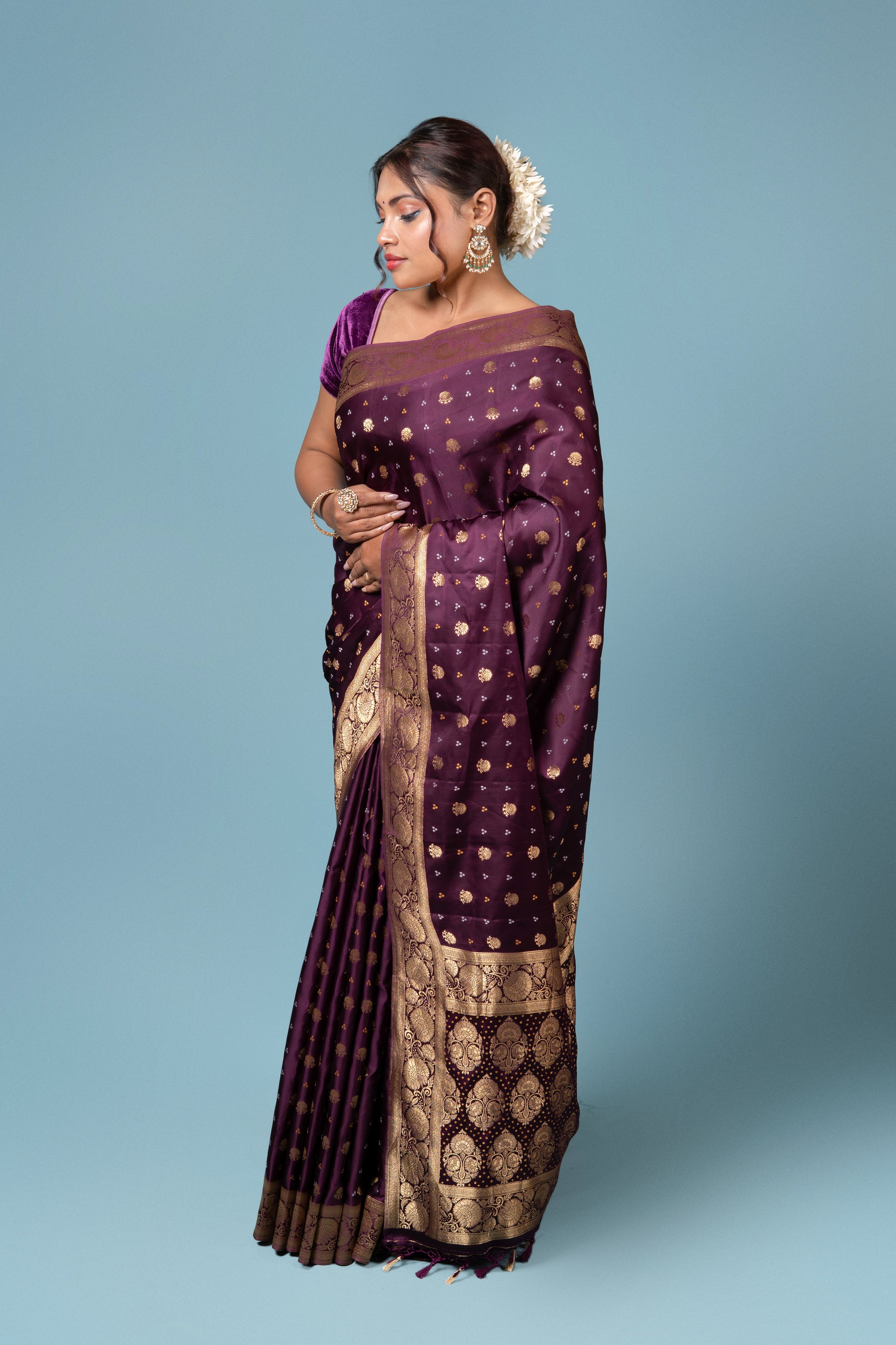 Perfect for weddings, puja ceremonies, and grand celebrations, this saree strikes the ideal balance of tradition and elegance. The matching dark purple blouse piece completes the ensemble, offering endless styling possibilities with traditional jewelry for a royal finish.