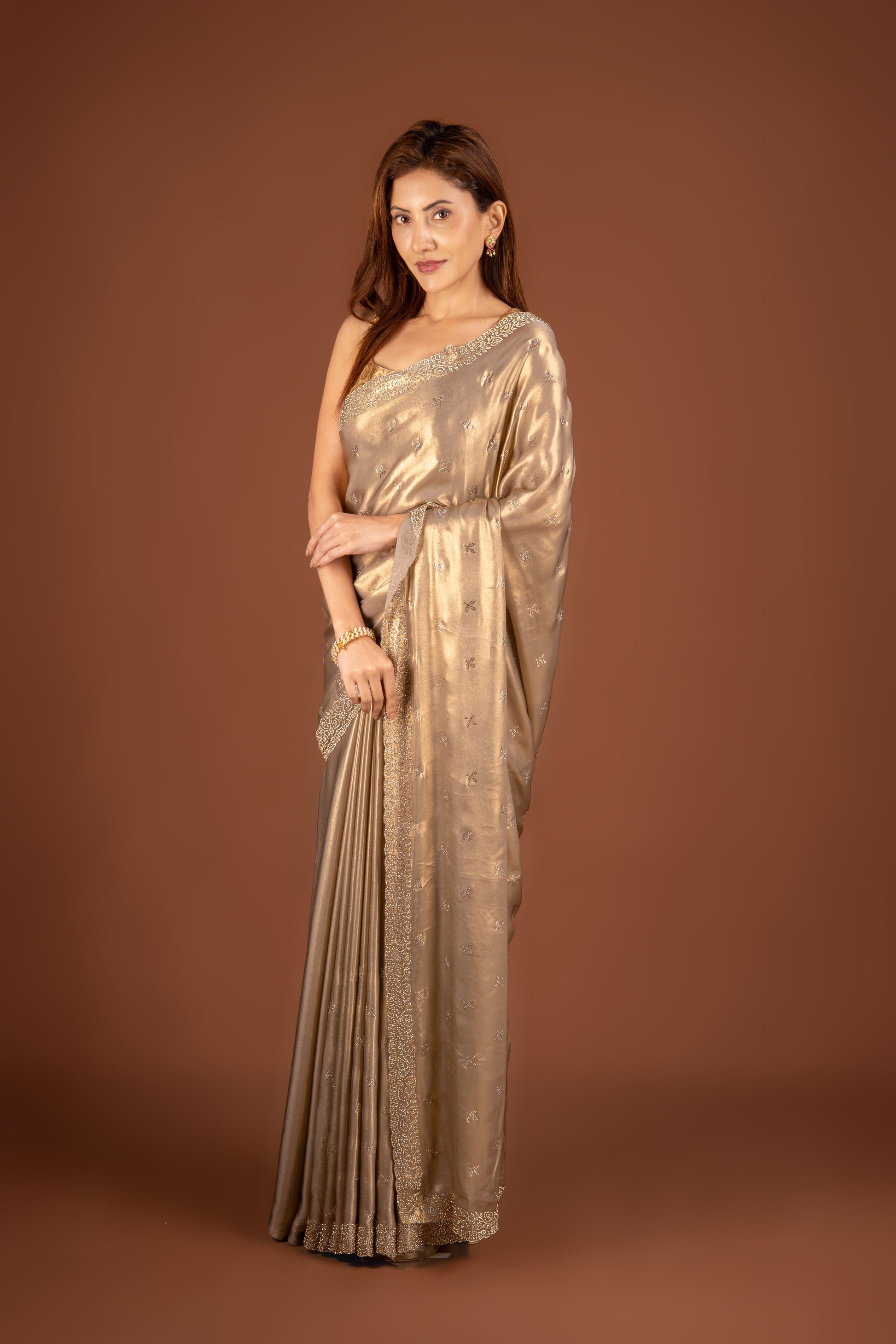 Add sophistication to your festive collection with this Gold Georgette Saree With Stonework. Its premium material ensures both durability and unmatched elegance. Great for festive wear, adding charm to your special moments. Accentuate with bold accessories for a contemporary twist.