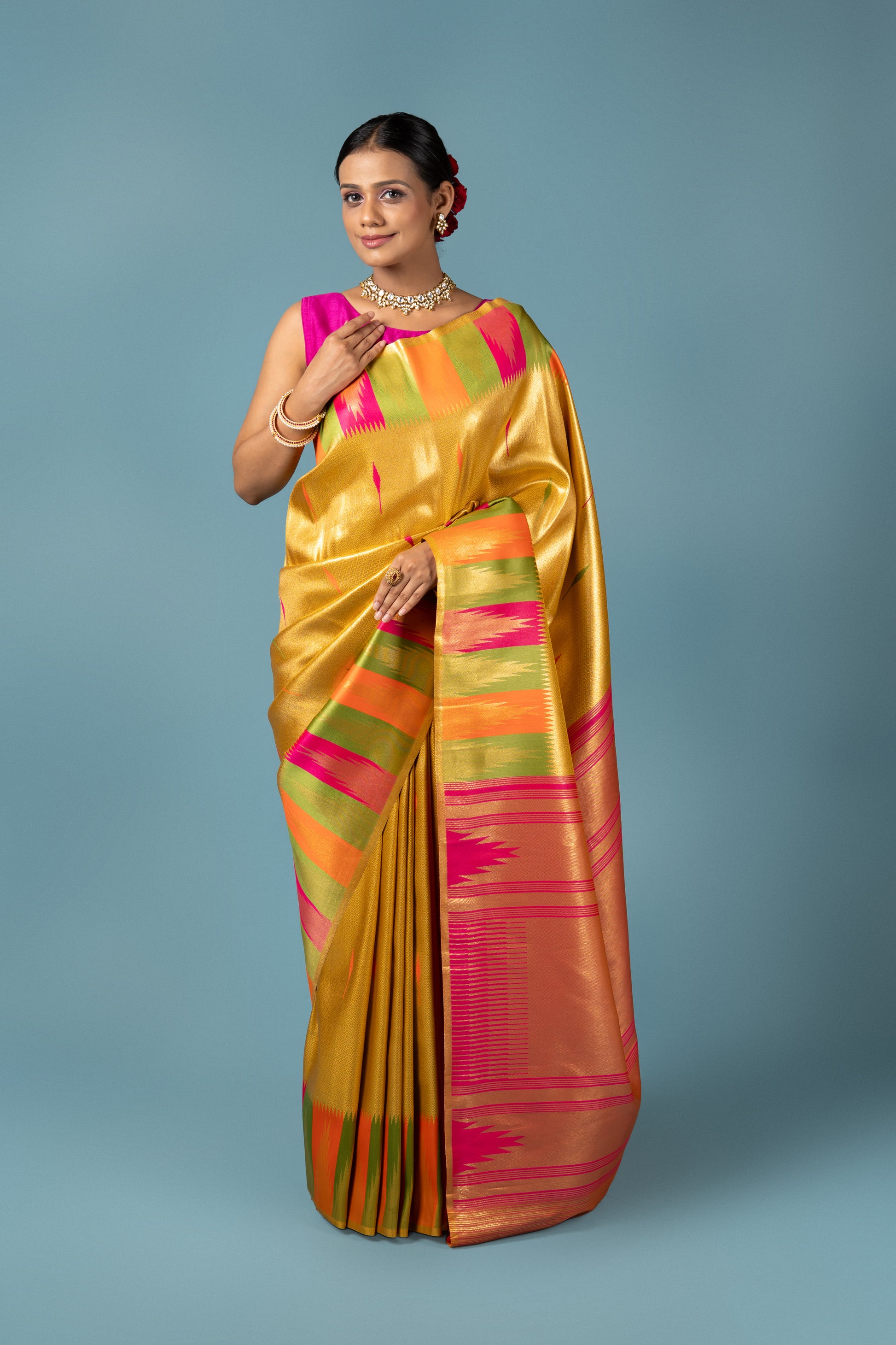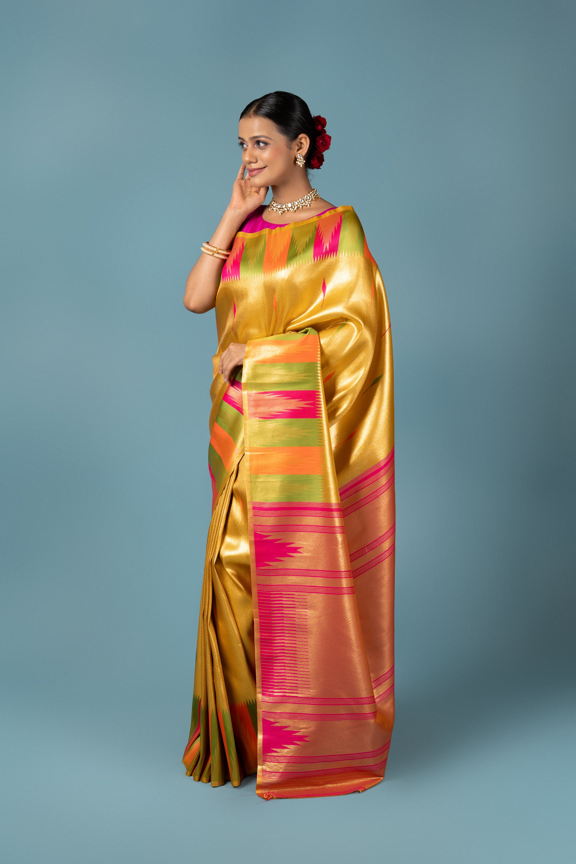 Radiant and timeless, this Gold Tissue Silk Saree from the Traditional Collection is a perfect choice for festive and puja occasions. Crafted in Art Silk – Tissue Silk, the saree has a rich, lustrous texture that reflects elegance in every drape. The gold zari weaving enhances its regal charm, making it ideal for celebrations and spiritual gatherings alike.