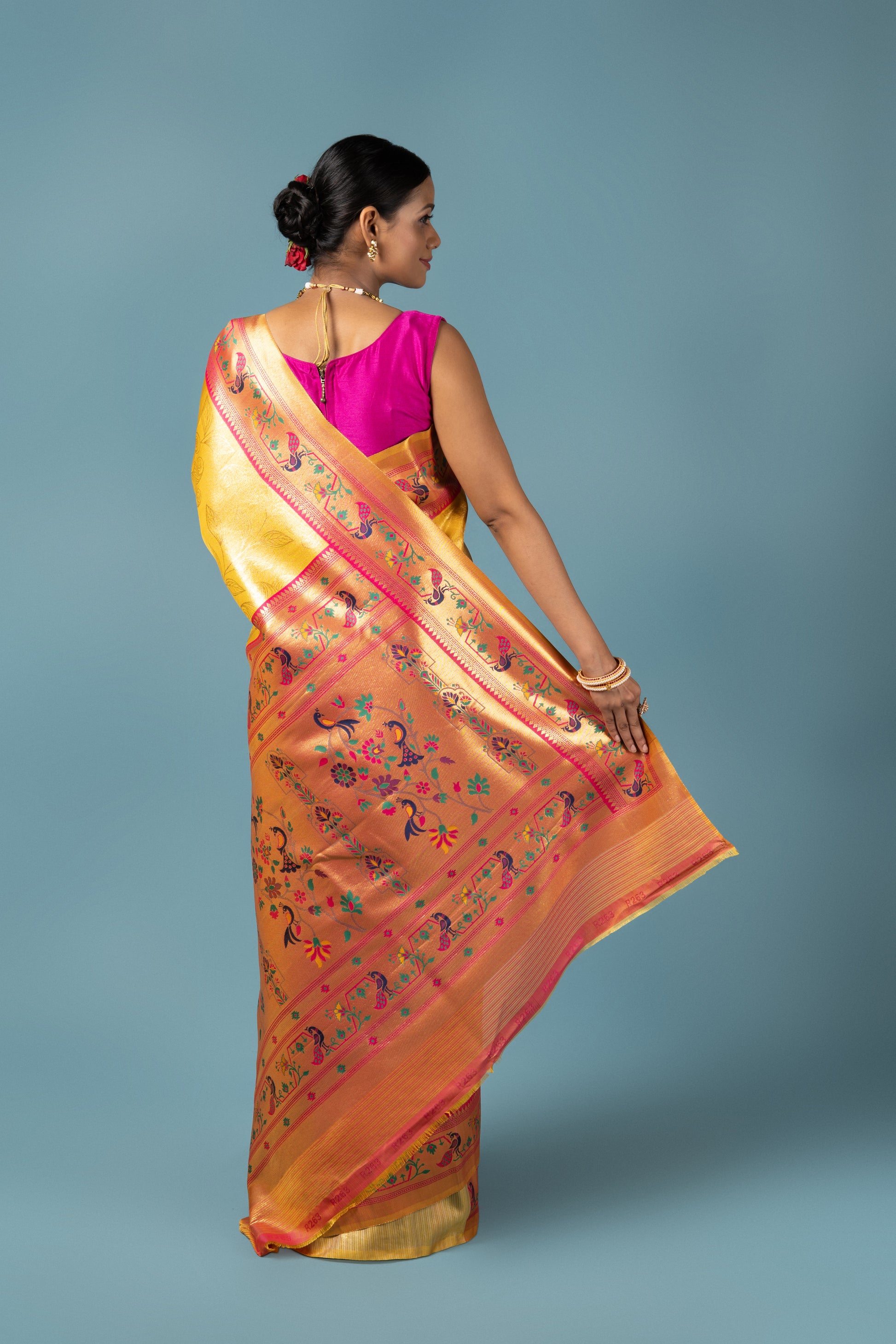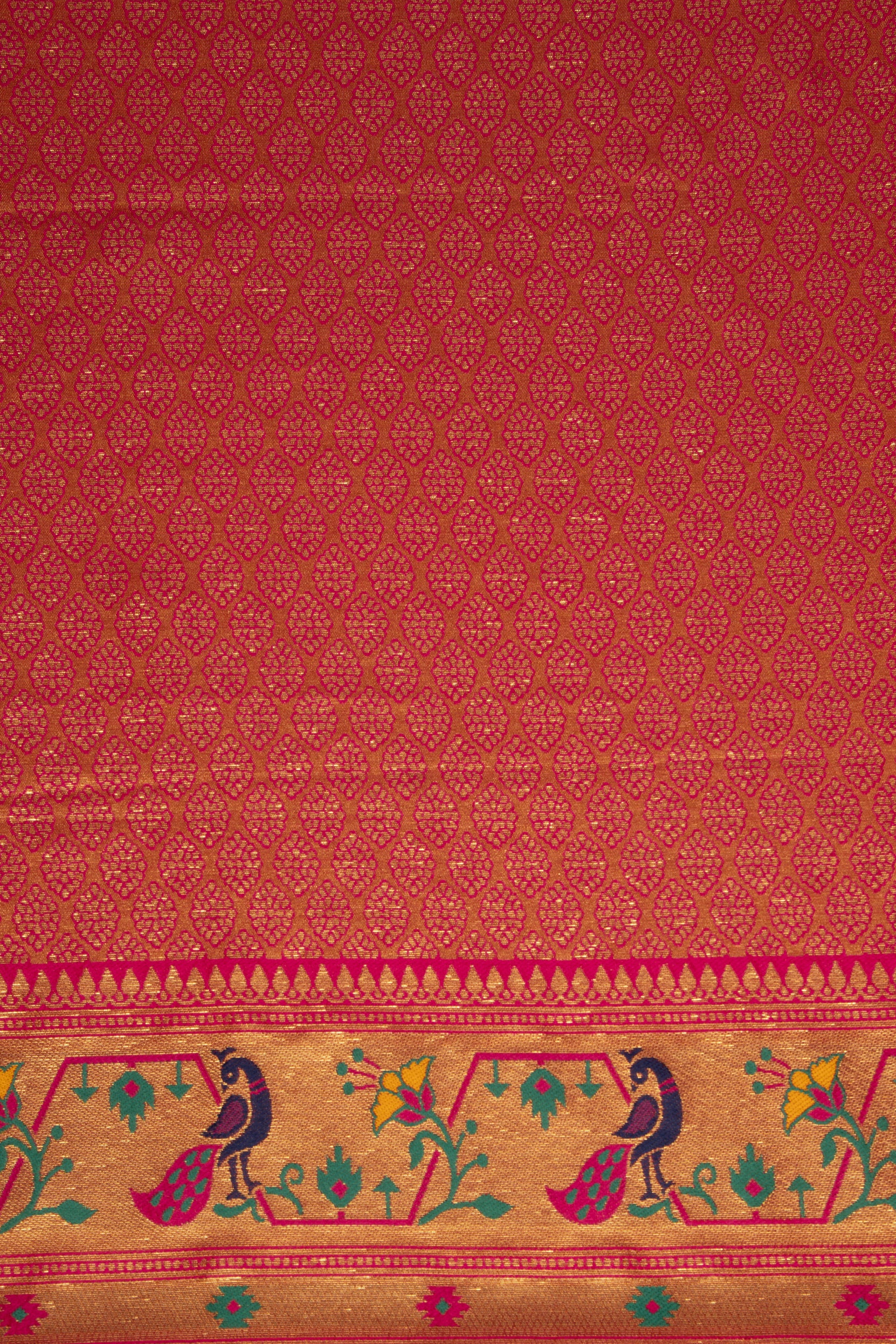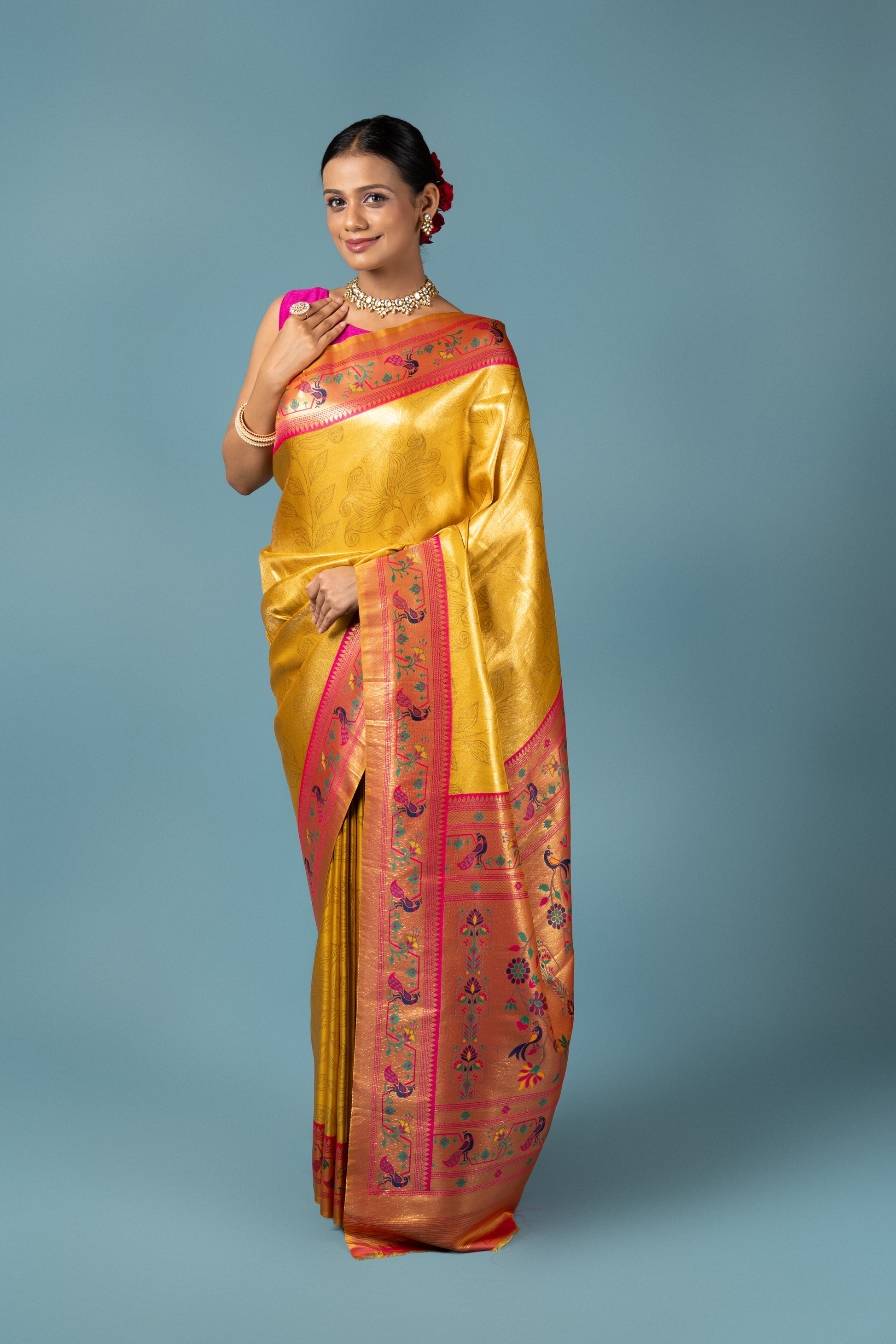 What sets this saree apart is its dual-tone gold and rani pink blouse piece, offering versatile styling options. Choose the subtle gold blouse for a classic monochrome look or the vibrant rani pink for a striking contrast. Either way, this saree ensures you stand out with elegance and tradition.