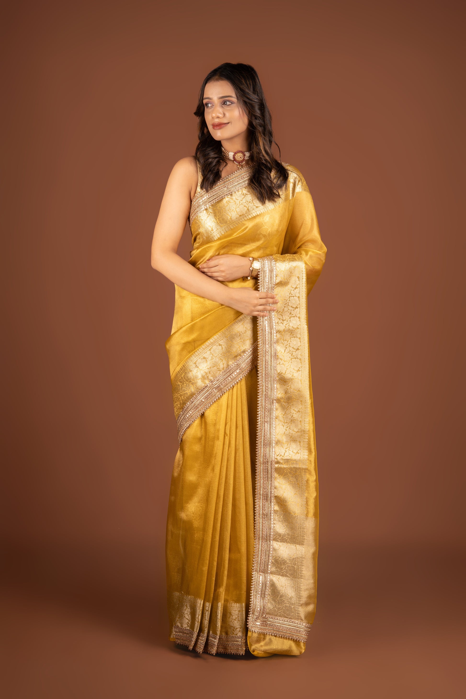 Turn heads at any celebration with this charming Gold Tissue Silk Saree. The high-quality weave provides a fluid drape and an elegant fall. Suited for traditional rituals, engagements, and festive evenings. Complement it with elegant bangles and earrings for a regal finish.