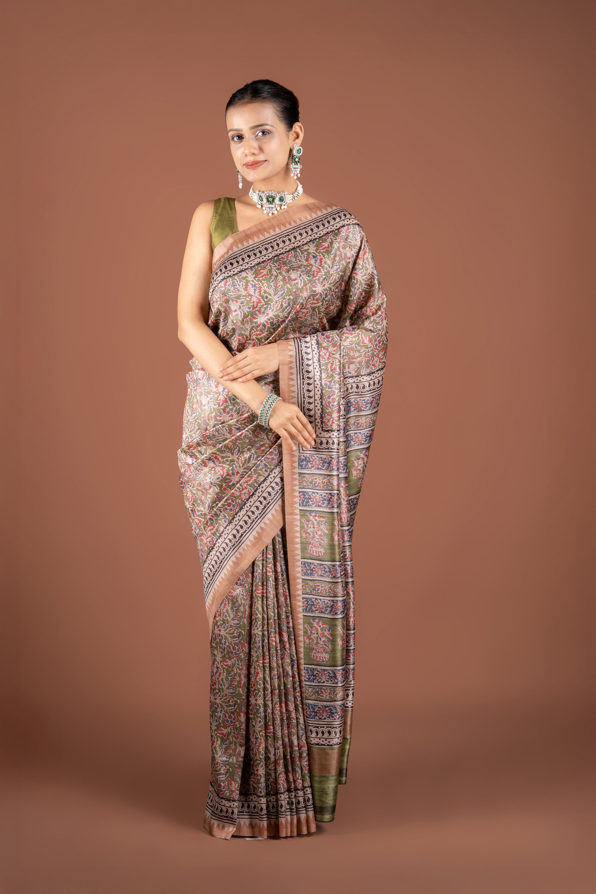 Step into grandeur with the finely detailed Green Dupion Silk Saree with Floral Print. The fabric is lightweight yet regal, making it versatile for all-day wear. Designed for occasions where elegance and grace matter most. Team it with pearls for a refined and classic appeal.
