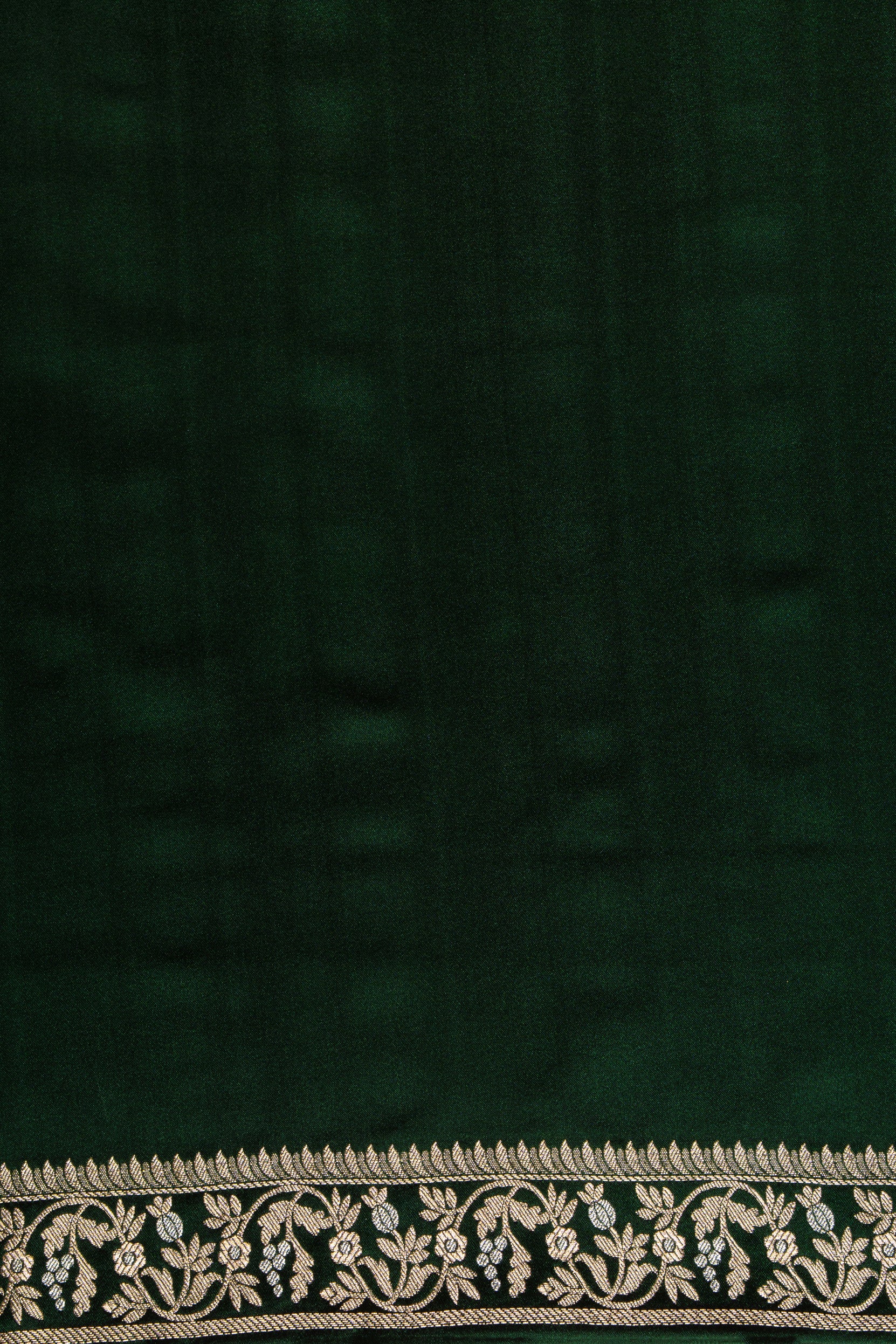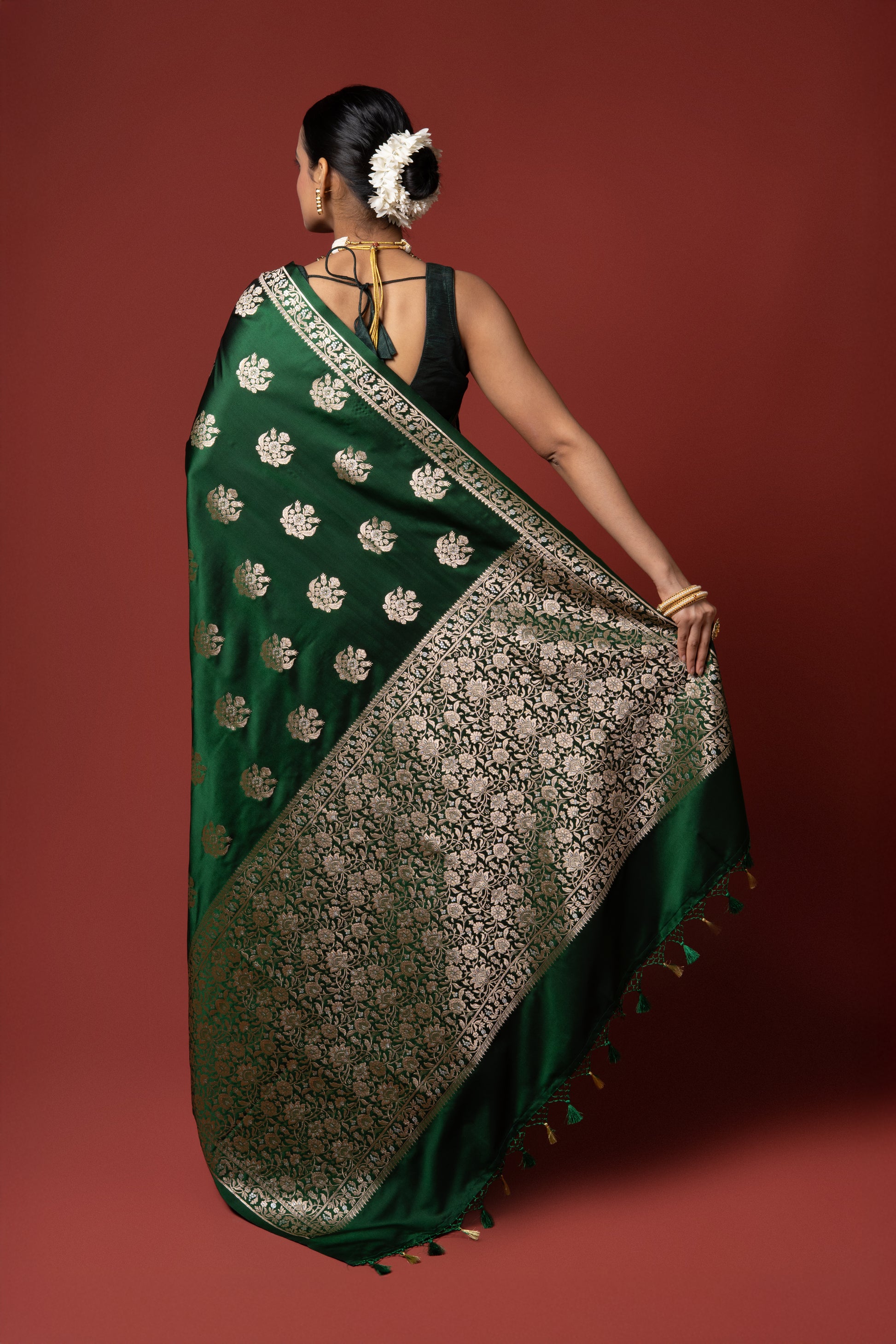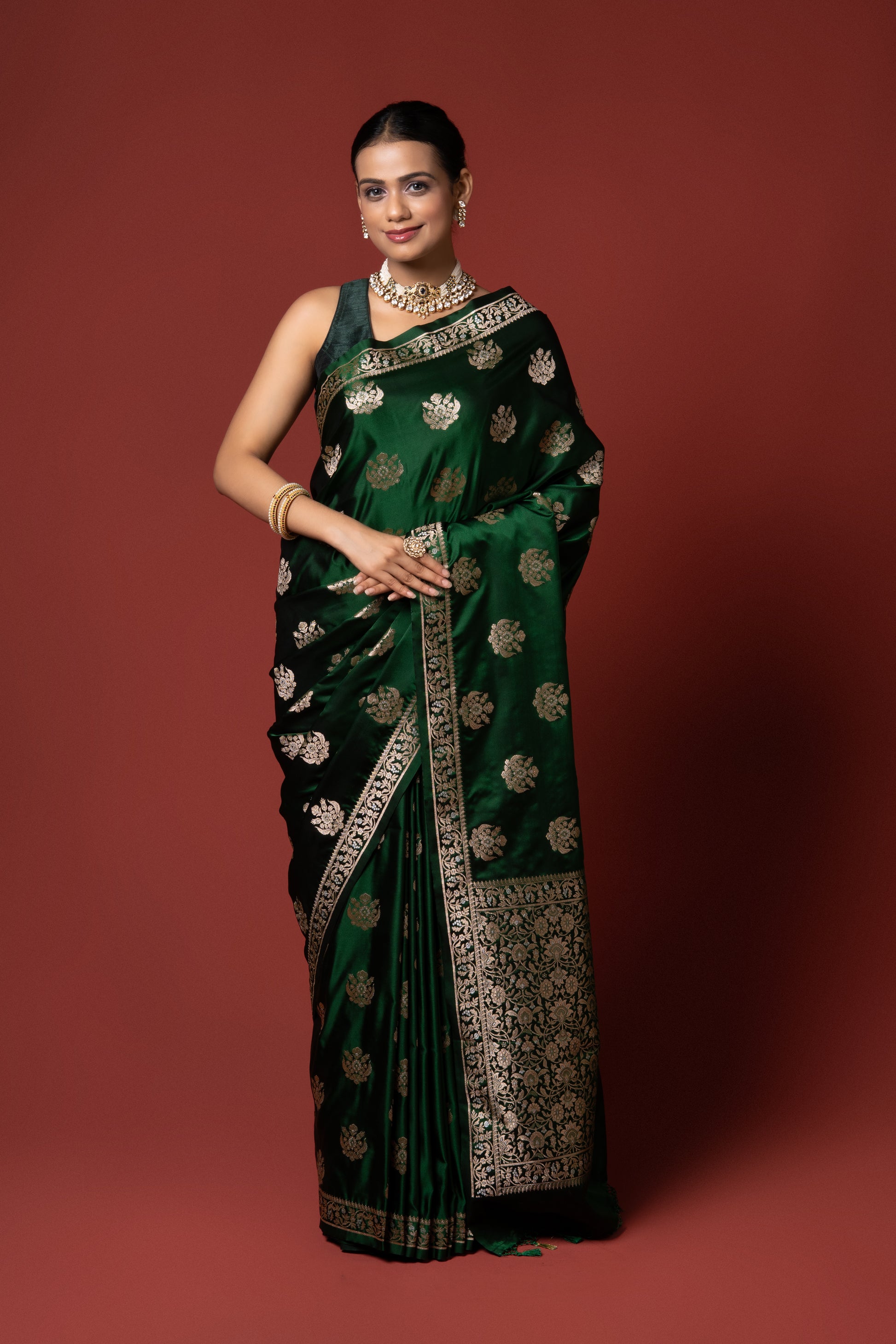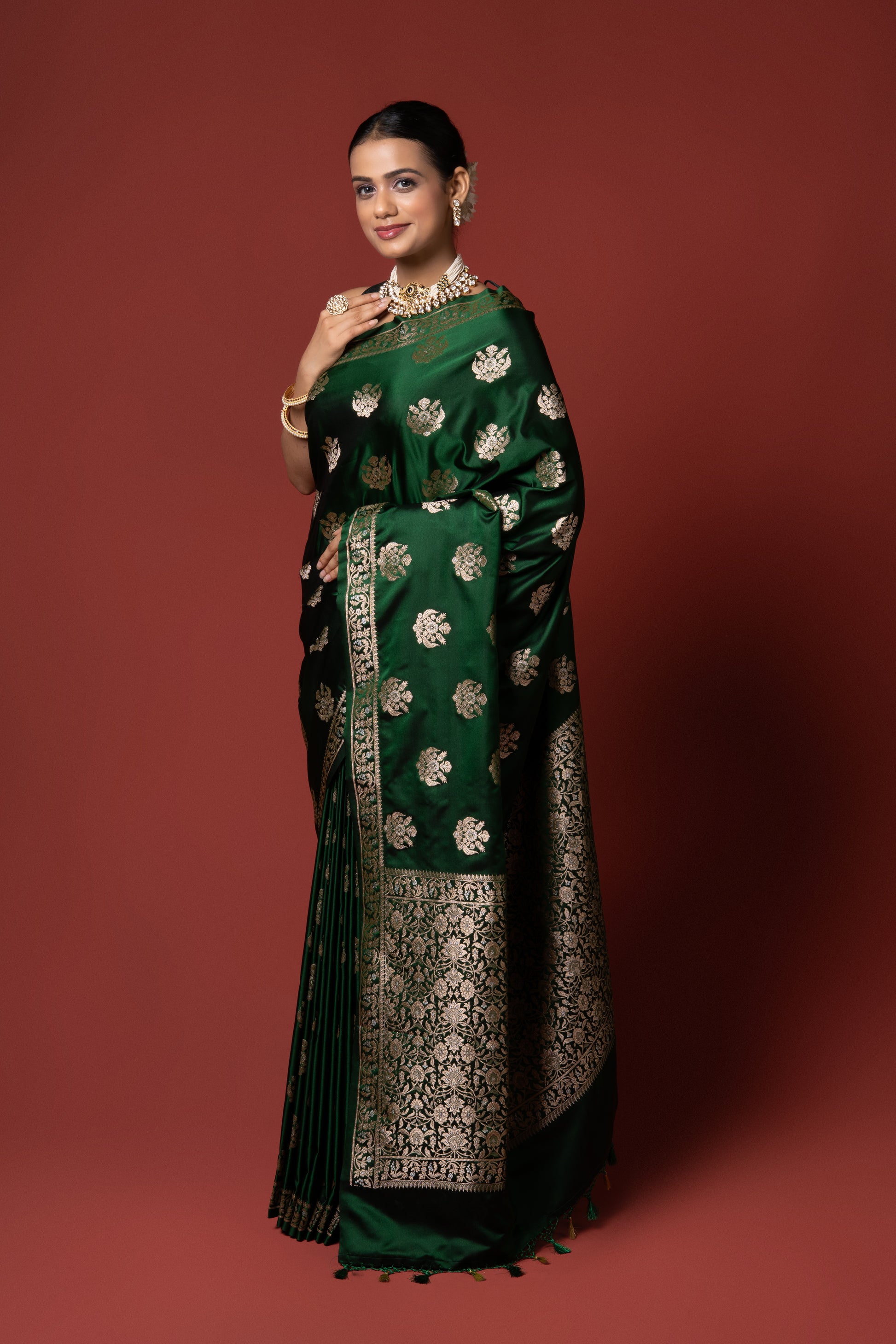 The saree comes with a matching green blouse piece, completing the ensemble with elegance. Perfect for puja ceremonies, weddings, and even farewell occasions, this Banarasi drape is designed to make you look graceful while keeping heritage craftsmanship alive.