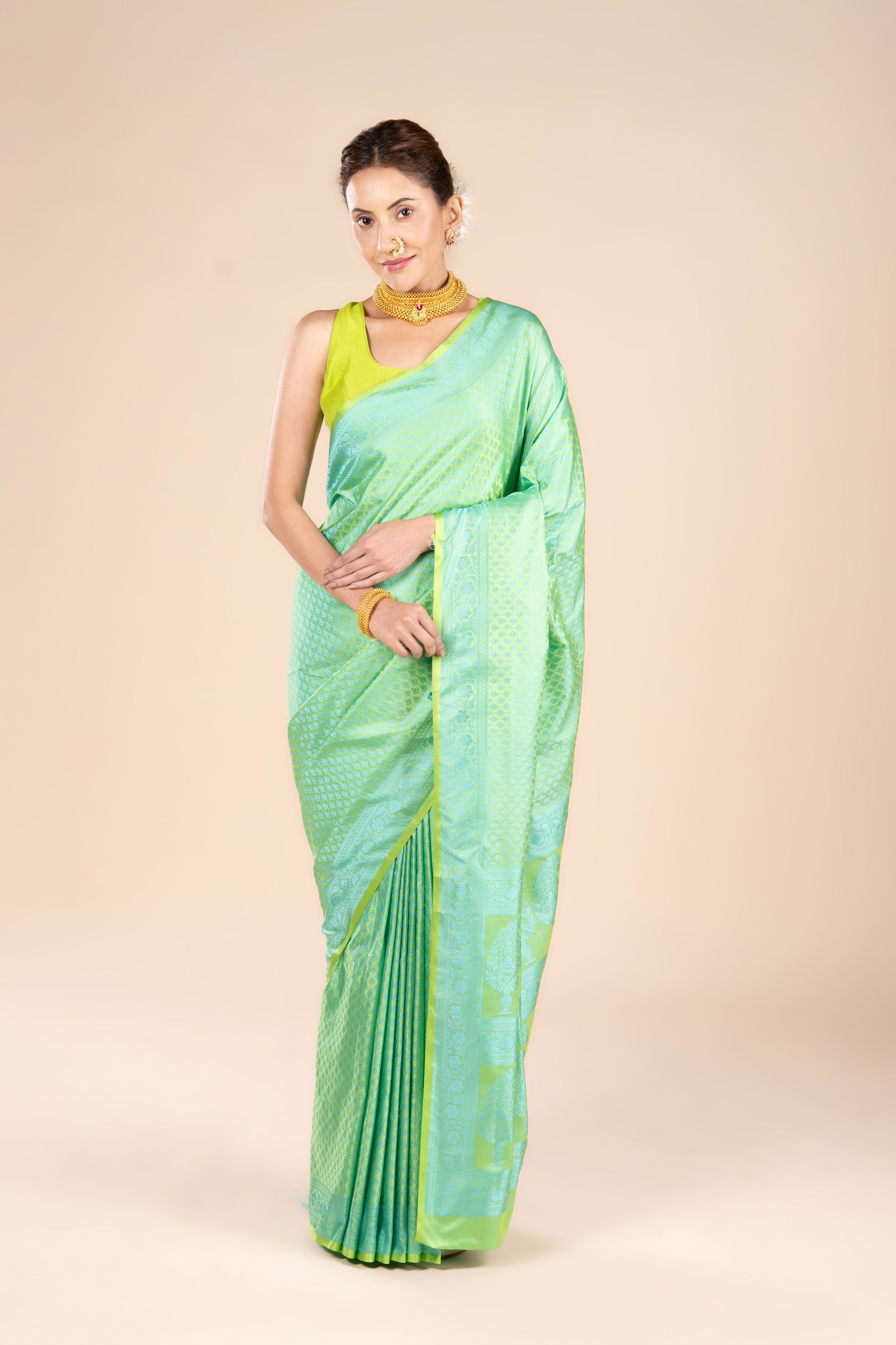 Wrap yourself in elegance with the beautifully crafted Green Soft Silk Banarasi Saree. Crafted with precision, its fabric ensures comfort without compromising on style. Perfect for temple visits, family functions, and seasonal festivities. Style it with gold ornaments to highlight its festive charm.