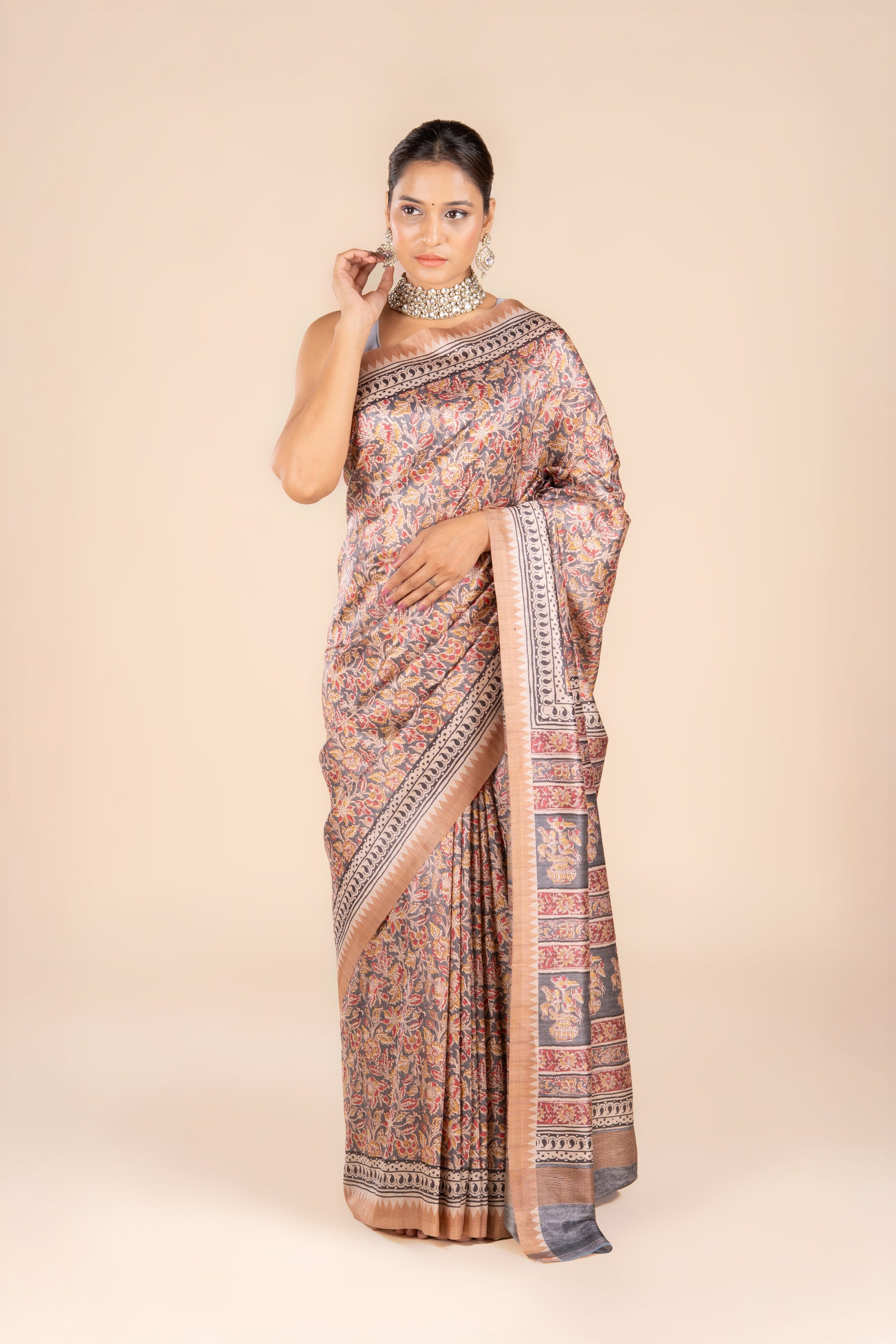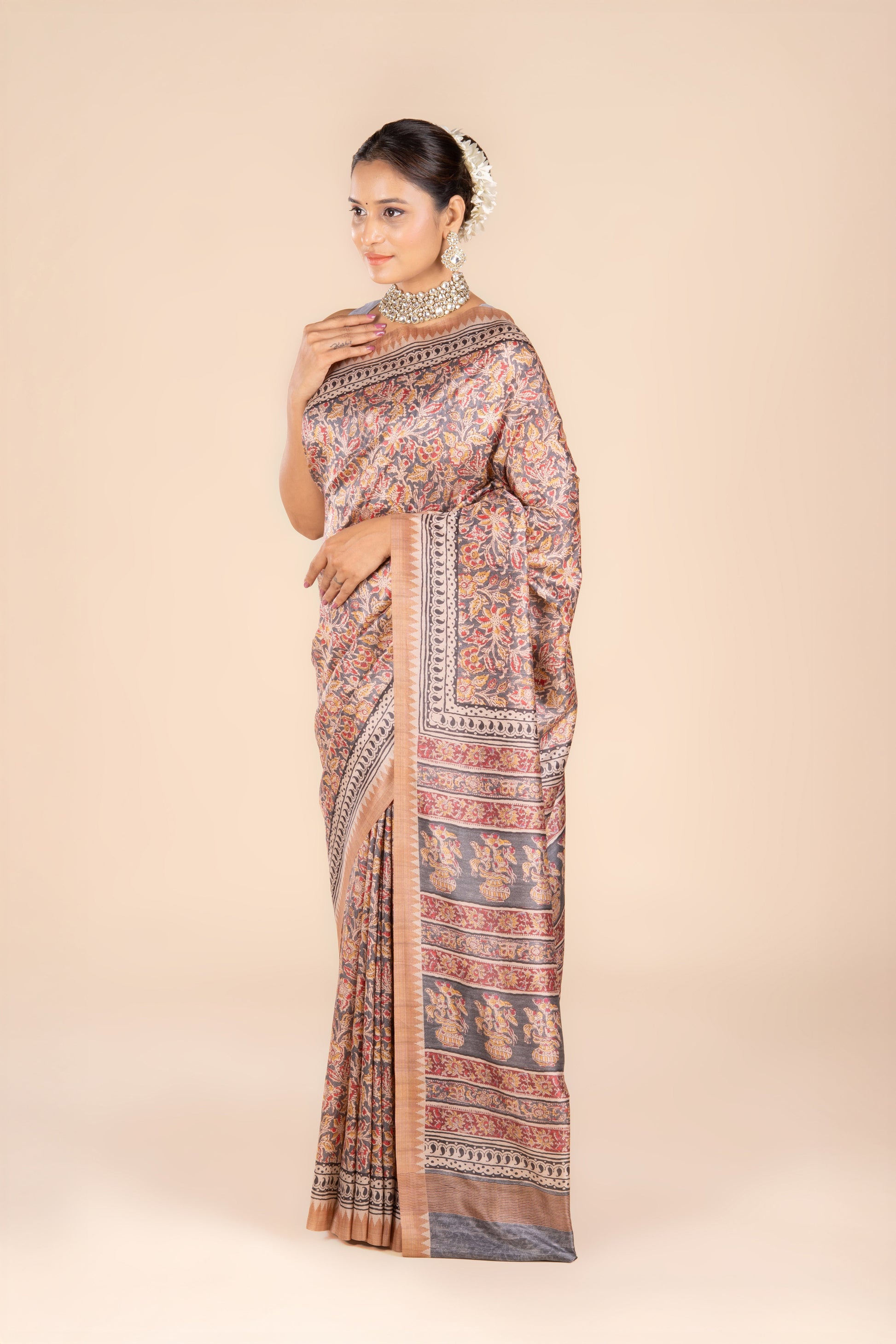 Wrap yourself in elegance with the beautifully crafted Grey Dupion Silk Saree with Floral Print. Crafted with precision, its fabric ensures comfort without compromising on style. Perfect for temple visits, family functions, and seasonal festivities. Style it with gold ornaments to highlight its festive charm.