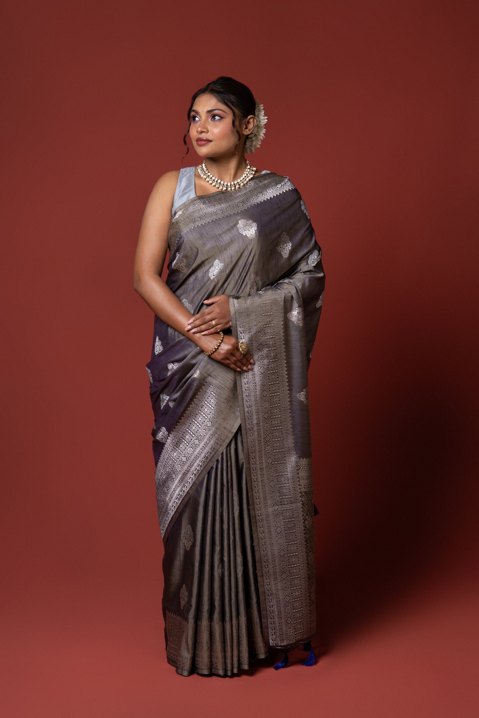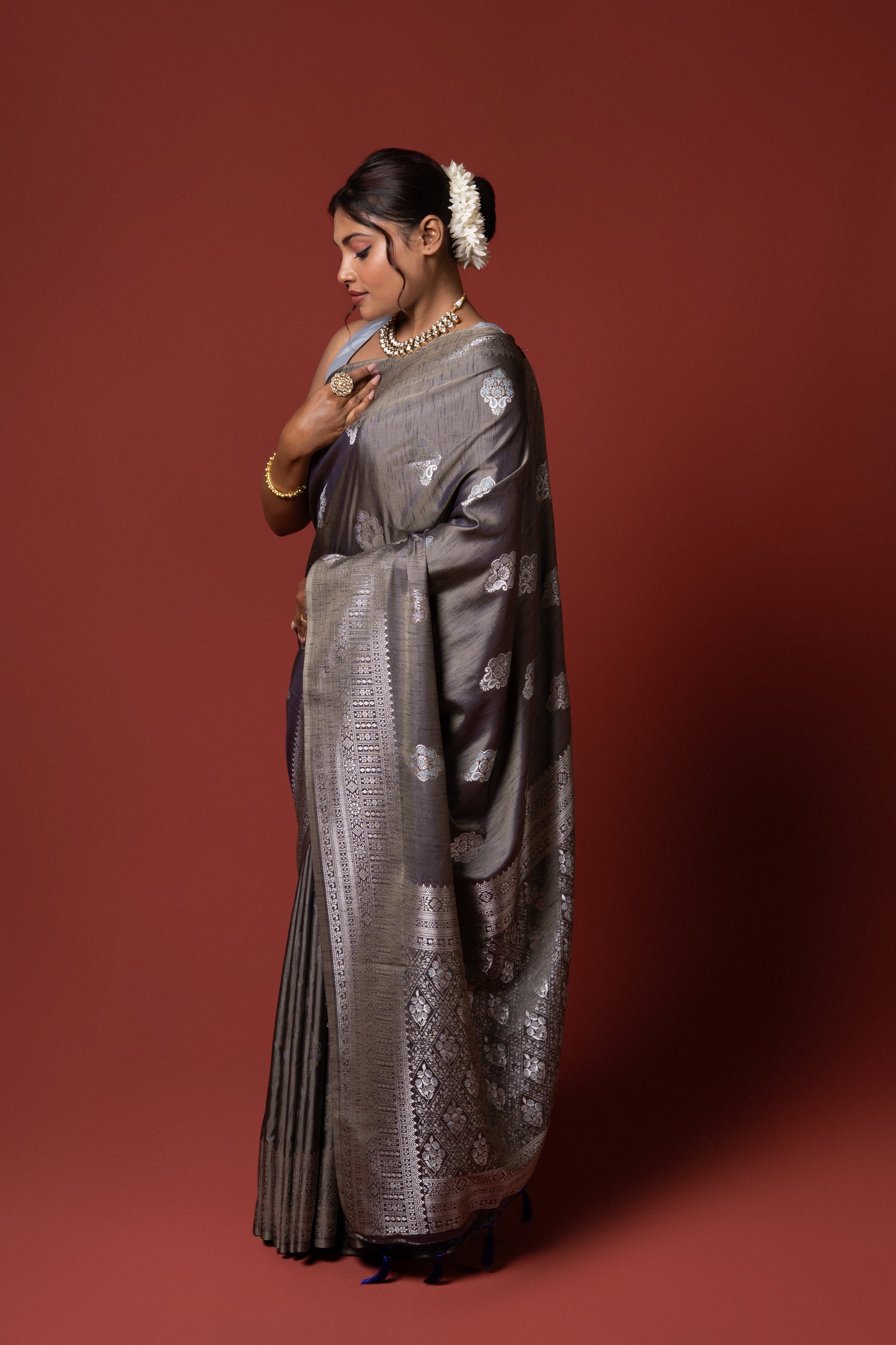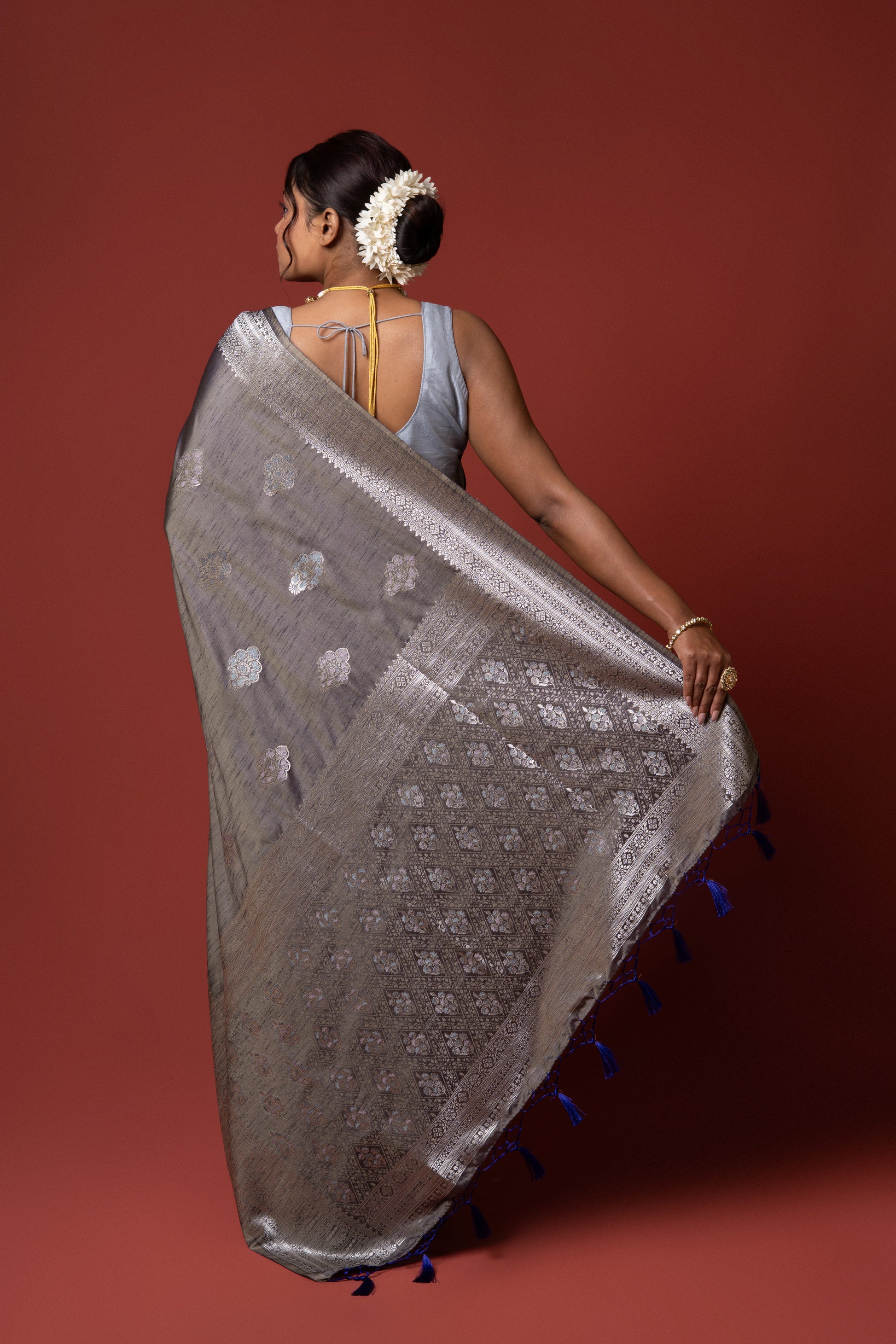 Elevate your wardrobe with our exclusive Grey Tissue Silk Saree. Featuring a beautiful Grey hue, this piece effortlessly blends timeless tradition with modern elegance. Ideal for festive occasions or everyday sophistication. Shop now and make it yours.