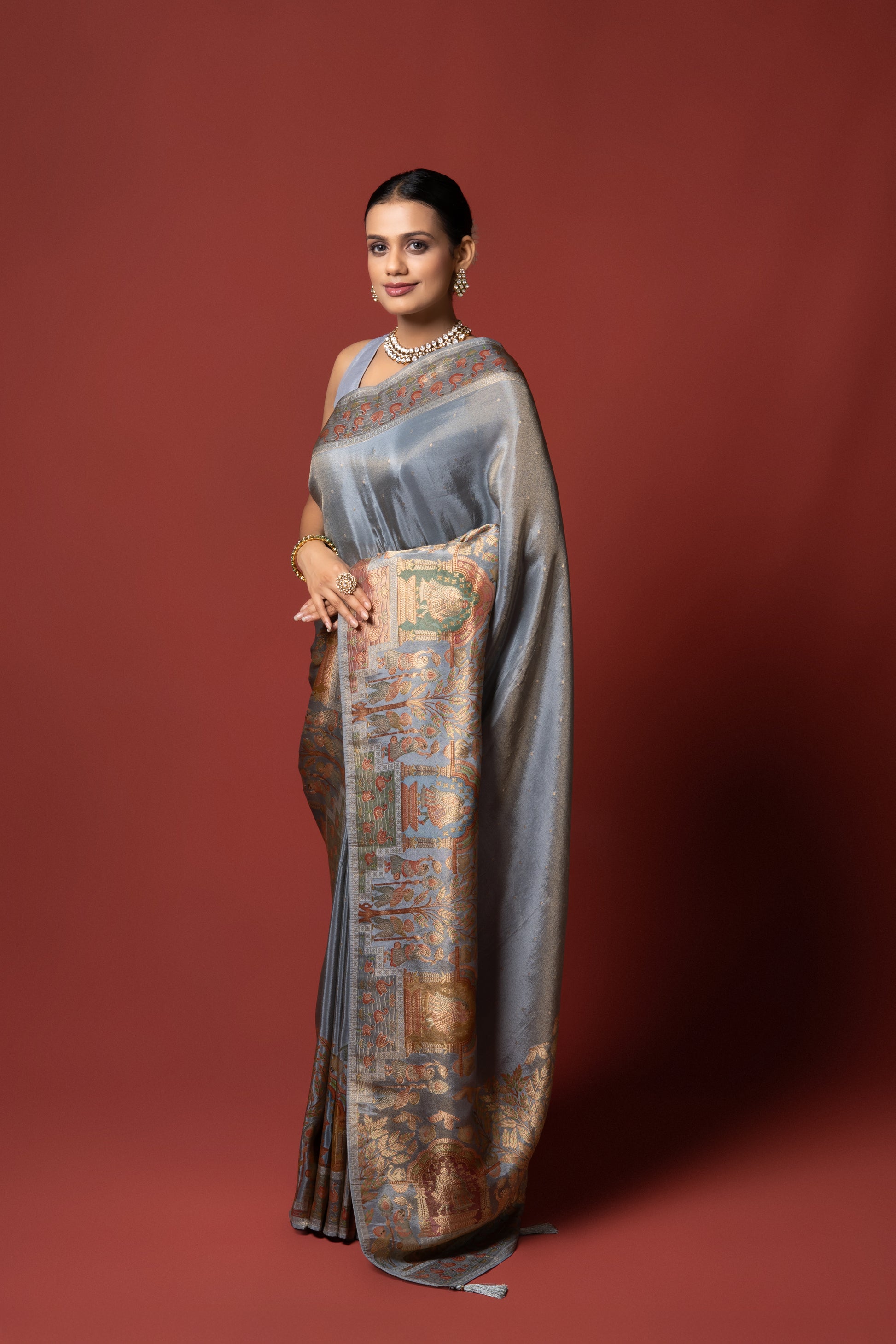 Paired with a matching grey blouse piece, this saree is perfect for puja ceremonies, weddings, and traditional celebrations, making it a versatile addition to your ethnic collection. Lightweight yet luxurious, it blends tradition with timeless elegance.