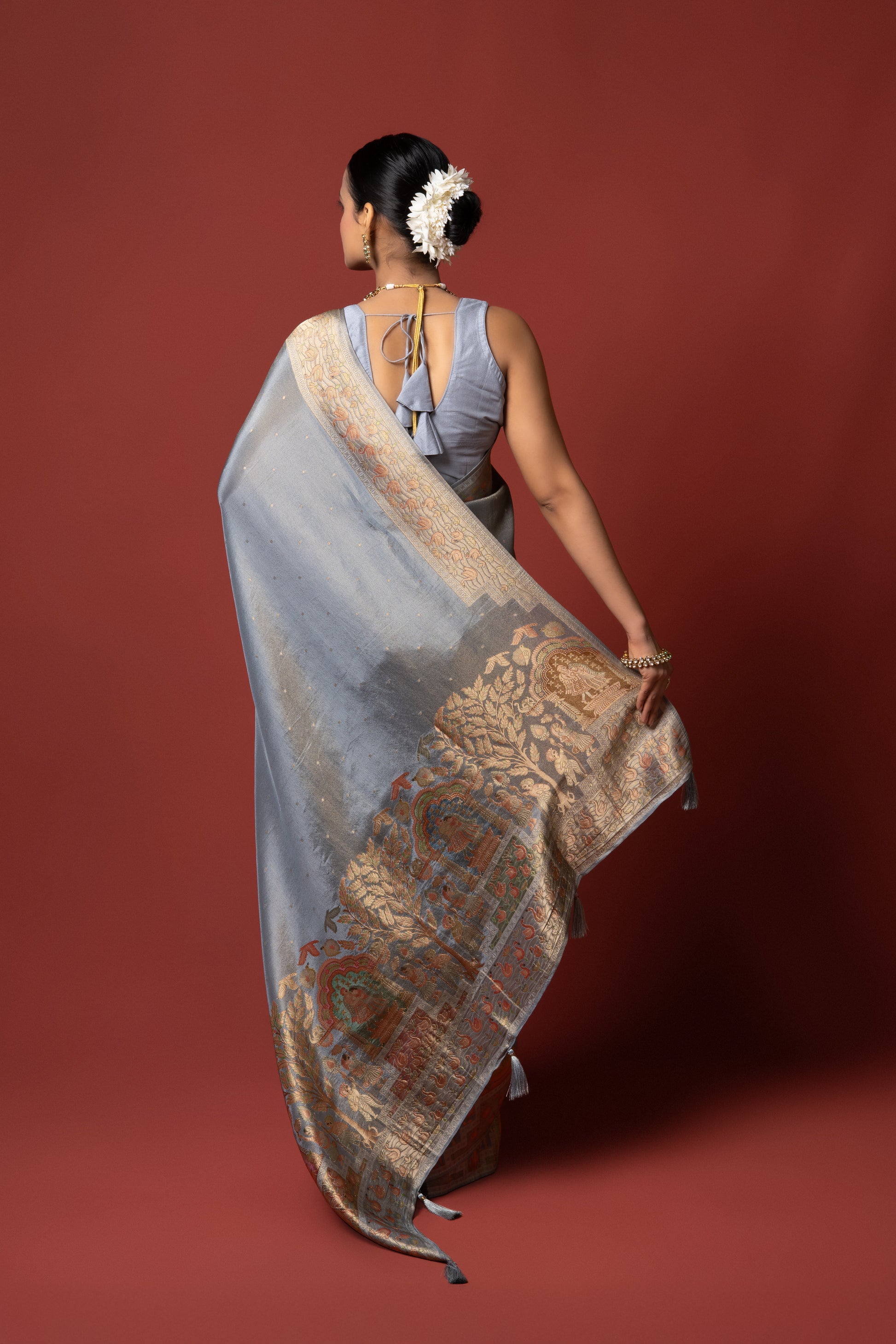 Elegant and sophisticated, this Grey Tussar Silk Saree from Hastakala Exclusive is designed to bring a touch of refined charm to every occasion. Crafted in Art Silk – Tussar Silk, the saree features a subtle grey base that drapes beautifully, enriched with delicate gold zari weaving for a graceful festive appeal.