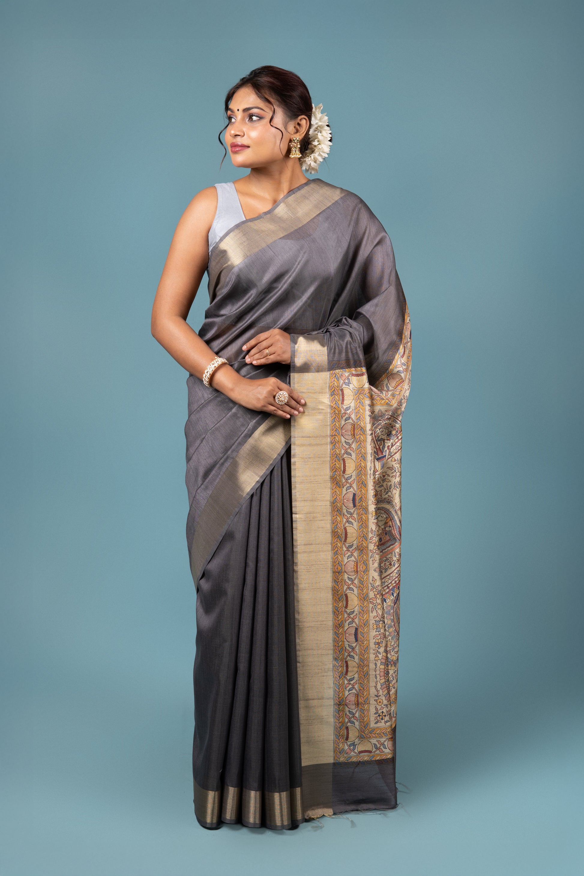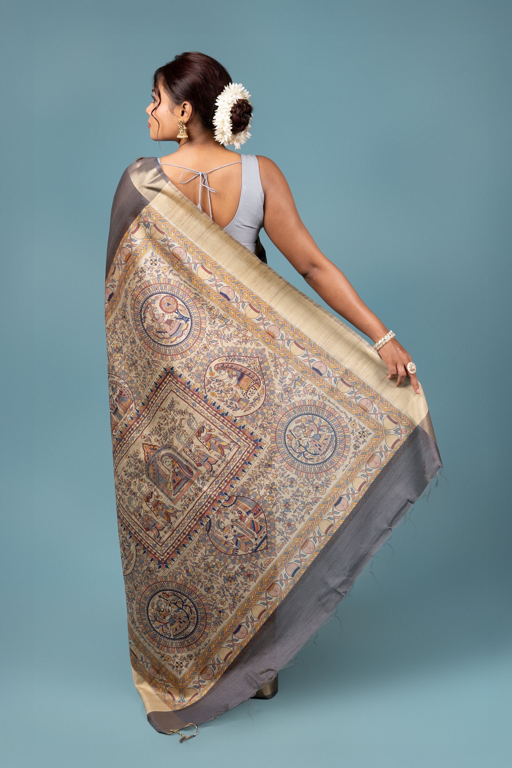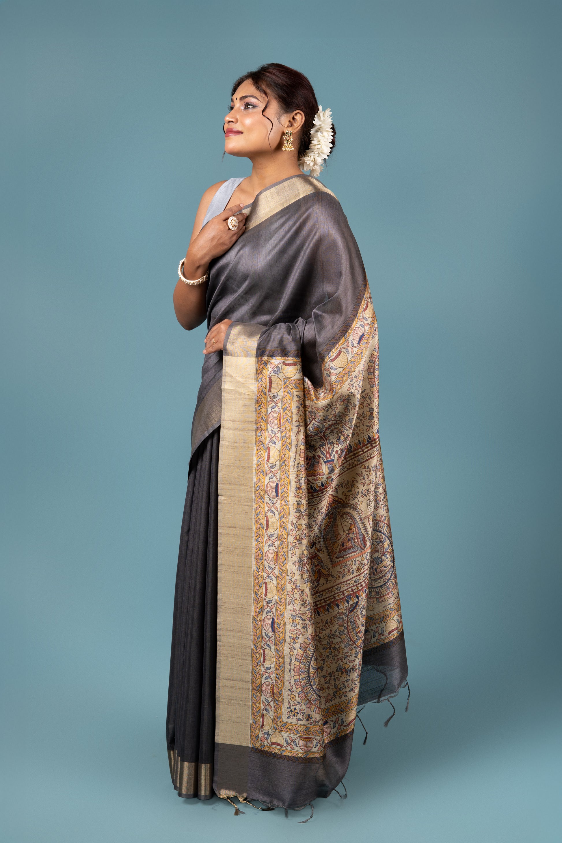 Elevate your wardrobe with our exclusive Grey Tussar Silk Saree with Madhubani Print. Featuring a beautiful Grey hue, this piece effortlessly blends timeless tradition with modern elegance. Ideal for festive occasions or everyday sophistication. Shop now and make it yours.