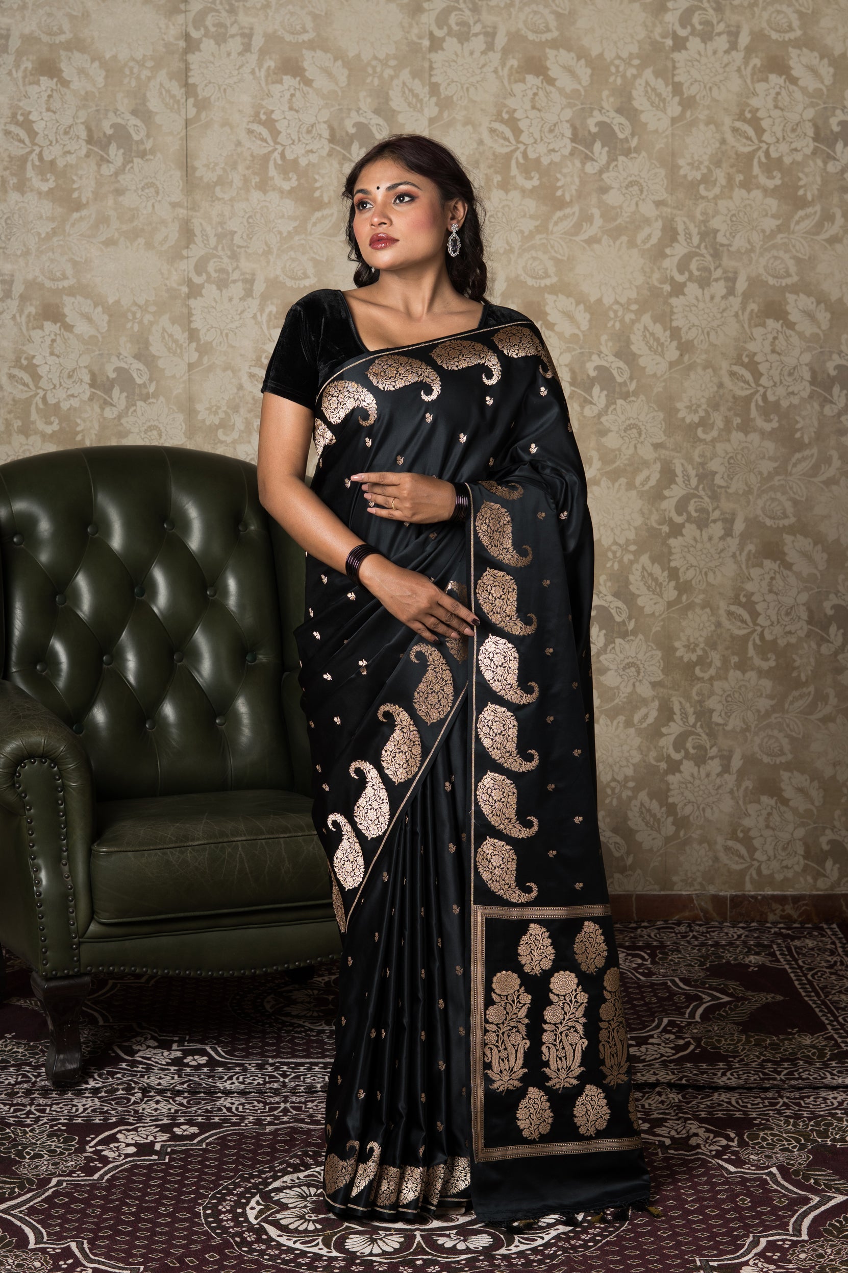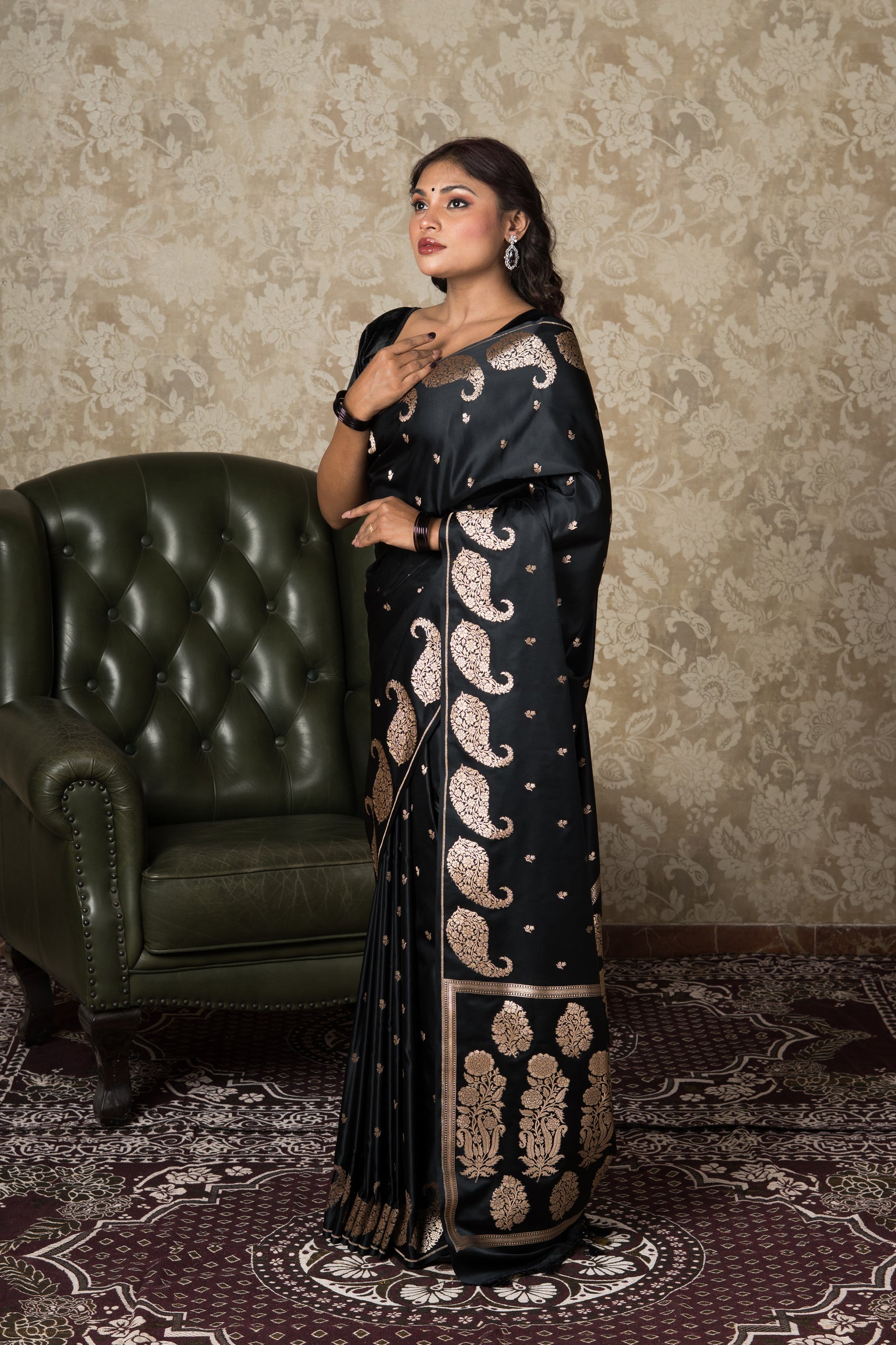 Elevate your wardrobe with our exclusive Jet Black Katan Silk Banarasi Saree. Featuring a beautiful Black hue, this piece effortlessly blends timeless tradition with modern elegance. Ideal for festive occasions or everyday sophistication. Shop now and make it yours.