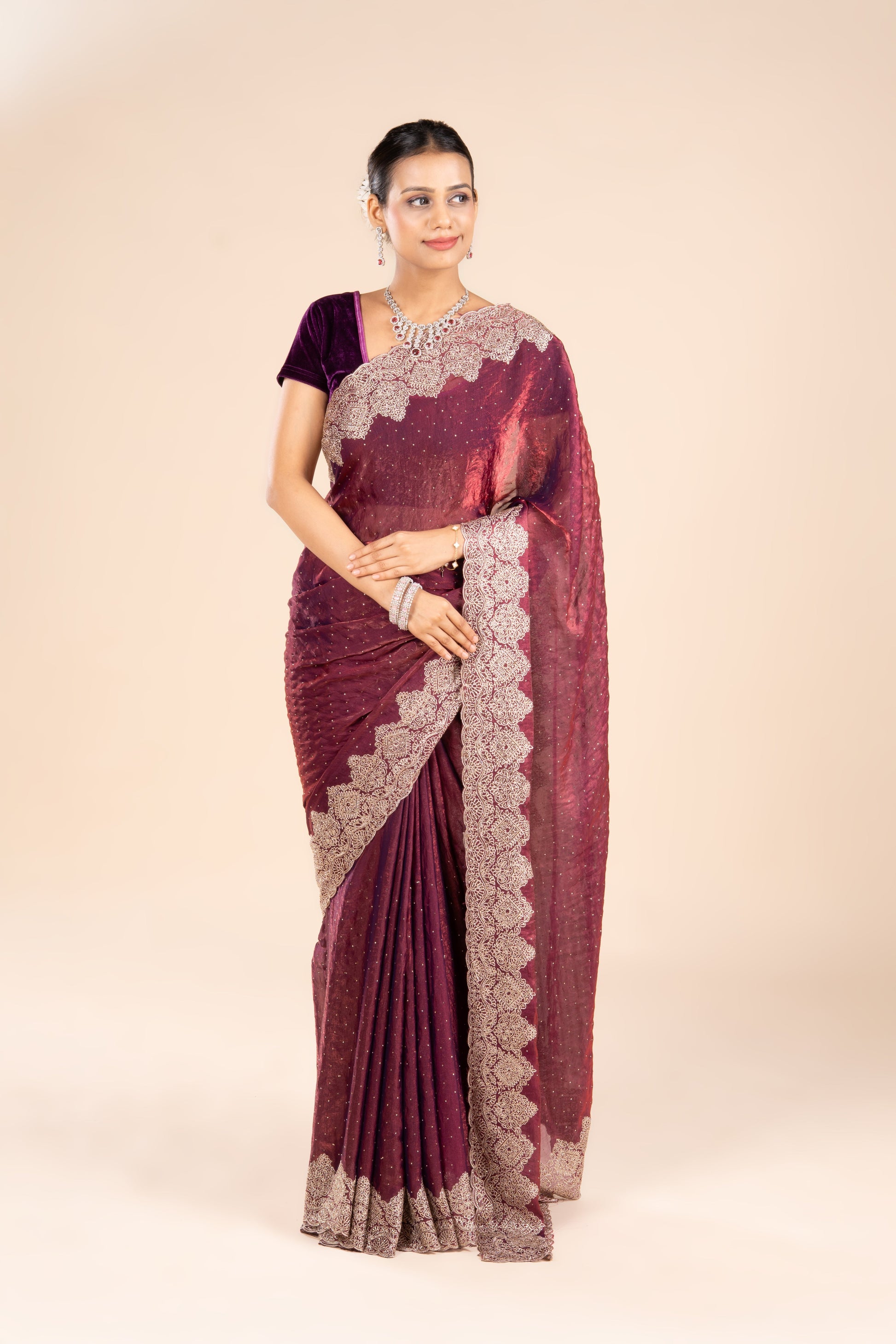 This Maroon Organza Saree with Swarowski work is a masterpiece that reflects timeless craftsmanship. Woven from premium fabrics, it offers a rich texture and graceful drape. An ideal pick for weddings, festive gatherings, or grand celebrations. Pair it with antique jewellery for a heritage-inspired look.