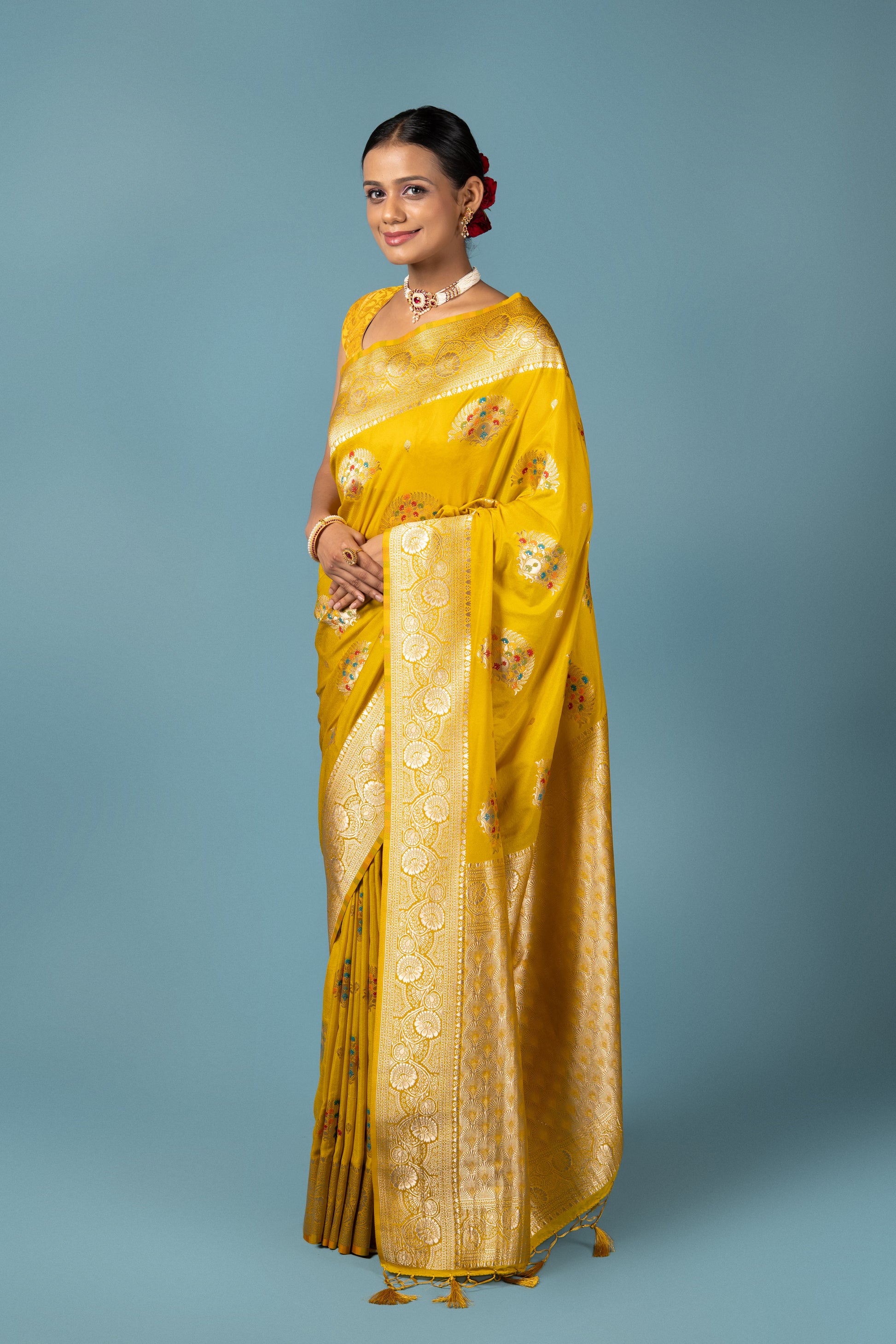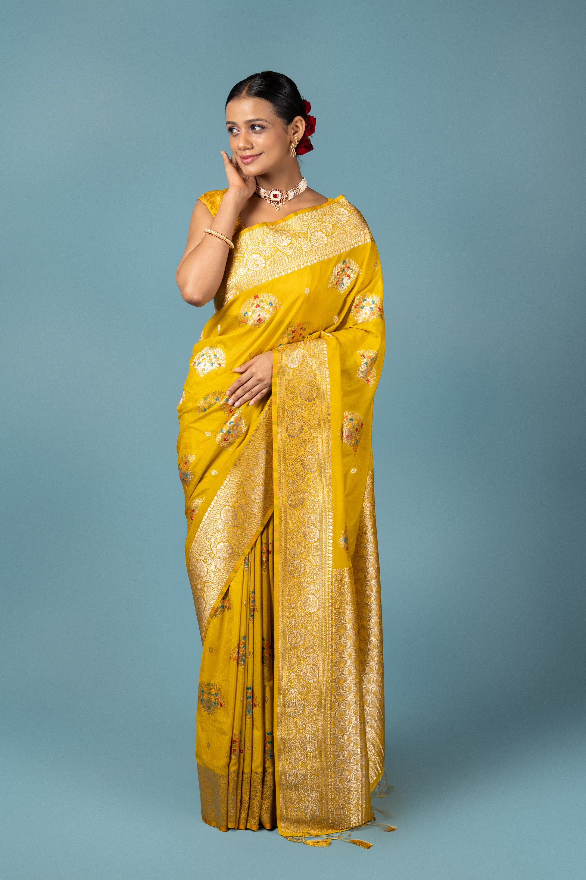 Bright and festive, this Mustard Yellow Georgette Banarasi Saree is a true celebration of elegance and tradition. Crafted from georgette, the saree drapes effortlessly with a fluid fall, while the vibrant mustard yellow base adds a lively charm. Intricate gold zari weaving enhances its Banarasi richness, making it perfect for auspicious occasions.