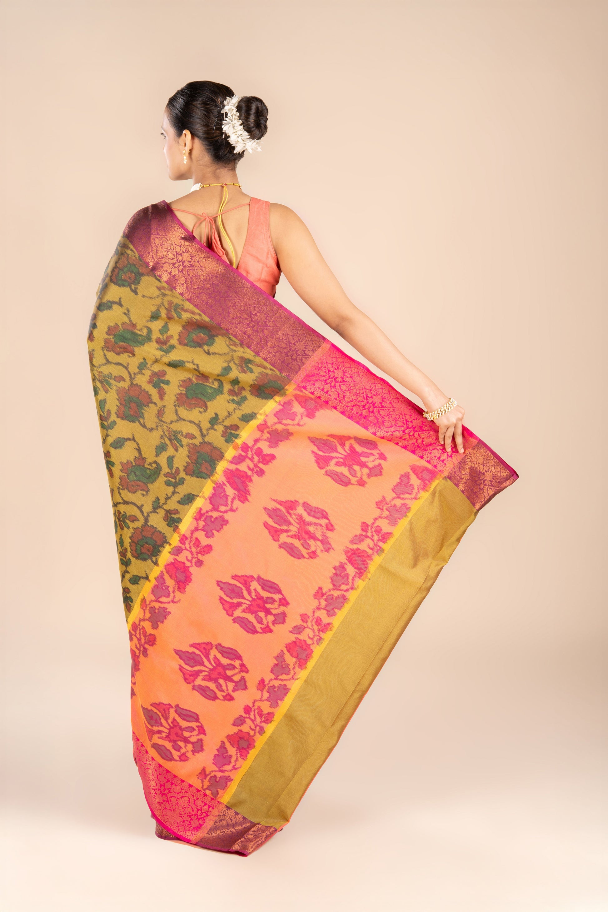 Perfectly crafted for special occasions, this Olive Green Katan Silk Patola Saree is a true delight. Every thread speaks of tradition while ensuring a modern appeal. Ideal for marking life’s most memorable moments in style. Keep it chic with delicate jewellery for subtle sophistication.