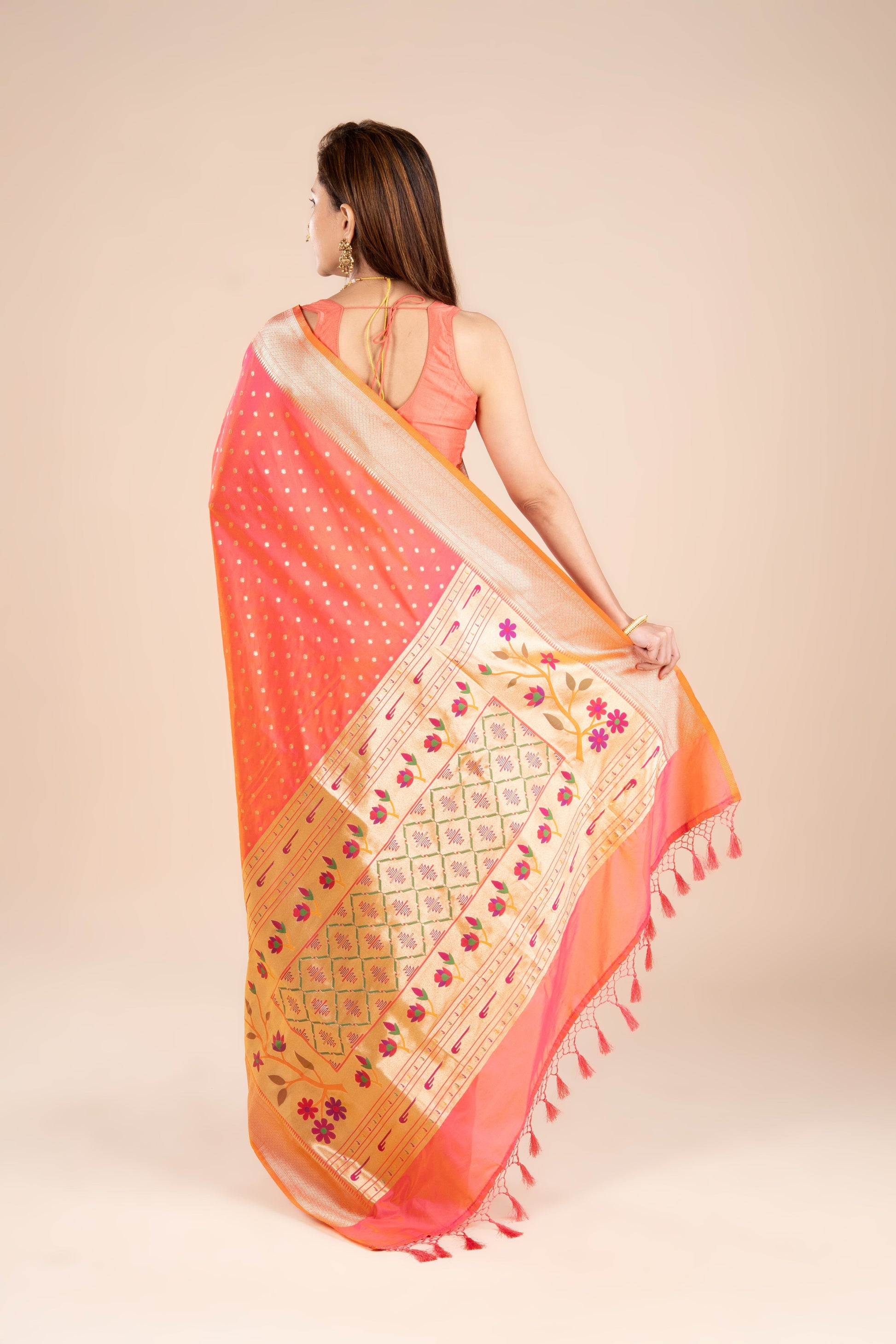 Discover elegance redefined with this Orange Katan Silk Banarasi Saree. Skillfully designed, its texture brings out richness in every fold. An outfit that transitions beautifully from daytime rituals to evening galas. Elevate the look with temple jewellery for traditional grace.