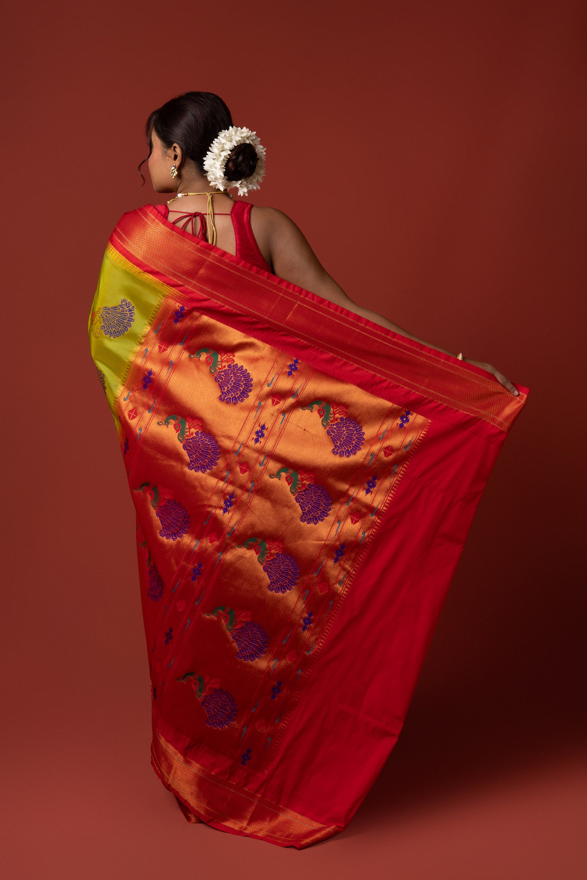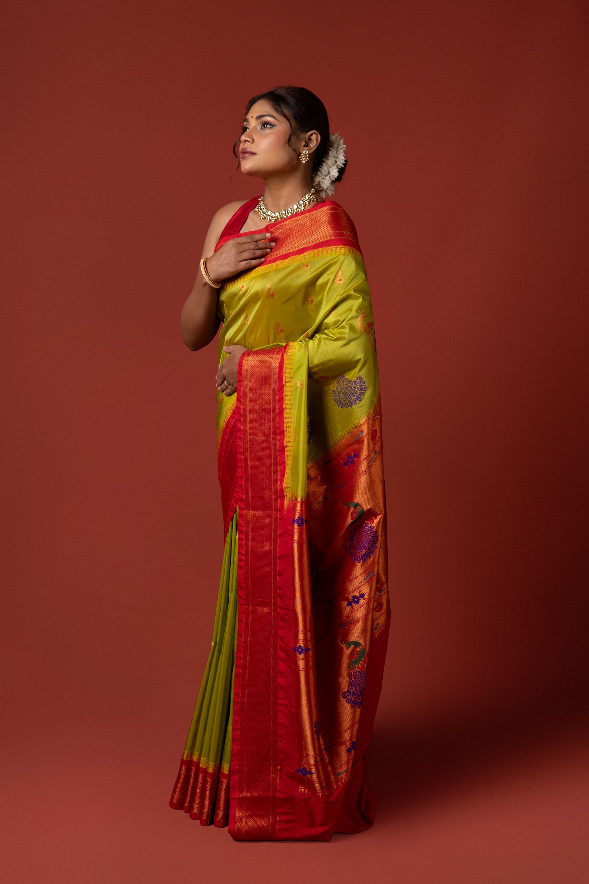 Elevate your wardrobe with our exclusive Parrot Green Apurva Silk Paithani Saree. Featuring a beautiful Parrot Green hue, this piece effortlessly blends timeless tradition with modern elegance. Ideal for festive occasions or everyday sophistication. Shop now and make it yours.