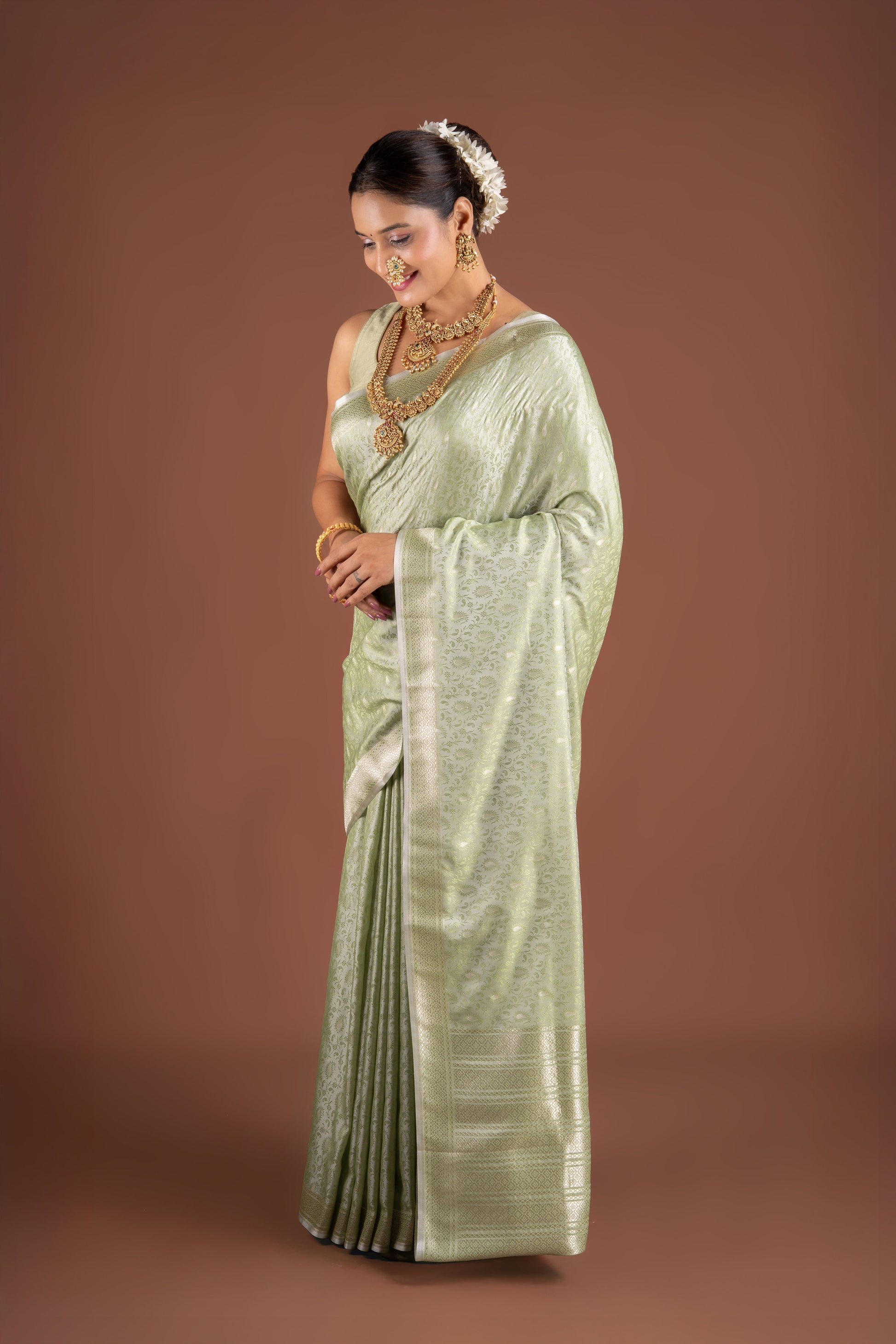Wrap yourself in elegance with the beautifully crafted Pastel Green Katan Silk Tanchoi Saree. Crafted with precision, its fabric ensures comfort without compromising on style. Perfect for temple visits, family functions, and seasonal festivities. Style it with gold ornaments to highlight its festive charm.